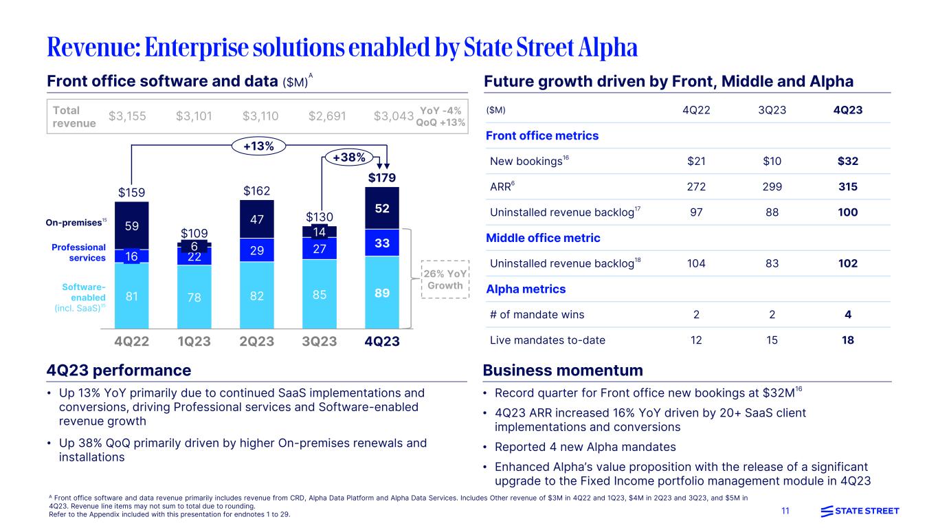 10 A These are non-GAAP presentations; refer to the Appendix for a reconciliation of ex-notable items/currency translation and further explanations of non-GAAP measures. Refer to the Appendix included with this presentation for endnotes 1 to 29. Markets, Software & processing, and Other fees (Ex-notable items, non-GAAP, $M)A 45 58 44 33 216 165 221 188 237 103 109 117 103 97 344 342 303 313 307 18 4Q22 1Q23 2Q23 3Q23 4Q23 $681 $661 $699 $648 $674 FX trading12 Securities finance Software & processing (11)% (6)% +10% YoY % Other fees13 nm • FX trading services of $307M – Down (11)% YoY mainly due to lower spreads associated with subdued FX volatility, partially offset by higher volumes – Down (2)% QoQ primarily reflecting lower Direct FX revenues driven by muted volatility • Securities finance of $97M – Down (6)% YoY mainly due to lower Agency balances, partially offset by higher Agency spreads and Prime Services revenue – Down (6)% QoQ primarily due to lower spreads • Software and processing fees of $237M – Up 10% YoY mainly driven by higher Front office software and data revenue associated with CRD – Up 26% QoQ primarily due to On-premises renewals in Front office software and data • Other fee revenue of $33M13 – Increased $15M YoY primarily due to a tax credit investment accounting change, partially offset by the impact of the Argentine peso devaluation14 – Decreased $(11)M QoQ primarily driven by the impact of the Argentine peso devaluation, partially offset by higher market-related adjustments $3,155 $3,101 $3,110 $2,691 $3,043 YoY -4% QoQ +13% Total Revenue (GAAP) 4Q23 performance