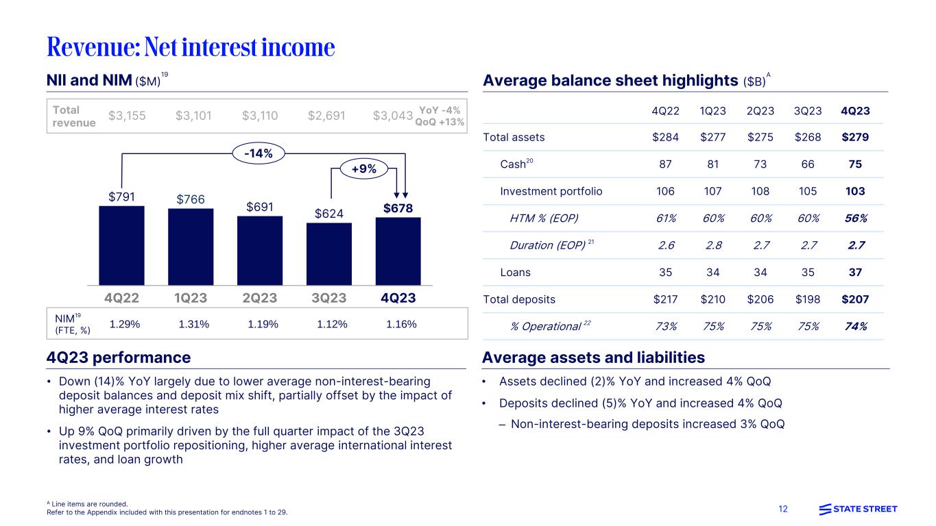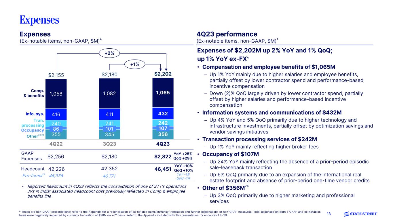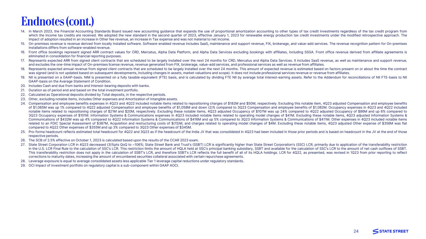 24 14. In March 2023, the Financial Accounting Standards Board issued new accounting guidance that expands the use of proportional amortization accounting to other types of tax credit investments regardless of the tax credit program from which the income tax credits are received. We adopted the new standard in the second quarter of 2023, effective January 1, 2023 for renewable energy production tax credit investments under the modified retrospective approach. The impact of adoption resulted in an increase in Other fee revenue, an increase in Tax expense and was not material to net income. 15. On-premises revenue is revenue derived from locally installed software. Software-enabled revenue includes SaaS, maintenance and support revenue, FIX, brokerage, and value-add services. The revenue recognition pattern for On-premises installations differs from software-enabled revenue. 16. Front office bookings represent signed ARR contract values for CRD, Mercatus, Alpha Data Platform, and Alpha Data Services excluding bookings with affiliates, including SSGA. Front office revenue derived from affiliate agreements is eliminated in consolidation for financial reporting purposes. 17. Represents expected ARR from signed client contracts that are scheduled to be largely installed over the next 24 months for CRD, Mercatus and Alpha Data Services. It includes SaaS revenue, as well as maintenance and support revenue, and excludes the one-time impact of On-premises license revenue, revenue generated from FIX, brokerage, value-add services, and professional services as well as revenue from affiliates. 18. Represents expected annual revenue from signed client contracts that are scheduled to be largely installed over the next 24 months. This amount of expected revenue is estimated based on factors present on or about the time the contract was signed (and is not updated based on subsequent developments, including changes in assets, market valuations and scope). It does not include professional services revenue or revenue from affiliates. 19. NII is presented on a GAAP-basis. NIM is presented on a fully taxable-equivalent (FTE) basis, and is calculated by dividing FTE NII by average total interest-earning assets. Refer to the Addendum for reconciliations of NII FTE-basis to NII GAAP-basis on the Average Statement of Condition. 20. Includes Cash and due from banks and Interest-bearing deposits with banks. 21. Duration as of period end and based on the total investment portfolio. 22. Calculated as Operational deposits divided by Total deposits, in the respective periods. 23. Other, excluding notable items, includes Other expenses and Amortization of intangible assets. 24. Compensation and employee benefits expenses in 4Q23 and 4Q22 included notable items related to repositioning charges of $182M and $50M, respectively. Excluding this notable item, 4Q23 adjusted Compensation and employee benefits of $1,065M was up 1% compared to 4Q22 adjusted Compensation and employee benefits of $1,058M and down (2)% compared to 3Q23 Compensation and employee benefits of $1,082M. Occupancy expenses in 4Q23 and 4Q22 included notable items related to repositioning charges of $21M and $20M, respectively. Excluding these notable items, 4Q23 adjusted Occupancy of $107M was up 24% compared to 4Q22 adjusted Occupancy of $86M and up 6% compared to 3Q23 Occupancy expenses of $101M. Information Systems & Communications expenses in 4Q23 included notable items related to operating model changes of $41M. Excluding these notable items, 4Q23 adjusted Information Systems & Communications of $432M was up 4% compared to 4Q22 Information Systems & Communications of $416M and up 5% compared to 3Q23 Information Systems & Communications of $411M. Other expenses in 4Q23 included notable items related to an FDIC Special Assessment of $387M, Acquisition and restructuring costs of $(15)M, and charges related to operating model changes of $4M. Excluding these notable items, 4Q23 adjusted Other expense of $356M was flat compared to 4Q22 Other expenses of $355M and up 3% compared to 3Q23 Other expenses of $345M. 25. Pro-forma headcount reflects estimated total headcount for 4Q22 and 3Q23 as if the headcount of the India JV that was consolidated in 4Q23 had been included in those prior periods and is based on headcount in the JV at the end of those respective periods. 26. The SCB of 2.5% effective on October 1, 2023 is calculated based upon the results of the CCAR 2023 exam. 27. State Street Corporation LCR in 4Q23 decreased (3)%pts QoQ to ~106%; State Street Bank and Trust's (SSBT) LCR is significantly higher than State Street Corporation's (SSC) LCR, primarily due to application of the transferability restriction in the U.S. LCR Final Rule to the calculation of SSC’s LCR. This restriction limits the amount of HQLA held at SSC’s principal banking subsidiary, SSBT and available for the calculation of SSC’s LCR to the amount of net cash outflows of SSBT. This transferability restriction does not apply in the calculation of SSBT’s LCR, and therefore SSBT’s LCR reflects the full benefit of all of its HQLA holdings. LCR for 4Q22, as presented, was revised in 1Q23 from prior reporting to reflect corrections to maturity dates, increasing the amount of encumbered securities collateral associated with certain repurchase agreements. 28. Leverage exposure is equal to average consolidated assets less applicable Tier 1 leverage capital reductions under regulatory standards. 29. OCI impact of investment portfolio on regulatory capital is a sub-component within GAAP AOCI.