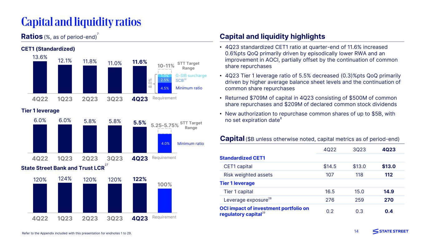 13 $2,256 $2,180 $2,822 42,226 46,936 42,352 46,771 46,451 Expenses of $2,202M up 2% YoY and 1% QoQ; up 1% YoY ex-FXA • Compensation and employee benefits of $1,065M – Up 1% YoY mainly due to higher salaries and employee benefits, partially offset by lower contractor spend and performance-based incentive compensation – Down (2)% QoQ largely driven by lower contractor spend, partially offset by higher salaries and performance-based incentive compensation • Information systems and communications of $432M – Up 4% YoY and 5% QoQ primarily due to higher technology and infrastructure investments, partially offset by optimization savings and vendor savings initiatives • Transaction processing services of $242M – Up 1% YoY mainly reflecting higher broker fees • Occupancy of $107M – Up 24% YoY mainly reflecting the absence of a prior-period episodic sale-leaseback transaction – Up 6% QoQ primarily due to an expansion of the international real estate footprint and absence of prior-period one-time vendor credits • Other of $356M24 – Up 3% QoQ primarily due to higher marketing and professional services GAAP Expenses Headcount 355 345 356 240 241 242 416 411 432 1,058 1,082 1,065 4Q22 3Q23 4Q23 $2,155 $2,180 $2,202 A These are non-GAAP presentations; refer to the Appendix for a reconciliation of ex-notable items/currency translation and further explanations of non-GAAP measures. Total expenses on both a GAAP and ex-notables basis were negatively impacted by currency translation of $26M on YoY basis. Refer to the Appendix included with this presentation for endnotes 1 to 29. Comp. & benefits Info. sys. Tran. processing Other23,24 Occupancy 10710186 YoY +25% QoQ +29% +2% +1% YoY +10% QoQ +10% Expenses (Ex-notable items, non-GAAP, $M)A 4Q23 performance (Ex-notable items, non-GAAP, $M)A • Reported headcount in 4Q23 reflects the consolidation of one of STT’s operations JVs in India; associated headcount cost previously reflected in Comp & employee benefits line Pro-forma25 YoY -1% QoQ -1%