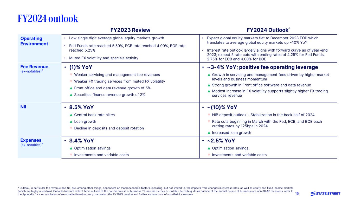 14 Capital and liquidity highlights Capital ($B unless otherwise noted, capital metrics as of period-end) 4Q22 3Q23 4Q23 Standardized CET1 CET1 capital $14.5 $13.0 $13.0 Risk weighted assets 107 118 112 Tier 1 leverage Tier 1 capital 16.5 15.0 14.9 Leverage exposure28 276 259 270 OCI impact of investment portfolio on regulatory capital29 0.2 0.3 0.4 Tier 1 leverage 6.0% 6.0% 5.8% 5.8% 5.5% 4Q22 1Q23 2Q23 3Q23 4Q23 Minimum ratio4.0% STT Target Range5.25-5.75% • 4Q23 standardized CET1 ratio at quarter-end of 11.6% increased 0.6%pts QoQ primarily driven by episodically lower RWA and an improvement in AOCI, partially offset by the continuation of common share repurchases • 4Q23 Tier 1 leverage ratio of 5.5% decreased (0.3)%pts QoQ primarily driven by higher average balance sheet levels and the continuation of common share repurchases • Returned $709M of capital in 4Q23 consisting of $500M of common share repurchases and $209M of declared common stock dividends • New authorization to repurchase common shares of up to $5B, with no set expiration date8 Refer to the Appendix included with this presentation for endnotes 1 to 29. CET1 (Standardized) 13.6% 12.1% 11.8% 11.0% 11.6% 4.5% 2.5% 4Q22 1Q23 2Q23 3Q23 4Q23 SCB26 Minimum ratio8 .0 % 10-11% G-SIB surcharge1.0% Ratios (%, as of period-end) 7 State Street Bank and Trust LCR 27 Requirement Requirement Requirement 120% 124% 120% 120% 122% 100% 4Q22 1Q23 2Q23 3Q23 4Q23 STT Target Range