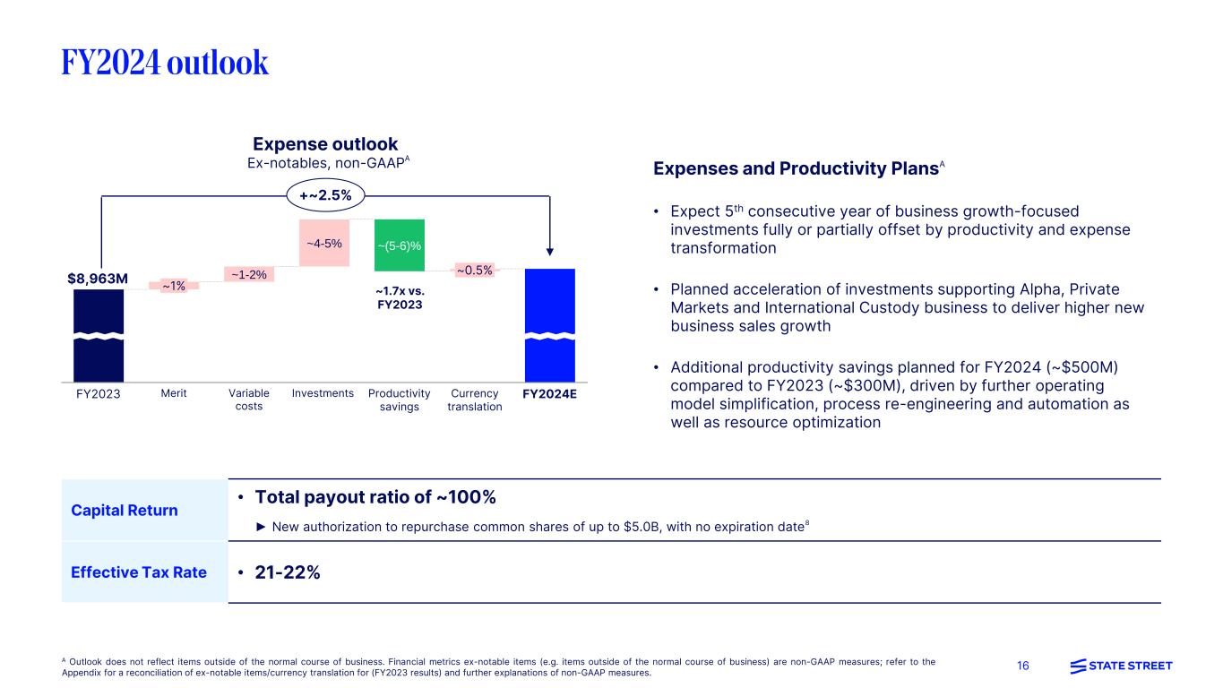 15 FY2023 Review FY2024 OutlookA Operating Environment • Low single digit average global equity markets growth • Fed Funds rate reached 5.50%, ECB rate reached 4.00%, BOE rate reached 5.25% • Muted FX volatility and specials activity • Expect global equity markets flat to December 2023 EOP which translates to average global equity markets up ~10% YoY • Interest rate outlook largely aligns with forward curve as of year-end 2023; expect 5 rate cuts with ending rates of 4.25% for Fed Funds, 2.75% for ECB and 4.00% for BOE Fee Revenue (ex-notables)B • (1)% YoY ▼ Weaker servicing and management fee revenues ▼ Weaker FX trading services from muted FX volatility ▲ Front office and data revenue growth of 5% ▲ Securities finance revenue growth of 2% • ~3-4% YoY; positive fee operating leverage ▲ Growth in servicing and management fees driven by higher market levels and business momentum ▲ Strong growth in Front office software and data revenue ▲ Modest increase in FX volatility supports slightly higher FX trading services revenue NII • 8.5% YoY ▲ Central bank rate hikes ▲ Loan growth ▼ Decline in deposits and deposit rotation • ~(10)% YoY ▼ NIB deposit outlook – Stabilization in the back half of 2024 ▼ Rate cuts beginning in March with the Fed, ECB, and BOE each cutting rates by 125bps in 2024 ▲ Increased loan growth Expenses (ex-notables)B • 3.4% YoY ▲ Optimization savings ▼ Investments and variable costs • ~2.5% YoY ▲ Optimization savings ▼ Investments and variable costs A Outlook, in particular fee revenue and NII, are, among other things, dependent on macroeconomic factors, including, but not limited to, the impacts from changes in interest rates, as well as equity and fixed income markets (which are highly uncertain). Outlook does not reflect items outside of the normal course of business. B Financial metrics ex-notable items (e.g. items outside of the normal course of business) are non-GAAP measures; refer to the Appendix for a reconciliation of ex-notable items/currency translation (for FY2023 results) and further explanations of non-GAAP measures.