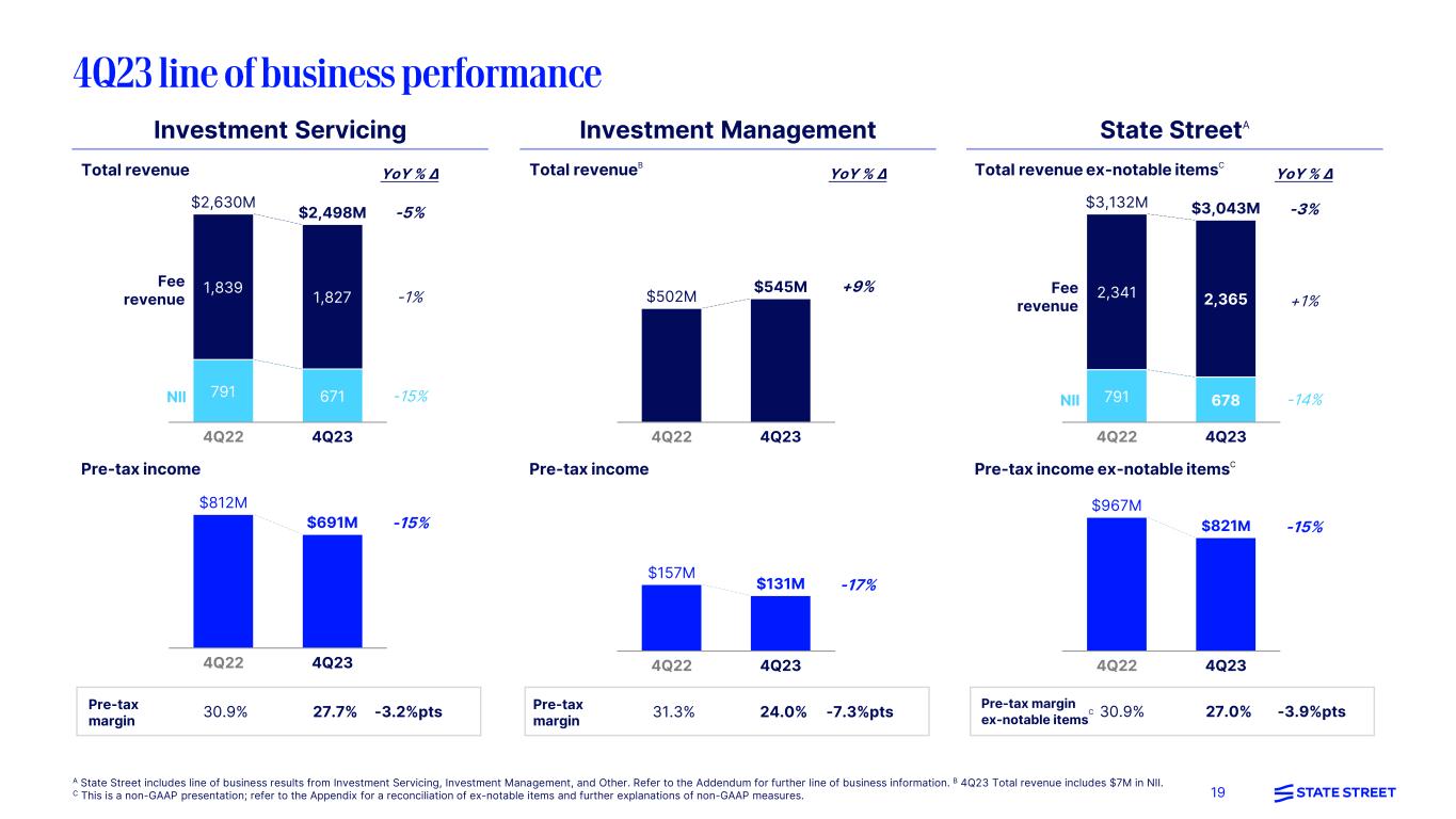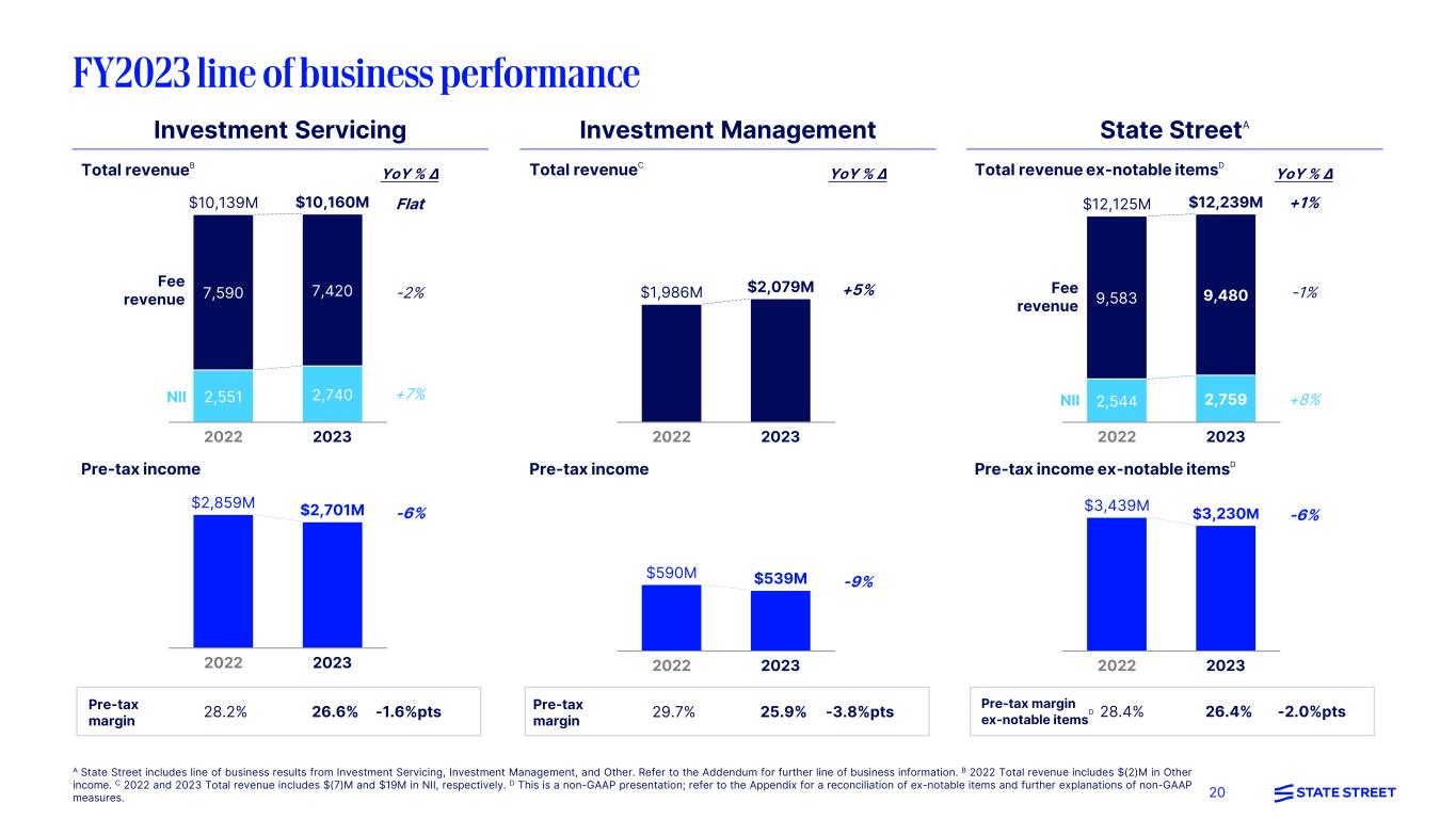 19 1,827 State StreetAInvestment Servicing Total revenue 791 671 1,839 , 4Q22 4Q23 $2,630M $2,498M Pre-tax income Fee revenue NII Pre-tax margin 30.9% 27.7% -3.2%pts YoY % ∆ -1% -15% -5% -15% Investment Management Total revenueB 4Q22 4Q23 $502M $545M Pre-tax income Pre-tax margin 31.3% 24.0% -7.3%pts 4Q22 4Q23 $157M $131M YoY % ∆ +9% -17% Total revenue ex-notable itemsC 791 678 2,341 2,365 4Q22 4Q23 $3,132M $3,043M Pre-tax income ex-notable itemsC Fee revenue NII Pre-tax margin ex-notable items C 30.9% 27.0% -3.9%pts YoY % ∆ +1% -14% -3% -15% A State Street includes line of business results from Investment Servicing, Investment Management, and Other. Refer to the Addendum for further line of business information. B 4Q23 Total revenue includes $7M in NII. C This is a non-GAAP presentation; refer to the Appendix for a reconciliation of ex-notable items and further explanations of non-GAAP measures. 4Q22 4Q23 $812M $691M 4Q22 4Q23 $967M $821M