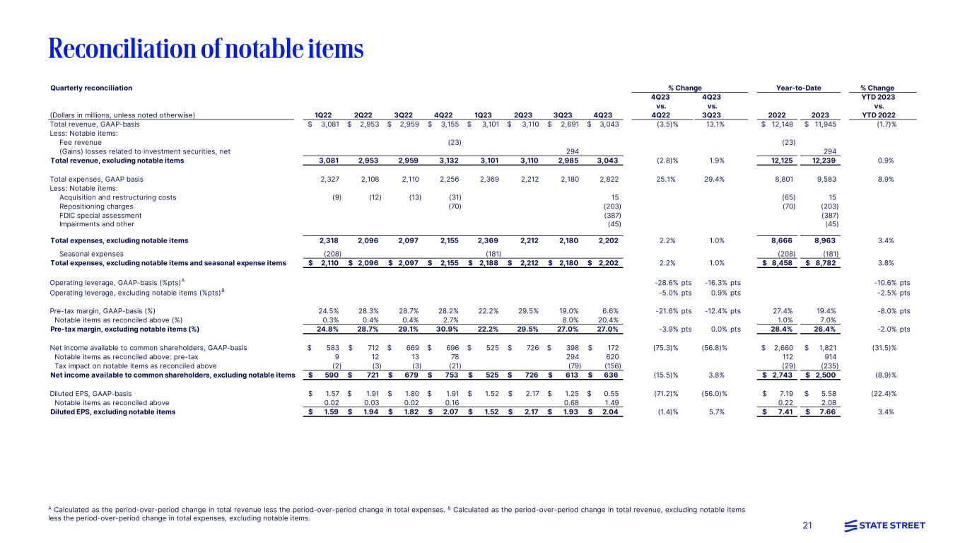 20 7,420 State StreetAInvestment Servicing Total revenueB 2,551 2,740 7,590 7,420 2022 2023 $10,139M $10,160M Pre-tax income Fee revenue NII Pre-tax margin 28.2% 26.6% -1.6%pts YoY % ∆ -2% +7% Flat -6% Investment Management Total revenueC 2022 2023 $1,986M $2,079M Pre-tax income Pre-tax margin 29.7% 25.9% -3.8%pts 2022 2023 $590M $539M YoY % ∆ +5% -9% Total revenue ex-notable itemsD 2,544 2,759 9,583 9,480 2022 2023 $12,125M $12,239M Pre-tax income ex-notable itemsD Fee revenue NII Pre-tax margin ex-notable items D 28.4% 26.4% -2.0%pts YoY % ∆ -1% +8% +1% -6% A State Street includes line of business results from Investment Servicing, Investment Management, and Other. Refer to the Addendum for further line of business information. B 2022 Total revenue includes $(2)M in Other income. C 2022 and 2023 Total revenue includes $(7)M and $19M in NII, respectively. D This is a non-GAAP presentation; refer to the Appendix for a reconciliation of ex-notable items and further explanations of non-GAAP measures. 2022 2023 $2,859M $2,701M 2022 2023 $3,439M $3,230M