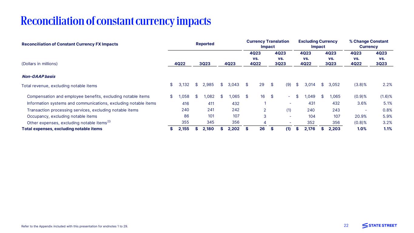 22Refer to the Appendix included with this presentation for endnotes 1 to 29. Reconciliation of Constant Currency FX Impacts (Dollars in millions) 4Q22 3Q23 4Q23 4Q23 vs. 4Q22 4Q23 vs. 3Q23 4Q23 vs. 4Q22 4Q23 vs. 3Q23 4Q23 vs. 4Q22 4Q23 vs. 3Q23 Non-GAAP basis Total revenue, excluding notable items $ 3,132 $ 2,985 $ 3,043 $ 29 $ (9) $ 3,014 $ 3,052 (3.8)% 2.2% Compensation and employee benefits, excluding notable items $ 1,058 $ 1,082 $ 1,065 $ 16 $ - $ 1,049 $ 1,065 (0.9)% (1.6)% Information systems and communications, excluding notable items 416 411 432 1 - 431 432 3.6% 5.1% Transaction processing services, excluding notable items 240 241 242 2 (1) 240 243 - 0.8% Occupancy, excluding notable items 86 101 107 3 - 104 107 20.9% 5.9% Other expenses, excluding notable items23 355 345 356 4 - 352 356 (0.8)% 3.2% Total expenses, excluding notable items $ 2,155 $ 2,180 $ 2,202 $ 26 $ (1) $ 2,176 $ 2,203 1.0% 1.1% Reported Currency Translation Impact Excluding Currency Impact % Change Constant Currency