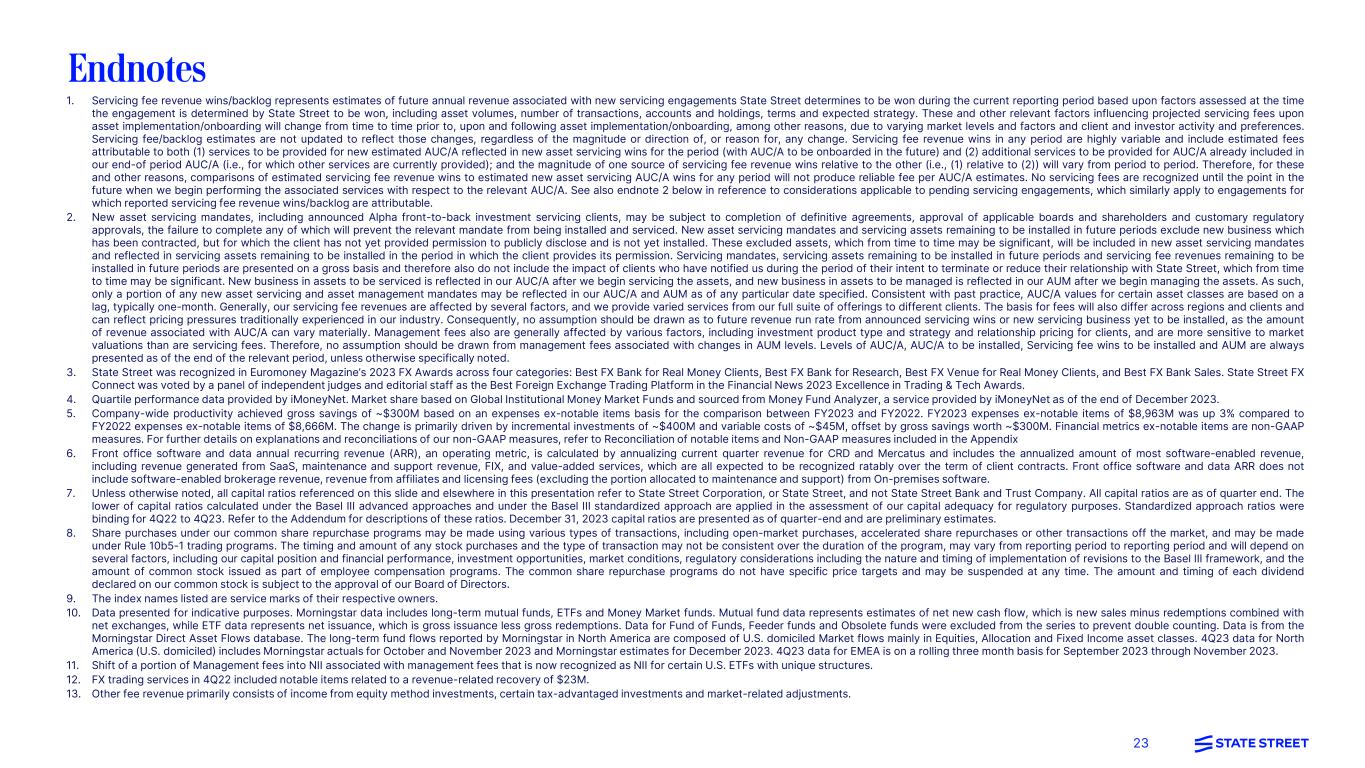 23 1. Servicing fee revenue wins/backlog represents estimates of future annual revenue associated with new servicing engagements State Street determines to be won during the current reporting period based upon factors assessed at the time the engagement is determined by State Street to be won, including asset volumes, number of transactions, accounts and holdings, terms and expected strategy. These and other relevant factors influencing projected servicing fees upon asset implementation/onboarding will change from time to time prior to, upon and following asset implementation/onboarding, among other reasons, due to varying market levels and factors and client and investor activity and preferences. Servicing fee/backlog estimates are not updated to reflect those changes, regardless of the magnitude or direction of, or reason for, any change. Servicing fee revenue wins in any period are highly variable and include estimated fees attributable to both (1) services to be provided for new estimated AUC/A reflected in new asset servicing wins for the period (with AUC/A to be onboarded in the future) and (2) additional services to be provided for AUC/A already included in our end-of period AUC/A (i.e., for which other services are currently provided); and the magnitude of one source of servicing fee revenue wins relative to the other (i.e., (1) relative to (2)) will vary from period to period. Therefore, for these and other reasons, comparisons of estimated servicing fee revenue wins to estimated new asset servicing AUC/A wins for any period will not produce reliable fee per AUC/A estimates. No servicing fees are recognized until the point in the future when we begin performing the associated services with respect to the relevant AUC/A. See also endnote 2 below in reference to considerations applicable to pending servicing engagements, which similarly apply to engagements for which reported servicing fee revenue wins/backlog are attributable. 2. New asset servicing mandates, including announced Alpha front-to-back investment servicing clients, may be subject to completion of definitive agreements, approval of applicable boards and shareholders and customary regulatory approvals, the failure to complete any of which will prevent the relevant mandate from being installed and serviced. New asset servicing mandates and servicing assets remaining to be installed in future periods exclude new business which has been contracted, but for which the client has not yet provided permission to publicly disclose and is not yet installed. These excluded assets, which from time to time may be significant, will be included in new asset servicing mandates and reflected in servicing assets remaining to be installed in the period in which the client provides its permission. Servicing mandates, servicing assets remaining to be installed in future periods and servicing fee revenues remaining to be installed in future periods are presented on a gross basis and therefore also do not include the impact of clients who have notified us during the period of their intent to terminate or reduce their relationship with State Street, which from time to time may be significant. New business in assets to be serviced is reflected in our AUC/A after we begin servicing the assets, and new business in assets to be managed is reflected in our AUM after we begin managing the assets. As such, only a portion of any new asset servicing and asset management mandates may be reflected in our AUC/A and AUM as of any particular date specified. Consistent with past practice, AUC/A values for certain asset classes are based on a lag, typically one-month. Generally, our servicing fee revenues are affected by several factors, and we provide varied services from our full suite of offerings to different clients. The basis for fees will also differ across regions and clients and can reflect pricing pressures traditionally experienced in our industry. Consequently, no assumption should be drawn as to future revenue run rate from announced servicing wins or new servicing business yet to be installed, as the amount of revenue associated with AUC/A can vary materially. Management fees also are generally affected by various factors, including investment product type and strategy and relationship pricing for clients, and are more sensitive to market valuations than are servicing fees. Therefore, no assumption should be drawn from management fees associated with changes in AUM levels. Levels of AUC/A, AUC/A to be installed, Servicing fee wins to be installed and AUM are always presented as of the end of the relevant period, unless otherwise specifically noted. 3. State Street was recognized in Euromoney Magazine’s 2023 FX Awards across four categories: Best FX Bank for Real Money Clients, Best FX Bank for Research, Best FX Venue for Real Money Clients, and Best FX Bank Sales. State Street FX Connect was voted by a panel of independent judges and editorial staff as the Best Foreign Exchange Trading Platform in the Financial News 2023 Excellence in Trading & Tech Awards. 4. Quartile performance data provided by iMoneyNet. Market share based on Global Institutional Money Market Funds and sourced from Money Fund Analyzer, a service provided by iMoneyNet as of the end of December 2023. 5. Company-wide productivity achieved gross savings of ~$300M based on an expenses ex-notable items basis for the comparison between FY2023 and FY2022. FY2023 expenses ex-notable items of $8,963M was up 3% compared to FY2022 expenses ex-notable items of $8,666M. The change is primarily driven by incremental investments of ~$400M and variable costs of ~$45M, offset by gross savings worth ~$300M. Financial metrics ex-notable items are non-GAAP measures. For further details on explanations and reconciliations of our non-GAAP measures, refer to Reconciliation of notable items and Non-GAAP measures included in the Appendix 6. Front office software and data annual recurring revenue (