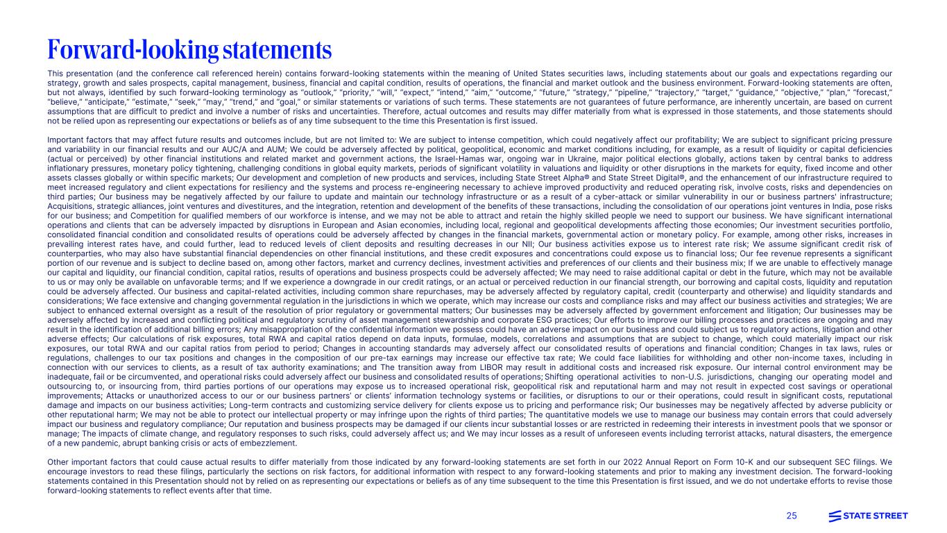 25 This presentation (and the conference call referenced herein) contains forward-looking statements within the meaning of United States securities laws, including statements about our goals and expectations regarding our strategy, growth and sales prospects, capital management, business, financial and capital condition, results of operations, the financial and market outlook and the business environment. Forward-looking statements are often, but not always, identified by such forward-looking terminology as “outlook,” “priority,” “will,” “expect,” “intend,” “aim,” “outcome,” “future,” “strategy,” “pipeline,” “trajectory,” “target,” “guidance,” “objective,” “plan,” “forecast,” “believe,” “anticipate,” “estimate,” “seek,” “may,” “trend,” and “goal,” or similar statements or variations of such terms. These statements are not guarantees of future performance, are inherently uncertain, are based on current assumptions that are difficult to predict and involve a number of risks and uncertainties. Therefore, actual outcomes and results may differ materially from what is expressed in those statements, and those statements should not be relied upon as representing our expectations or beliefs as of any time subsequent to the time this Presentation is first issued. Important factors that may affect future results and outcomes include, but are not limited to: We are subject to intense competition, which could negatively affect our profitability; We are subject to significant pricing pressure and variability in our financial results and our AUC/A and AUM; We could be adversely affected by political, geopolitical, economic and market conditions including, for example, as a result of liquidity or capital deficiencies (actual or perceived) by other financial institutions and related market and government actions, the Israel-Hamas war, ongoing war in Ukraine, major political elections globally, actions taken by central banks to address inflationary pressures, monetary policy tightening, challenging conditions in global equity markets, periods of significant volatility in valuations and liquidity or other disruptions in the markets for equity, fixed income and other assets classes globally or within specific markets; Our development and completion of new products and services, including State Street Alpha® and State Street Digital®, and the enhancement of our infrastructure required to meet increased regulatory and client expectations for resiliency and the systems and process re-engineering necessary to achieve improved productivity and reduced operating risk, involve costs, risks and dependencies on third parties; Our business may be negatively affected by our failure to update and maintain our technology infrastructure or as a result of a cyber-attack or similar vulnerability in our or business partners' infrastructure; Acquisitions, strategic alliances, joint ventures and divestitures, and the integration, retention and development of the benefits of these transactions, including the consolidation of our operations joint ventures in India, pose risks for our business; and Competition for qualified members of our workforce is intense, and we may not be able to attract and retain the highly skilled people we need to support our business. We have significant international operations and clients that can be adversely impacted by disruptions in European and Asian economies, including local, regional and geopolitical developments affecting those economies; Our investment securities portfolio, consolidated financial condition and consolidated results of operations could be adversely affected by changes in the financial markets, governmental action or monetary policy. For example, among other risks, increases in prevailing interest rates have, and could further, lead to reduced levels of client deposits and resulting decreases in our NII; Our business activities expose us to interest rate risk; We assume significant credit risk of counterparties, who may also have substantial financial dependencies on other financial institutions, and these credit exposures and concentrations could expose us to financial loss; Our fee revenue represents a significant portion of our revenue and is subject to decline based on, among other factors, market and currency declines, investment activities and preferences of our clients and their business mix; If we are unable to effectively manage our capital and liquidity, our financial condition, capital ratios, results of operations and business prospects could be adversely affected; We may need to raise additional capital or debt in the future, which may not be available to us or may only be available on unfavorable terms; and If we experience a downgrade in our credit ratings, or an actual or perceived reduction in our financial strength, our borrowing and capital costs, liquidity and reputation could be adversely affected. Our business and capital-related activities, including common share repurchases, may be adversely affected by regulatory capital, credit (counterparty and otherwise) and liquidity standards and considerations; We face extensive and changing governmental regulation in the jurisdictions in which we operate, which may increase our costs and compliance risks and may affect our business activities and strategies; We are subject to enhanced external oversight as a result of the resolution of prior regulatory or governmental matters; Our businesses may be adversely affected by government enforcement and litigation; Our businesses may be adversely affected by increased and conflicting political and regulatory scrutiny of asset management stewardship and corporate ESG practices; Our efforts to improve our billing processes and practices are ongoing and may result in the identification of additional billing errors; Any misappropriation of the confidential information we possess