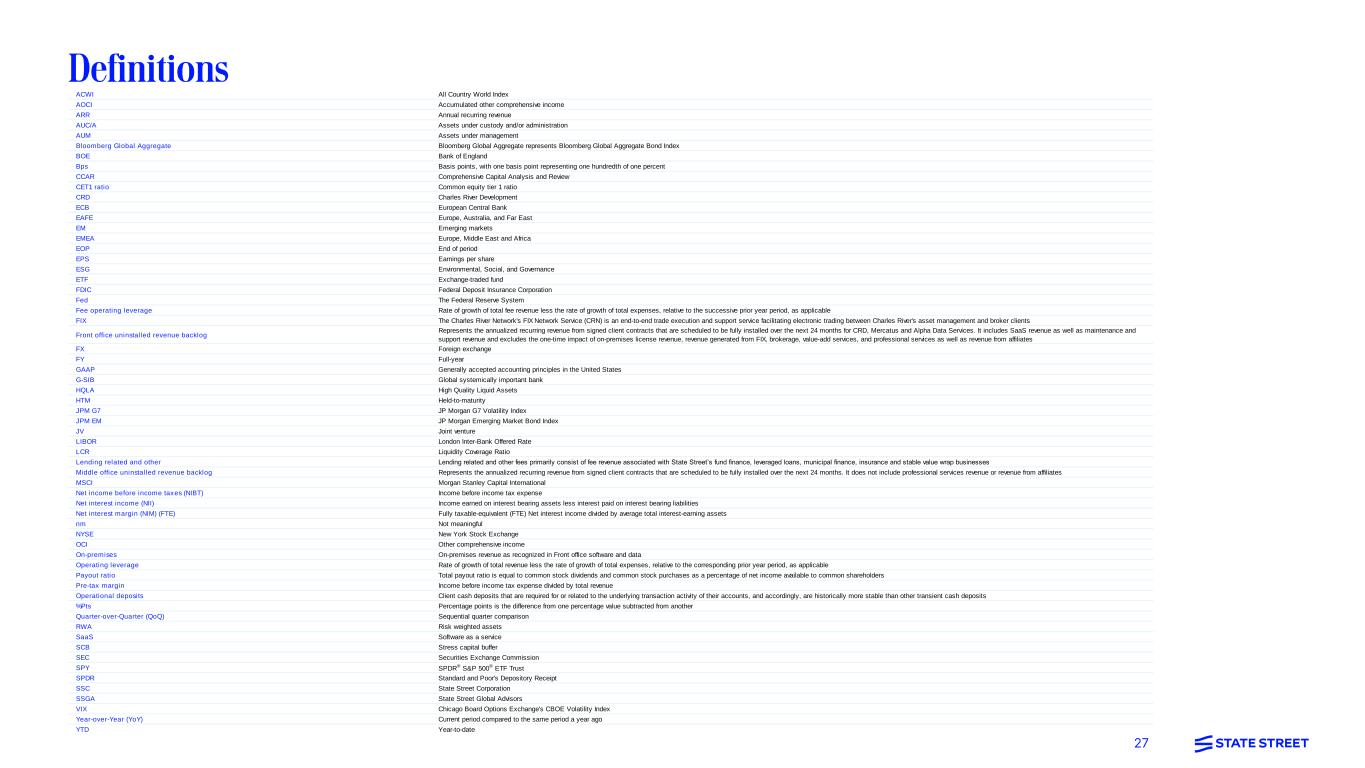 27 ACWI All Country World Index AOCI Accumulated other comprehensive income ARR Annual recurring revenue AUC/A Assets under custody and/or administration AUM Assets under management Bloomberg Global Aggregate Bloomberg Global Aggregate represents Bloomberg Global Aggregate Bond Index BOE Bank of England Bps Basis points, with one basis point representing one hundredth of one percent CCAR Comprehensive Capital Analysis and Review CET1 ratio Common equity tier 1 ratio CRD Charles River Development ECB European Central Bank EAFE Europe, Australia, and Far East EM Emerging markets EMEA Europe, Middle East and Africa EOP End of period EPS Earnings per share ESG Environmental, Social, and Governance ETF Exchange-traded fund FDIC Federal Deposit Insurance Corporation Fed The Federal Reserve System Fee operating leverage Rate of growth of total fee revenue less the rate of growth of total expenses, relative to the successive prior year period, as applicable FIX The Charles River Network's FIX Network Service (CRN) is an end-to-end trade execution and support service facilitating electronic trading between Charles River's asset management and broker clients Front office uninstalled revenue backlog Represents the annualized recurring revenue from signed client contracts that are scheduled to be fully installed over the next 24 months for CRD, Mercatus and Alpha Data Services. It includes SaaS revenue as well as maintenance and support revenue and excludes the one-time impact of on-premises license revenue, revenue generated from FIX, brokerage, value-add services, and professional services as well as revenue from affiliates FX Foreign exchange FY Full-year GAAP Generally accepted accounting principles in the United States G-SIB Global systemically important bank HQLA High Quality Liquid Assets HTM Held-to-maturity JPM G7 JP Morgan G7 Volatility Index JPM EM JP Morgan Emerging Market Bond Index JV Joint venture LIBOR London Inter-Bank Offered Rate LCR Liquidity Coverage Ratio Lending related and other Lending related and other fees primarily consist of fee revenue associated with State Street’s fund finance, leveraged loans, municipal finance, insurance and stable value wrap businesses Middle office uninstalled revenue backlog Represents the annualized recurring revenue from signed client contracts that are scheduled to be fully installed over the next 24 months. It does not include professional services revenue or revenue from affiliates MSCI Morgan Stanley Capital International Net income before income taxes (NIBT) Income before income tax expense Net interest income (NII) Income earned on interest bearing assets less interest paid on interest bearing liabilities Net interest margin (NIM) (FTE) Fully taxable-equivalent (FTE) Net interest income divided by average total interest-earning assets nm Not meaningful NYSE New York Stock Exchange OCI Other comprehensive income On-premises On-premises revenue as recognized in Front office software and data Operating leverage Rate of growth of total revenue less the rate of growth of total expenses, relative to the corresponding prior year period, as applicable Payout ratio Total payout ratio is equal to common stock dividends and common stock purchases as a percentage of net income available to common shareholders Pre-tax margin Income before income tax expense divided by total revenue Operational deposits Client cash deposits that are required for or related to the underlying transaction activity of their accounts, and accordingly, are historically more stable than other transient cash deposits %Pts Percentage points is the difference from one percentage value subtracted from another Quarter-over-Quarter (QoQ) Sequential quarter comparison RWA Risk weighted assets SaaS Software as a service SCB Stress capital buffer SEC Securities Exchange Commission SPY SPDR® S&P 500® ETF Trust SPDR Standard and Poor's Depository Receipt SSC State Street Corporation SSGA State Street Global Advisors VIX Chicago Board Options Exchange's CBOE Volatility Index Year-over-Year (YoY) Current period compared to the same period a year ago YTD Year-to-date