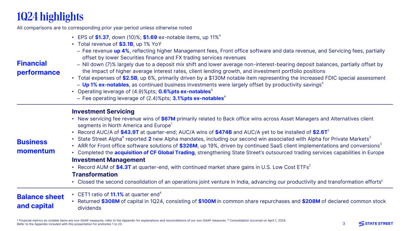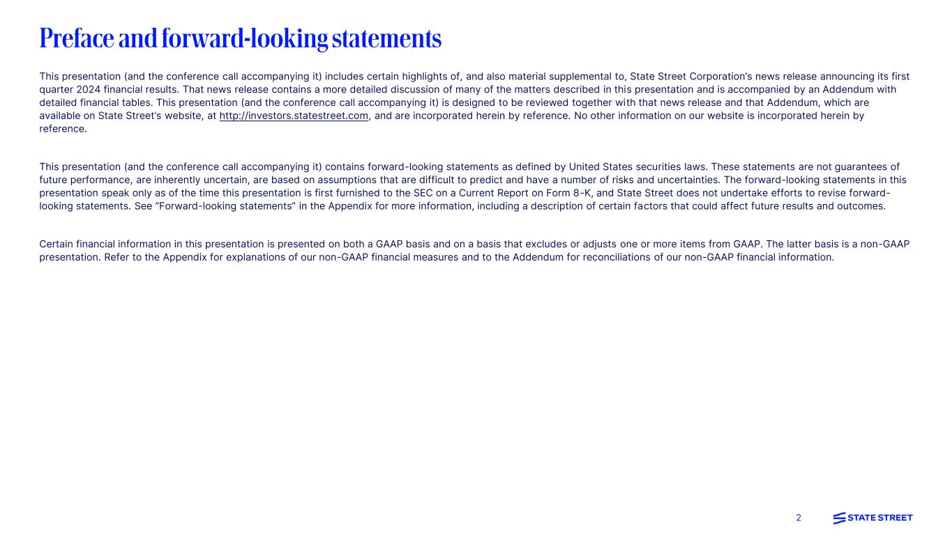2 This presentation (and the conference call accompanying it) includes certain highlights of, and also material supplemental to, State Street Corporation’s news release announcing its first quarter 2024 financial results. That news release contains a more detailed discussion of many of the matters described in this presentation and is accompanied by an Addendum with detailed financial tables. This presentation (and the conference call accompanying it) is designed to be reviewed together with that news release and that Addendum, which are available on State Street’s website, at http://investors.statestreet.com, and are incorporated herein by reference. No other information on our website is incorporated herein by reference. This presentation (and the conference call accompanying it) contains forward-looking statements as defined by United States securities laws. These statements are not guarantees of future performance, are inherently uncertain, are based on assumptions that are difficult to predict and have a number of risks and uncertainties. The forward-looking statements in this presentation speak only as of the time this presentation is first furnished to the SEC on a Current Report on Form 8-K, and State Street does not undertake efforts to revise forward- looking statements. See “Forward-looking statements” in the Appendix for more information, including a description of certain factors that could affect future results and outcomes. Certain financial information in this presentation is presented on both a GAAP basis and on a basis that excludes or adjusts one or more items from GAAP. The latter basis is a non-GAAP presentation. Refer to the Appendix for explanations of our non-GAAP financial measures and to the Addendum for reconciliations of our non-GAAP financial information.