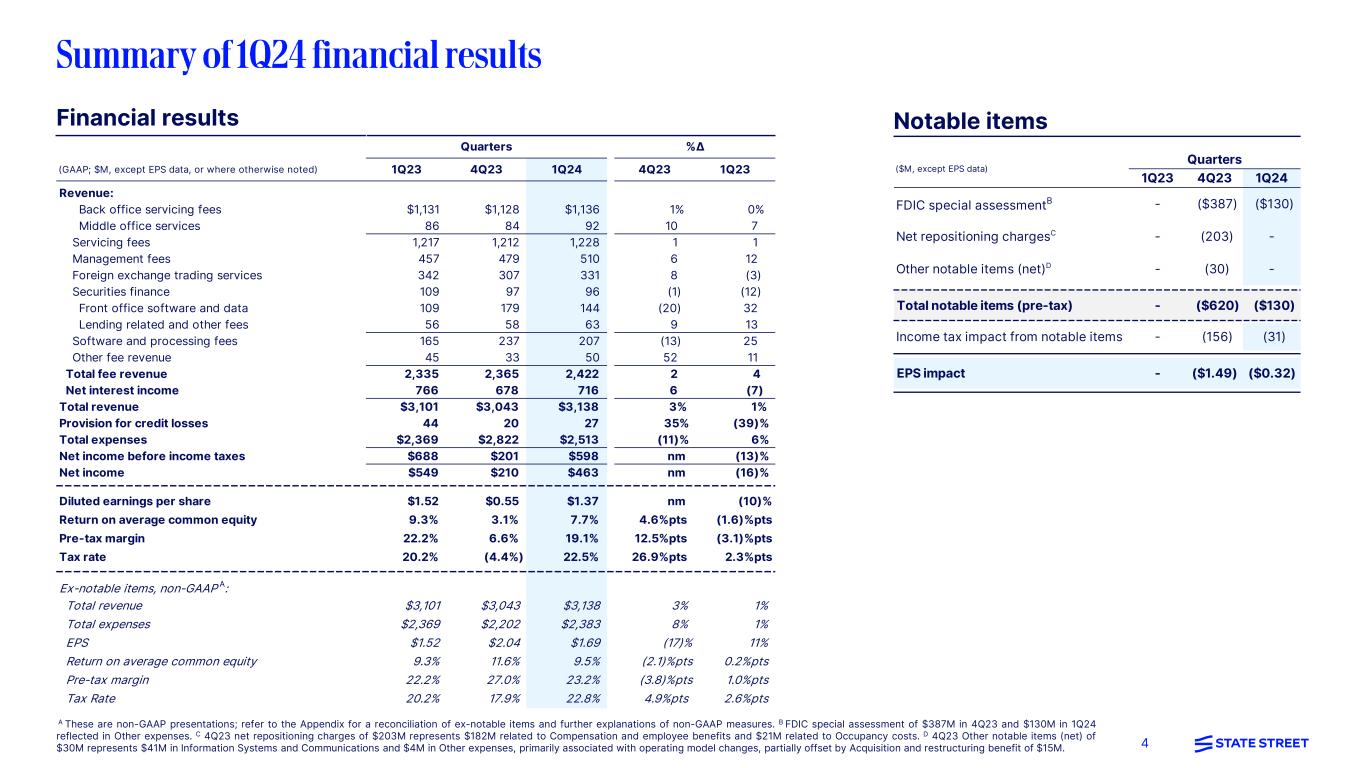 3 All comparisons are to corresponding prior year period unless otherwise noted Financial performance • EPS of $1.37, down (10)%; $1.69 ex-notable items, up 11%A • Total revenue of $3.1B, up 1% YoY – Fee revenue up 4%, reflecting higher Management fees, Front office software and data revenue, and Servicing fees, partially offset by lower Securities finance and FX trading services revenues – NII down (7)% largely due to a deposit mix shift and lower average non-interest-bearing deposit balances, partially offset by the impact of higher average interest rates, client lending growth, and investment portfolio positions • Total expenses of $2.5B, up 6%, primarily driven by a $130M notable item representing the increased FDIC special assessment – Up 1% ex-notables, as continued business investments were largely offset by productivity savingsA • Operating leverage of (4.9)%pts; 0.6%pts ex-notablesA – Fee operating leverage of (2.4)%pts; 3.1%pts ex-notablesA Business momentum Investment Servicing • New servicing fee revenue wins of $67M primarily related to Back office wins across Asset Managers and Alternatives client segments in North America and Europe1 • Record AUC/A of $43.9T at quarter-end; AUC/A wins of $474B and AUC/A yet to be installed of $2.6T2 • State Street Alpha® reported 2 new Alpha mandates, including our second win associated with Alpha for Private Markets2 • ARR for Front office software solutions of $326M, up 19%, driven by continued SaaS client implementations and conversions3 • Completed the acquisition of CF Global Trading, strengthening State Street’s outsourced trading services capabilities in Europe Investment Management • Record AUM of $4.3T at quarter-end, with continued market share gains in U.S. Low Cost ETFs2 Transformation • Closed the second consolidation of an operations joint venture in India, advancing our productivity and transformation effortsB Balance sheet and capital • CET1 ratio of 11.1% at quarter end4 • Returned $308M of capital in 1Q24, consisting of $100M in common share repurchases and $208M of declared common stock dividends A Financial metrics ex-notable items are non-GAAP measures; refer to the Appendix for explanations and reconciliations of our non-GAAP measures. B Consolidation occurred on April 1, 2024. Refer to the Appendix included with this presentation for endnotes 1 to 23.