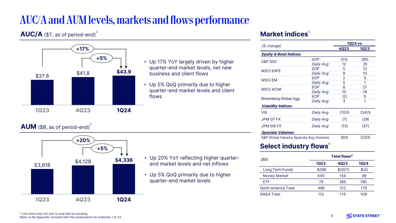 4 A These are non-GAAP presentations; refer to the Appendix for a reconciliation of ex-notable items and further explanations of non-GAAP measures. B FDIC special assessment of $387M in 4Q23 and $130M in 1Q24 reflected in Other expenses. C 4Q23 net repositioning charges of $203M represents $182M related to Compensation and employee benefits and $21M related to Occupancy costs. D 4Q23 Other notable items (net) of $30M represents $41M in Information Systems and Communications and $4M in Other expenses, primarily associated with operating model changes, partially offset by Acquisition and restructuring benefit of $15M. Financial results 1Q23 4Q23 1Q24 FDIC special assessmentB - ($387) ($130) Net repositioning chargesC - (203) - Other notable items (net)D - (30) - Total notable items (pre-tax) - ($620) ($130) Income tax impact from notable items - (156) (31) EPS impact - ($1.49) ($0.32) ($M, except EPS data) Quarters Notable items (GAAP; $M, except EPS data, or where otherwise noted) 1Q23 4Q23 1Q24 4Q23 1Q23 Revenue: Back office servicing fees $1,131 $1,128 $1,136 1% 0% Middle office services 86 84 92 10 7 Servicing fees 1,217 1,212 1,228 1 1 Management fees 457 479 510 6 12 Foreign exchange trading services 342 307 331 8 (3) Securities finance 109 97 96 (1) (12) Front office software and data 109 179 144 (20) 32 Lending related and other fees 56 58 63 9 13 Software and processing fees 165 237 207 (13) 25 Other fee revenue 45 33 50 52 11 Total fee revenue 2,335 2,365 2,422 2 4 Net interest income 766 678 716 6 (7) Total revenue $3,101 $3,043 $3,138 3% 1% Provision for credit losses 44 20 27 35% (39)% Total expenses $2,369 $2,822 $2,513 (11)% 6% Net income before income taxes $688 $201 $598 nm (13)% Net income $549 $210 $463 nm (16)% Diluted earnings per share $1.52 $0.55 $1.37 nm (10)% Return on average common equity 9.3% 3.1% 7.7% 4.6%pts (1.6)%pts Pre-tax margin 22.2% 6.6% 19.1% 12.5%pts (3.1)%pts Tax rate 20.2% (4.4%) 22.5% 26.9%pts 2.3%pts Ex-notable items, non-GAAP A: Total revenue $3,101 $3,043 $3,138 3% 1% Total expenses $2,369 $2,202 $2,383 8% 1% EPS $1.52 $2.04 $1.69 (17)% 11% Return on average common equity 9.3% 11.6% 9.5% (2.1)%pts 0.2%pts Pre-tax margin 22.2% 27.0% 23.2% (3.8)%pts 1.0%pts Tax Rate 20.2% 17.9% 22.8% 4.9%pts 2.6%pts Quarters %∆