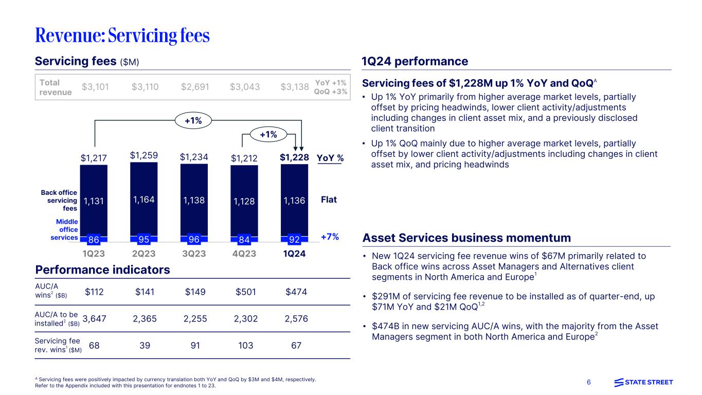5 AUC/A ($T, as of period-end) 2 Market indices5 • Up 17% YoY largely driven by higher quarter-end market levels, net new business and client flows • Up 5% QoQ primarily due to higher quarter-end market levels and client flows • Up 20% YoY reflecting higher quarter- end market levels and net inflows • Up 5% QoQ primarily due to higher quarter-end market levels AUM ($B, as of period-end) 2 +5% +5% $37.6 $41.8 $43.9 1Q23 4Q23 1Q24 1Q23 4Q23 1Q24 $3,618 $4,128 $4,336 +17% +20% A Line items may not sum to total due to rounding. Refer to the Appendix included with this presentation for endnotes 1 to 23. Select industry flows6 1Q23 4Q23 1Q24 Long Term Funds $(58) $(207) $(2) Money Market 445 154 (9) ETF 79 265 190 North America Total 466 212 179 EMEA Total 112 115 109 Total flowsA ($B) 4Q23 1Q23 Equity & Bond Indices: EOP 10% 28% Daily Avg 12 25 EOP 5 12 Daily Avg 9 10 EOP 2 5 Daily Avg 5 1 EOP 8 21 Daily Avg 10 18 EOP (2) 0 Daily Avg 3 1 Volatility Indices: VIX Daily Avg (10)% (34)% JPM G7 FX Daily Avg (7) (29) JPM EM FX Daily Avg (15) (37) Specials Volumes: S&P Global Industry Specials Avg Volumes (6)% (32)% (% change) 1Q24 vs S&P 500 MSCI EAFE MSCI EM MSCI ACWI Bloomberg Global Agg