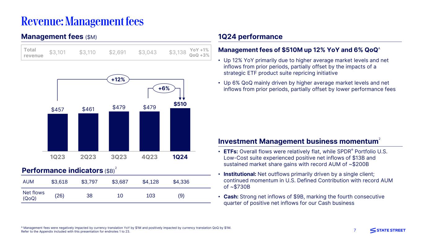 6 Servicing fees of $1,228M up 1% YoY and QoQA • Up 1% YoY primarily from higher average market levels, partially offset by pricing headwinds, lower client activity/adjustments including changes in client asset mix, and a previously disclosed client transition • Up 1% QoQ mainly due to higher average market levels, partially offset by lower client activity/adjustments including changes in client asset mix, and pricing headwinds Servicing fees ($M) 1Q24 performance 1,131 1,164 1,138 1,128 1,136 86 1Q23 95 2Q23 96 3Q23 84 4Q23 92 1Q24 $1,217 $1,259 $1,234 $1,212 $1,228 $3,101 $3,110 $2,691 $3,043 $3,138 YoY +1% QoQ +3% Total revenue Asset Services business momentum • New 1Q24 servicing fee revenue wins of $67M primarily related to Back office wins across Asset Managers and Alternatives client segments in North America and Europe1 • $291M of servicing fee revenue to be installed as of quarter-end, up $71M YoY and $21M QoQ1,2 • $474B in new servicing AUC/A wins, with the majority from the Asset Managers segment in both North America and Europe2 A Servicing fees were positively impacted by currency translation both YoY and QoQ by $3M and $4M, respectively. Refer to the Appendix included with this presentation for endnotes 1 to 23. +1% +1% Back office servicing fees Middle office services Flat +7% YoY % $112 $141 $149 $501 $474 3,647 2,365 2,255 2,302 2,576 68 39 91 103 67 Performance indicators AUC/A wins2 ($B) AUC/A to be installed2 ($B) Servicing fee rev. wins1 ($M)