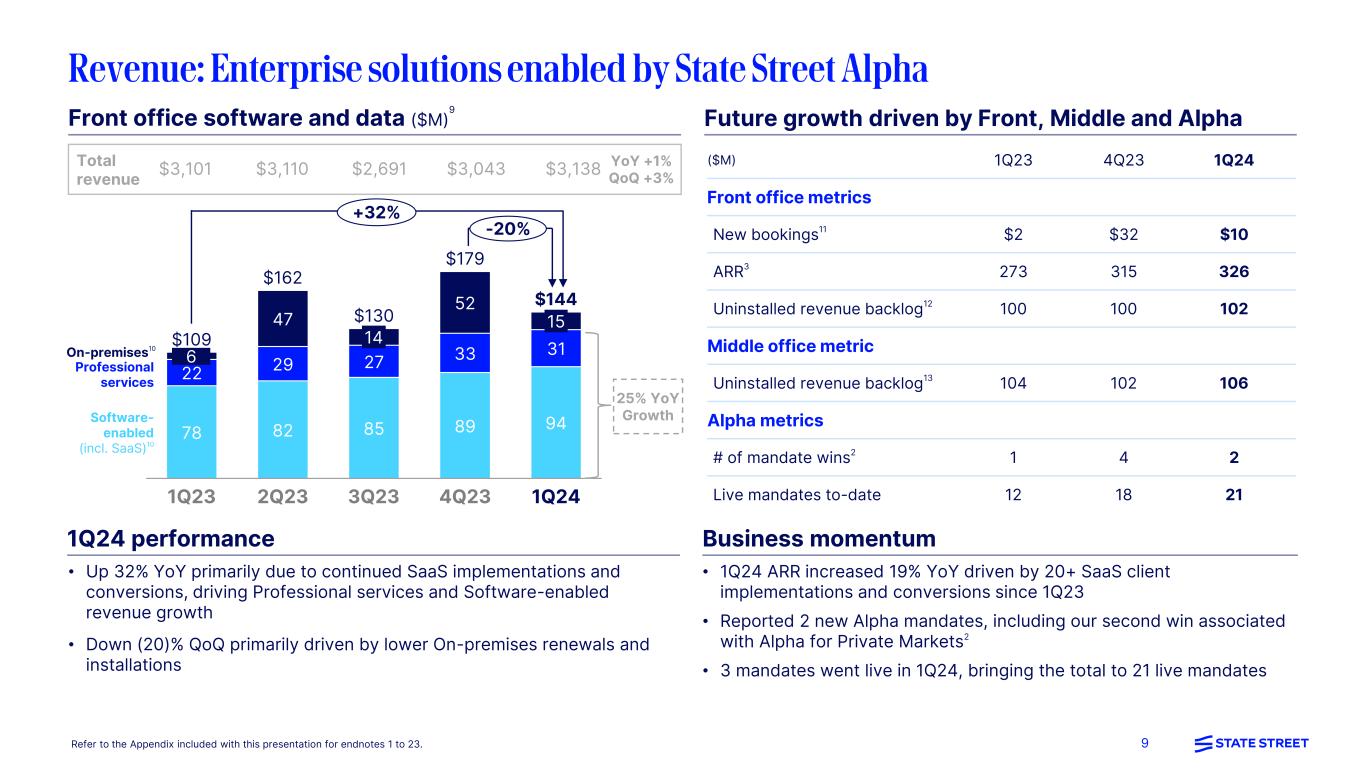 8 Markets, Software & processing, and Other fees ($M) 45 58 44 33 50 165 221 188 237 207 109 117 103 97 96 342 303 313 307 331 1Q23 2Q23 3Q23 4Q23 1Q24 $661 $699 $648 $674 $684 FX trading Securities finance Software & processing (3)% (12)% +25% YoY % Other fees7 +11% • FX trading services of $331M – Down (3)% YoY mainly due to lower spreads associated with subdued FX volatility, partially offset by higher volumes – Up 8% QoQ primarily reflecting higher volumes and Direct FX spreads • Securities finance of $96M – Down (12)% YoY mainly due to lower Agency balances and lower spreads primarily due to muted industry specials activity – Down (1)% QoQ primarily due to lower spreads, partially offset by higher balances • Software and processing fees of $207M – Up 25% YoY mainly driven by higher Front office software and data revenue associated with CRD – Down (13)% QoQ primarily due to lower On-premises renewals in Front office software and data, partially offset by higher Lending related and other fees • Other fee revenue of $50M7 – Increased $5M YoY primarily due to a tax credit investment accounting change, partially offset by lower positive fair value adjustments on equity investments8 – Increased $17M QoQ primarily driven by the absence of the impact of the Argentine peso devaluation $3,101 $3,110 $2,691 $3,043 $3,138 YoY +1% QoQ +3% Total Revenue 1Q24 performance Refer to the Appendix included with this presentation for endnotes 1 to 23.