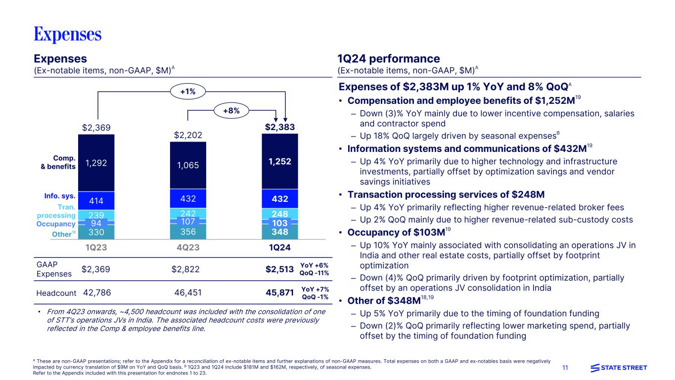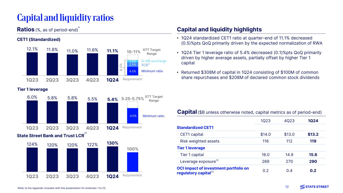 11 $2,369 $2,822 $2,513 42,786 46,451 45,871 Expenses of $2,383M up 1% YoY and 8% QoQA • Compensation and employee benefits of $1,252M19 – Down (3)% YoY mainly due to lower incentive compensation, salaries and contractor spend – Up 18% QoQ largely driven by seasonal expensesB • Information systems and communications of $432M19 – Up 4% YoY primarily due to higher technology and infrastructure investments, partially offset by optimization savings and vendor savings initiatives • Transaction processing services of $248M – Up 4% YoY primarily reflecting higher revenue-related broker fees – Up 2% QoQ mainly due to higher revenue-related sub-custody costs • Occupancy of $103M19 – Up 10% YoY mainly associated with consolidating an operations JV in India and other real estate costs, partially offset by footprint optimization – Down (4)% QoQ primarily driven by footprint optimization, partially offset by an operations JV consolidation in India • Other of $348M18,19 – Up 5% YoY primarily due to the timing of foundation funding – Down (2)% QoQ primarily reflecting lower marketing spend, partially offset by the timing of foundation funding GAAP Expenses Headcount 330 356 348 239 242 248 414 432 432 1,292 1,065 1,252 1Q23 4Q23 1Q24 $2,369 $2,202 $2,383 A These are non-GAAP presentations; refer to the Appendix for a reconciliation of ex-notable items and further explanations of non-GAAP measures. Total expenses on both a GAAP and ex-notables basis were negatively impacted by currency translation of $9M on YoY and QoQ basis. B 1Q23 and 1Q24 include $181M and $162M, respectively, of seasonal expenses. Refer to the Appendix included with this presentation for endnotes 1 to 23. Comp. & benefits Info. sys. Tran. processing Other18 Occupancy 10310794 YoY +6% QoQ -11% +1% +8% YoY +7% QoQ -1% Expenses (Ex-notable items, non-GAAP, $M)A 1Q24 performance (Ex-notable items, non-GAAP, $M)A • From 4Q23 onwards, ~4,500 headcount was included with the consolidation of one of STT’s operations JVs in India. The associated headcount costs were previously reflected in the Comp & employee benefits line.