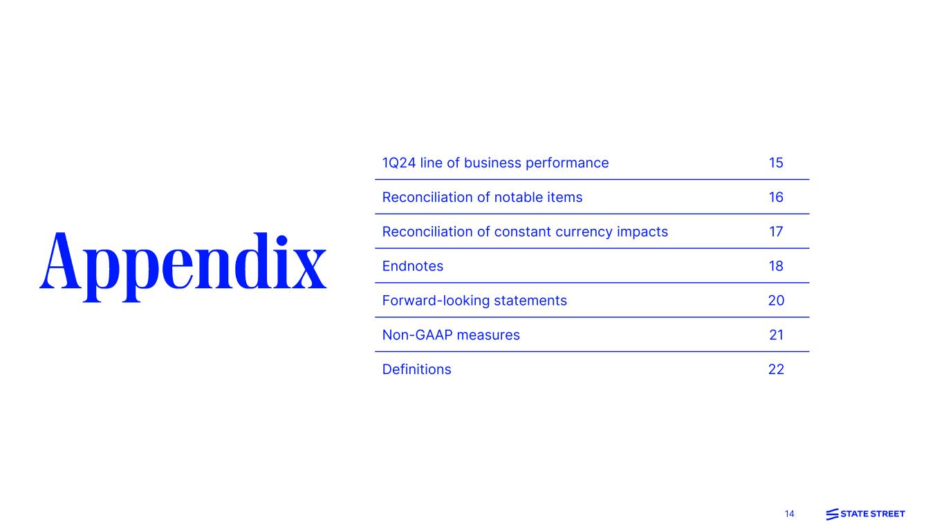 14 1Q24 line of business performance 15 Reconciliation of notable items 16 Reconciliation of constant currency impacts 17 Endnotes 18 Forward-looking statements 20 Non-GAAP measures 21 Definitions 22