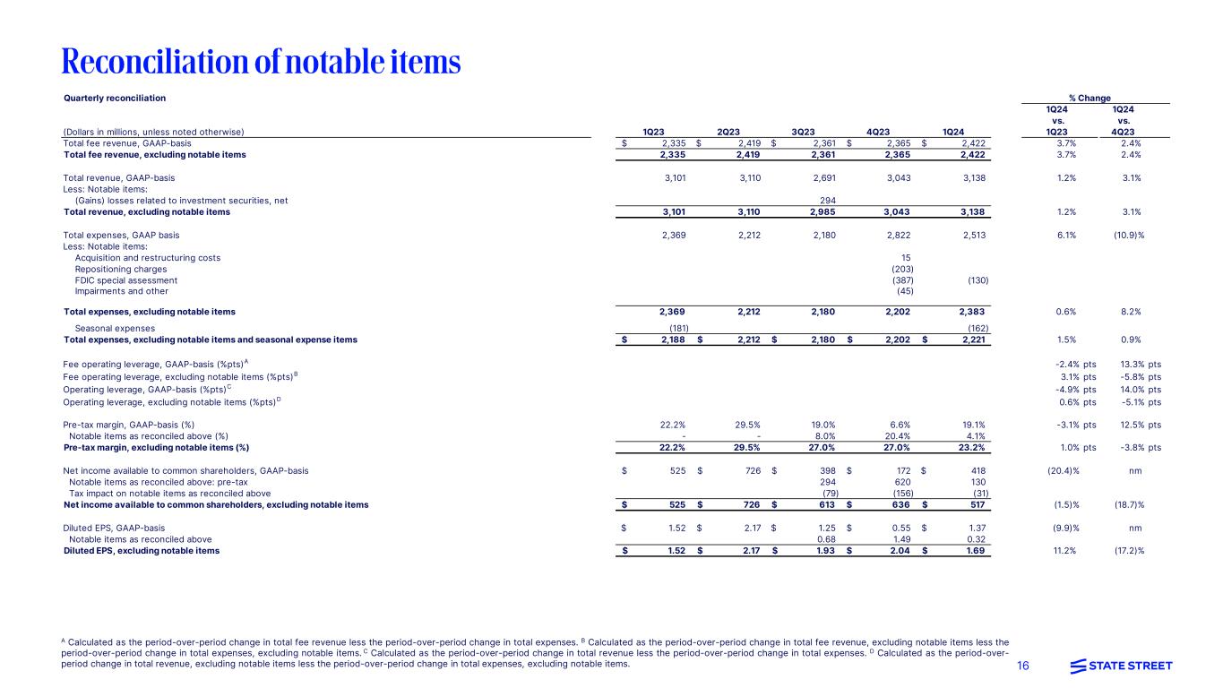16 A Calculated as the period-over-period change in total fee revenue less the period-over-period change in total expenses. B Calculated as the period-over-period change in total fee revenue, excluding notable items less the period-over-period change in total expenses, excluding notable items. C Calculated as the period-over-period change in total revenue less the period-over-period change in total expenses. D Calculated as the period-over- period change in total revenue, excluding notable items less the period-over-period change in total expenses, excluding notable items. Quarterly reconciliation (Dollars in millions, unless noted otherwise) 1Q23 2Q23 3Q23 4Q23 1Q24 1Q24 vs. 1Q23 1Q24 vs. 4Q23 Total fee revenue, GAAP-basis 2,335$ 2,419$ 2,361$ 2,365$ 2,422$ 3.7% 2.4% Total fee revenue, excluding notable items 2,335 2,419 2,361 2,365 2,422 3.7% 2.4% Total revenue, GAAP-basis 3,101 3,110 2,691 3,043 3,138 1.2% 3.1% Less: Notable items: (Gains) losses related to investment securities, net 294 Total revenue, excluding notable items 3,101 3,110 2,985 3,043 3,138 1.2% 3.1% Total expenses, GAAP basis 2,369 2,212 2,180 2,822 2,513 6.1% (10.9)% Less: Notable items: Acquisition and restructuring costs 15 Repositioning charges (203) FDIC special assessment (387) (130) Impairments and other (45) Total expenses, excluding notable items 2,369 2,212 2,180 2,202 2,383 0.6% 8.2% Seasonal expenses (181) (162) Total expenses, excluding notable items and seasonal expense items 2,188$ 2,212$ 2,180$ 2,202$ 2,221$ 1.5% 0.9% Fee operating leverage, GAAP-basis (%pts)A -2.4% pts 13.3% pts Fee operating leverage, excluding notable items (%pts)B 3.1% pts -5.8% pts Operating leverage, GAAP-basis (%pts)C -4.9% pts 14.0% pts Operating leverage, excluding notable items (%pts)D 0.6% pts -5.1% pts Pre-tax margin, GAAP-basis (%) 22.2% 29.5% 19.0% 6.6% 19.1% -3.1% pts 12.5% pts Notable items as reconciled above (%) - - 8.0% 20.4% 4.1% Pre-tax margin, excluding notable items (%) 22.2% 29.5% 27.0% 27.0% 23.2% 1.0% pts -3.8% pts Net income available to common shareholders, GAAP-basis 525$ 726$ 398$ 172$ 418$ (20.4)% nm Notable items as reconciled above: pre-tax 294 620 130 Tax impact on notable items as reconciled above (79) (156) (31) Net income available to common shareholders, excluding notable items 525$ 726$ 613$ 636$ 517$ (1.5)% (18.7)% Diluted EPS, GAAP-basis 1.52$ 2.17$ 1.25$ 0.55$ 1.37$ (9.9)% nm Notable items as reconciled above 0.68 1.49 0.32 Diluted EPS, excluding notable items 1.52$ 2.17$ 1.93$ 2.04$ 1.69$ 11.2% (17.2)% % Change