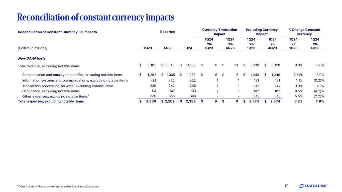 17A Other includes Other expenses and Amortization of intangible assets. Reconciliation of Constant Currency FX Impacts (Dollars in millions) 1Q23 4Q23 1Q24 1Q24 vs. 1Q23 1Q24 vs. 4Q23 1Q24 vs. 1Q23 1Q24 vs. 4Q23 1Q24 vs. 1Q23 1Q24 vs. 4Q23 Non-GAAP basis Total revenue, excluding notable items $ 3,101 $ 3,043 $ 3,138 $ 8 $ 10 $ 3,130 $ 3,128 0.9% 2.8% Compensation and employee benefits, excluding notable items $ 1,292 $ 1,065 $ 1,252 $ 6 $ 6 $ 1,246 $ 1,246 (3.6)% 17.0% Information systems and communications, excluding notable items 414 432 432 1 1 431 431 4.1% (0.2)% Transaction processing services, excluding notable items 239 242 248 1 1 247 247 3.3% 2.1% Occupancy, excluding notable items 94 107 103 1 1 102 102 8.5% (4.7)% Other expenses, excluding notable itemsA 330 356 348 - - 348 348 5.5% (2.2)% Total expenses, excluding notable items $ 2,369 $ 2,202 $ 2,383 $ 9 $ 9 $ 2,374 $ 2,374 0.2% 7.8% Reported Currency Translation Impact Excluding Currency Impact % Change Constant Currency