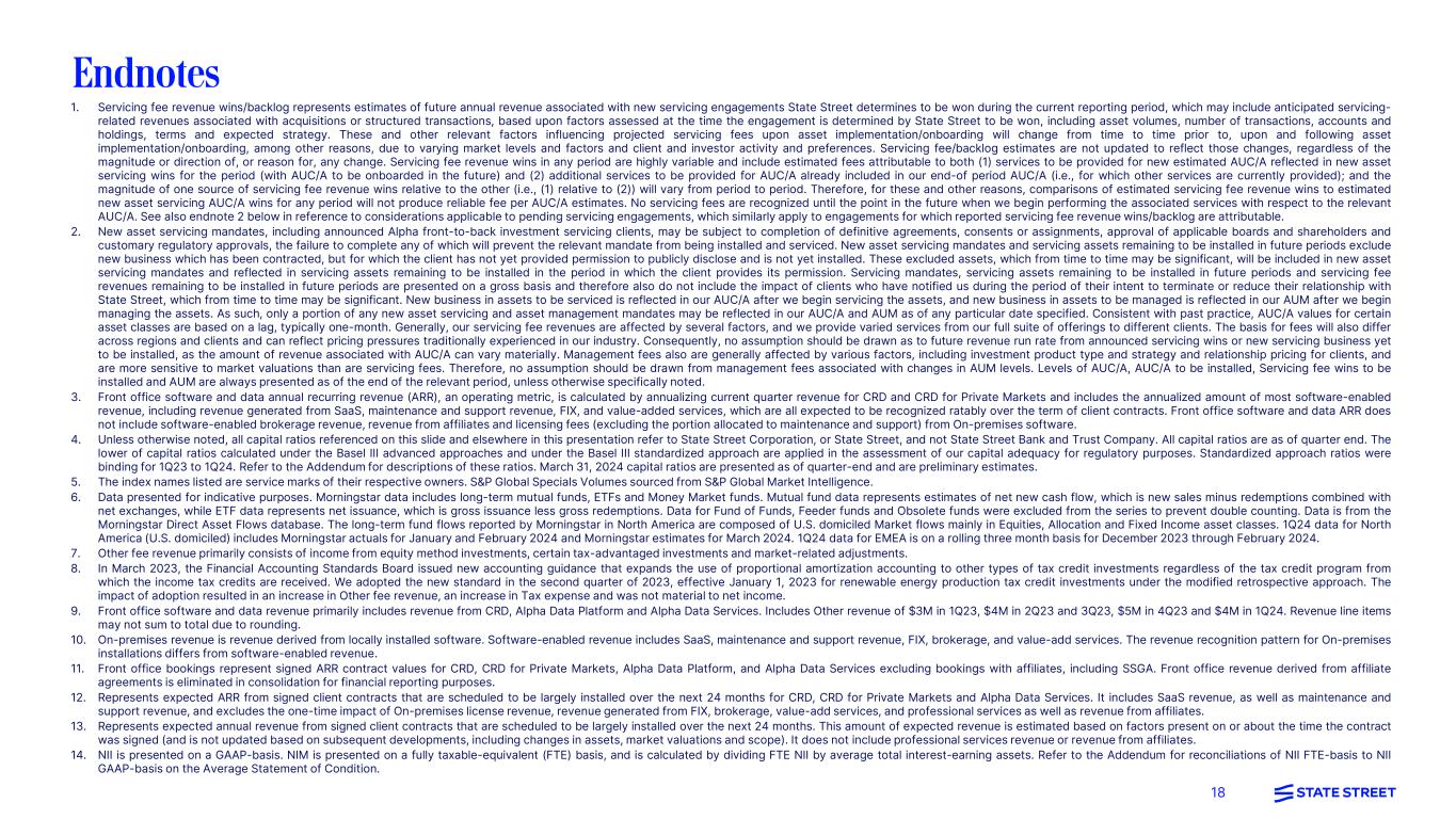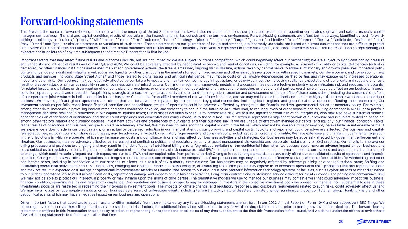 20 This Presentation contains forward-looking statements within the meaning of United States securities laws, including statements about our goals and expectations regarding our strategy, growth and sales prospects, capital management, business, financial and capital condition, results of operations, the financial and market outlook and the business environment. Forward-looking statements are often, but not always, identified by such forward- looking terminology as “outlook,” “priority,” “will,” “expect,” “intend,” “aim,” “outcome,” “future,” “strategy,” “pipeline,” “trajectory,” “target," “guidance,” “objective,” “plan,” “forecast,” “believe,” “anticipate,” “estimate,” “seek,” “may,” “trend,” and “goal,” or similar statements or variations of such terms. These statements are not guarantees of future performance, are inherently uncertain, are based on current assumptions that are difficult to predict and involve a number of risks and uncertainties. Therefore, actual outcomes and results may differ materially from what is expressed in those statements, and those statements should not be relied upon as representing our expectations or beliefs as of any time subsequent to the time this Presentation is first issued. Important factors that may affect future results and outcomes include, but are not limited to: We are subject to intense competition, which could negatively affect our profitability; We are subject to significant pricing pressure and variability in our financial results and our AUC/A and AUM; We could be adversely affected by geopolitical, economic and market conditions, including, for example, as a result of liquidity or capital deficiencies (actual or perceived) by other financial institutions and related market and government actions, the Israel-Hamas war, ongoing war in Ukraine, actions taken by central banks to address inflationary and growth pressures, monetary policy tightening, periods of significant volatility in valuations and liquidity or other disruptions in the markets for equity, fixed income and other asset classes globally or within specific markets; Our development and completion of new products and services, including State Street Alpha® and those related to digital assets and artificial intelligence, may impose costs on us, involve dependencies on third parties and may expose us to increased operational, model and other risks; Our business may be negatively affected by our failure to update and maintain our technology infrastructure, or otherwise meet the increasing resiliency expectations of our clients and regulators, or as a result of a cyber-attack or similar vulnerability in our or business partners' infrastructure; Our risk management framework, models and processes may not be effective in identifying or mitigating risk and reducing the potential for related losses, and a failure or circumvention of our controls and procedures, or errors or delays in our operational and transaction processing, or those of third parties, could have an adverse effect on our business, financial condition, operating results and reputation; Acquisitions, strategic alliances, joint ventures and divestitures, and the integration, retention and development of the benefits of these transactions, including the consolidation of one of our operations joint ventures in India, pose risks for our business; Competition for qualified members of our workforce is intense, and we may not be able to attract and retain the highly skilled people we need to support our business; We have significant global operations and clients that can be adversely impacted by disruptions in key global economies, including local, regional and geopolitical developments affecting those economies; Our investment securities portfolio, consolidated financial condition and consolidated results of operations could be adversely affected by changes in the financial markets, governmental action or monetary policy. For example, among other risks, increases in prevailing interest rates or market conditions have led, and were they to occur in the future could further lead, to reduced levels of client deposits and resulting decreases in our NII or to portfolio management decisions resulting in reductions in our capital or liquidity ratios; Our business activities expose us to interest rate risk; We assume significant credit risk of counterparties, who may also have substantial financial dependencies on other financial institutions, and these credit exposures and concentrations could expose us to financial loss; Our fee revenue represents a significant portion of our revenue and is subject to decline based on, among other factors, market and currency declines, investment activities and preferences of our clients and their business mix; If we are unable to effectively manage our capital and liquidity, our financial condition, capital ratios, results of operations and business prospects could be adversely affected; We may need to raise additional capital or debt in the future, which may not be available to us or may only be available on unfavorable terms; If we experience a downgrade in our credit ratings, or an actual or perceived reduction in our financial strength, our borrowing and capital costs, liquidity and reputation could be adversely affected. Our business and capital- related activities, including common share repurchases, may be adversely affected by regulatory requirements and considerations, including capital, credit and liquidity; We face extensive and changing governmental regulation in the jurisdictions in which we operate, which may increase our costs and compliance risks and may affect our business activities and strategies; Our businesses may be adversely affected by government enforcement and litigation; Our businesses may be adversely affected by increased and conflicting political and regulatory scrutiny of asset ma