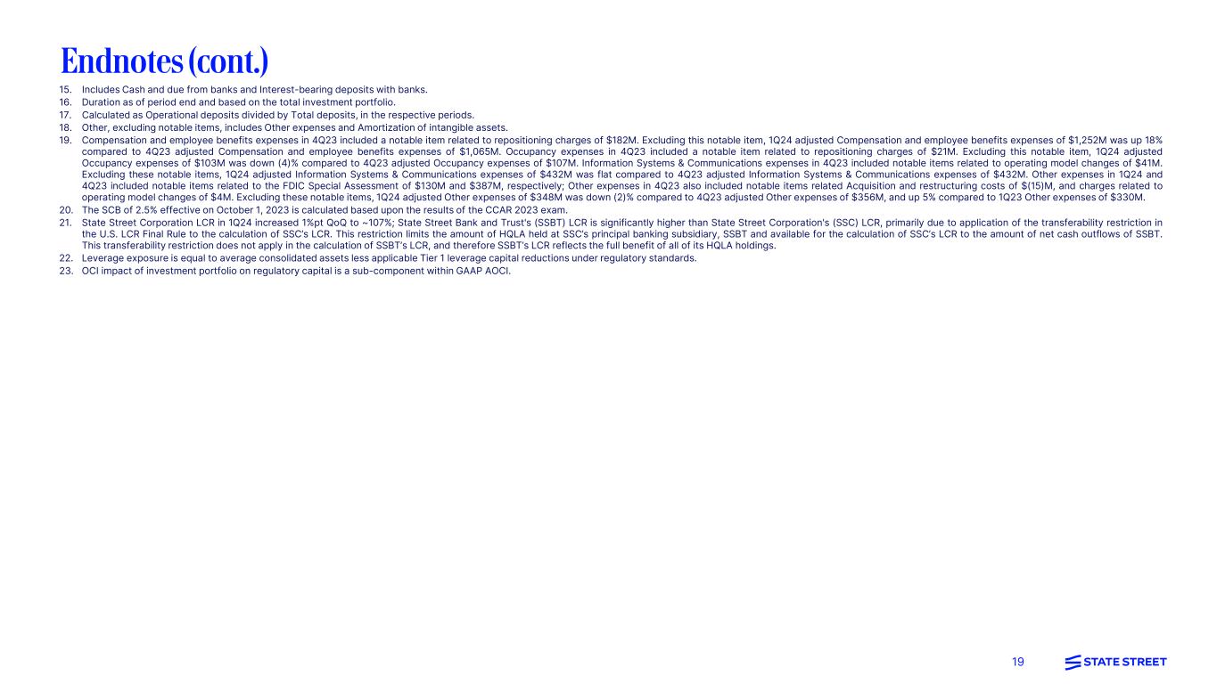 18 1. Servicing fee revenue wins/backlog represents estimates of future annual revenue associated with new servicing engagements State Street determines to be won during the current reporting period, which may include anticipated servicing- related revenues associated with acquisitions or structured transactions, based upon factors assessed at the time the engagement is determined by State Street to be won, including asset volumes, number of transactions, accounts and holdings, terms and expected strategy. These and other relevant factors influencing projected servicing fees upon asset implementation/onboarding will change from time to time prior to, upon and following asset implementation/onboarding, among other reasons, due to varying market levels and factors and client and investor activity and preferences. Servicing fee/backlog estimates are not updated to reflect those changes, regardless of the magnitude or direction of, or reason for, any change. Servicing fee revenue wins in any period are highly variable and include estimated fees attributable to both (1) services to be provided for new estimated AUC/A reflected in new asset servicing wins for the period (with AUC/A to be onboarded in the future) and (2) additional services to be provided for AUC/A already included in our end-of period AUC/A (i.e., for which other services are currently provided); and the magnitude of one source of servicing fee revenue wins relative to the other (i.e., (1) relative to (2)) will vary from period to period. Therefore, for these and other reasons, comparisons of estimated servicing fee revenue wins to estimated new asset servicing AUC/A wins for any period will not produce reliable fee per AUC/A estimates. No servicing fees are recognized until the point in the future when we begin performing the associated services with respect to the relevant AUC/A. See also endnote 2 below in reference to considerations applicable to pending servicing engagements, which similarly apply to engagements for which reported servicing fee revenue wins/backlog are attributable. 2. New asset servicing mandates, including announced Alpha front-to-back investment servicing clients, may be subject to completion of definitive agreements, consents or assignments, approval of applicable boards and shareholders and customary regulatory approvals, the failure to complete any of which will prevent the relevant mandate from being installed and serviced. New asset servicing mandates and servicing assets remaining to be installed in future periods exclude new business which has been contracted, but for which the client has not yet provided permission to publicly disclose and is not yet installed. These excluded assets, which from time to time may be significant, will be included in new asset servicing mandates and reflected in servicing assets remaining to be installed in the period in which the client provides its permission. Servicing mandates, servicing assets remaining to be installed in future periods and servicing fee revenues remaining to be installed in future periods are presented on a gross basis and therefore also do not include the impact of clients who have notified us during the period of their intent to terminate or reduce their relationship with State Street, which from time to time may be significant. New business in assets to be serviced is reflected in our AUC/A after we begin servicing the assets, and new business in assets to be managed is reflected in our AUM after we begin managing the assets. As such, only a portion of any new asset servicing and asset management mandates may be reflected in our AUC/A and AUM as of any particular date specified. Consistent with past practice, AUC/A values for certain asset classes are based on a lag, typically one-month. Generally, our servicing fee revenues are affected by several factors, and we provide varied services from our full suite of offerings to different clients. The basis for fees will also differ across regions and clients and can reflect pricing pressures traditionally experienced in our industry. Consequently, no assumption should be drawn as to future revenue run rate from announced servicing wins or new servicing business yet to be installed, as the amount of revenue associated with AUC/A can vary materially. Management fees also are generally affected by various factors, including investment product type and strategy and relationship pricing for clients, and are more sensitive to market valuations than are servicing fees. Therefore, no assumption should be drawn from management fees associated with changes in AUM levels. Levels of AUC/A, AUC/A to be installed, Servicing fee wins to be installed and AUM are always presented as of the end of the relevant period, unless otherwise specifically noted. 3. Front office software and data annual recurring revenue (ARR), an operating metric, is calculated by annualizing current quarter revenue for CRD and CRD for Private Markets and includes the annualized amount of most software-enabled revenue, including revenue generated from SaaS, maintenance and support revenue, FIX, and value-added services, which are all expected to be recognized ratably over the term of client contracts. Front office software and data ARR does not include software-enabled brokerage revenue, revenue from affiliates and licensing fees (excluding the portion allocated to maintenance and support) from On-premises software. 4. Unless otherwise noted, all capital ratios referenced on this slide and elsewhere in this presentation refer to State Street Corporation, or State Street, and not State Street Bank and Trust Company. All capital ratios are as of quarter end. The lower of capital ratios calculated under the Basel III advanced approaches and under the Basel III standardized approach are applied in the assessment of our capital adequacy for regulatory purposes. Standardized approach ratios were binding for 1Q23 to 1Q24. Refer to the Addendum