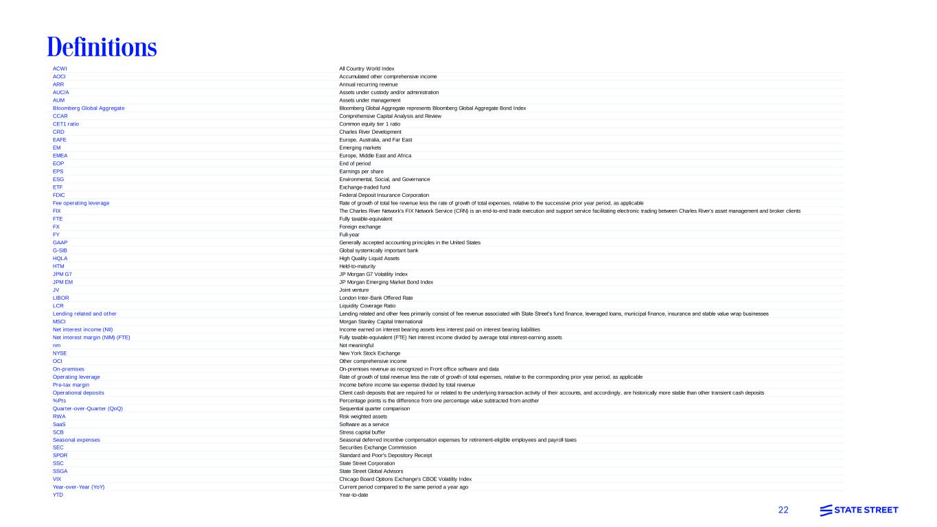 22 ACWI All Country World Index AOCI Accumulated other comprehensive income ARR Annual recurring revenue AUC/A Assets under custody and/or administration AUM Assets under management Bloomberg Global Aggregate Bloomberg Global Aggregate represents Bloomberg Global Aggregate Bond Index CCAR Comprehensive Capital Analysis and Review CET1 ratio Common equity tier 1 ratio CRD Charles River Development EAFE Europe, Australia, and Far East EM Emerging markets EMEA Europe, Middle East and Africa EOP End of period EPS Earnings per share ESG Environmental, Social, and Governance ETF Exchange-traded fund FDIC Federal Deposit Insurance Corporation Fee operating leverage Rate of growth of total fee revenue less the rate of growth of total expenses, relative to the successive prior year period, as applicable FIX The Charles River Network's FIX Network Service (CRN) is an end-to-end trade execution and support service facilitating electronic trading between Charles River's asset management and broker clients FTE Fully taxable-equivalent FX Foreign exchange FY Full-year GAAP Generally accepted accounting principles in the United States G-SIB Global systemically important bank HQLA High Quality Liquid Assets HTM Held-to-maturity JPM G7 JP Morgan G7 Volatility Index JPM EM JP Morgan Emerging Market Bond Index JV Joint venture LIBOR London Inter-Bank Offered Rate LCR Liquidity Coverage Ratio Lending related and other Lending related and other fees primarily consist of fee revenue associated with State Street’s fund finance, leveraged loans, municipal finance, insurance and stable value wrap businesses MSCI Morgan Stanley Capital International Net interest income (NII) Income earned on interest bearing assets less interest paid on interest bearing liabilities Net interest margin (NIM) (FTE) Fully taxable-equivalent (FTE) Net interest income divided by average total interest-earning assets nm Not meaningful NYSE New York Stock Exchange OCI Other comprehensive income On-premises On-premises revenue as recognized in Front office software and data Operating leverage Rate of growth of total revenue less the rate of growth of total expenses, relative to the corresponding prior year period, as applicable Pre-tax margin Income before income tax expense divided by total revenue Operational deposits Client cash deposits that are required for or related to the underlying transaction activity of their accounts, and accordingly, are historically more stable than other transient cash deposits %Pts Percentage points is the difference from one percentage value subtracted from another Quarter-over-Quarter (QoQ) Sequential quarter comparison RWA Risk weighted assets SaaS Software as a service SCB Stress capital buffer Seasonal expenses Seasonal deferred incentive compensation expenses for retirement-eligible employees and payroll taxes SEC Securities Exchange Commission SPDR Standard and Poor's Depository Receipt SSC State Street Corporation SSGA State Street Global Advisors VIX Chicago Board Options Exchange's CBOE Volatility Index Year-over-Year (YoY) Current period compared to the same period a year ago YTD Year-to-date