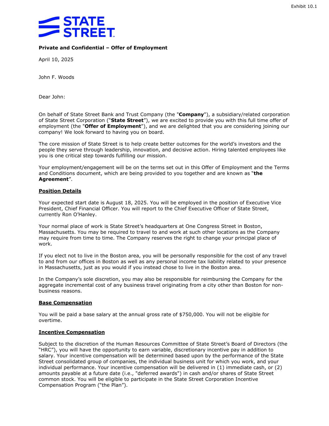 Private and Confidential – Offer of Employment April 10, 2025 John F. Woods Dear John: On behalf of State Street Bank and Trust Company (the "Company"), a subsidiary/related corporation of State Street Corporation (“State Street”), we are excited to provide you with this full time offer of employment (the "Offer of Employment"), and we are delighted that you are considering joining our company! We look forward to having you on board. The core mission of State Street is to help create better outcomes for the world’s investors and the people they serve through leadership, innovation, and decisive action. Hiring talented employees like you is one critical step towards fulfilling our mission. Your employment/engagement will be on the terms set out in this Offer of Employment and the Terms and Conditions document, which are being provided to you together and are known as “the Agreement”. Position Details Your expected start date is August 18, 2025. You will be employed in the position of Executive Vice President, Chief Financial Officer. You will report to the Chief Executive Officer of State Street, currently Ron O’Hanley. Your normal place of work is State Street’s headquarters at One Congress Street in Boston, Massachusetts. You may be required to travel to and work at such other locations as the Company may require from time to time. The Company reserves the right to change your principal place of work. If you elect not to live in the Boston area, you will be personally responsible for the cost of any travel to and from our offices in Boston as well as any personal income tax liability related to your presence in Massachusetts, just as you would if you instead chose to live in the Boston area. In the Company’s sole discretion, you may also be responsible for reimbursing the Company for the aggregate incremental cost of any business travel originating from a city other than Boston for non- business reasons. Base Compensation You will be paid a base salary at the annual gross rate of $750,000. You will not be eligible for overtime. Incentive Compensation Subject to the discretion of the Human Resources Committee of State Street’s Board of Directors (the “HRC”), you will have the opportunity to earn variable, discretionary incentive pay in addition to salary. Your incentive compensation will be determined based upon by the performance of the State Street consolidated group of companies, the individual business unit for which you work, and your individual performance. Your incentive compensation will be delivered in (1) immediate cash, or (2) amounts payable at a future date (i.e., "deferred awards") in cash and/or shares of State Street common stock. You will be eligible to participate in the State Street Corporation Incentive Compensation Program (“the Plan”).
