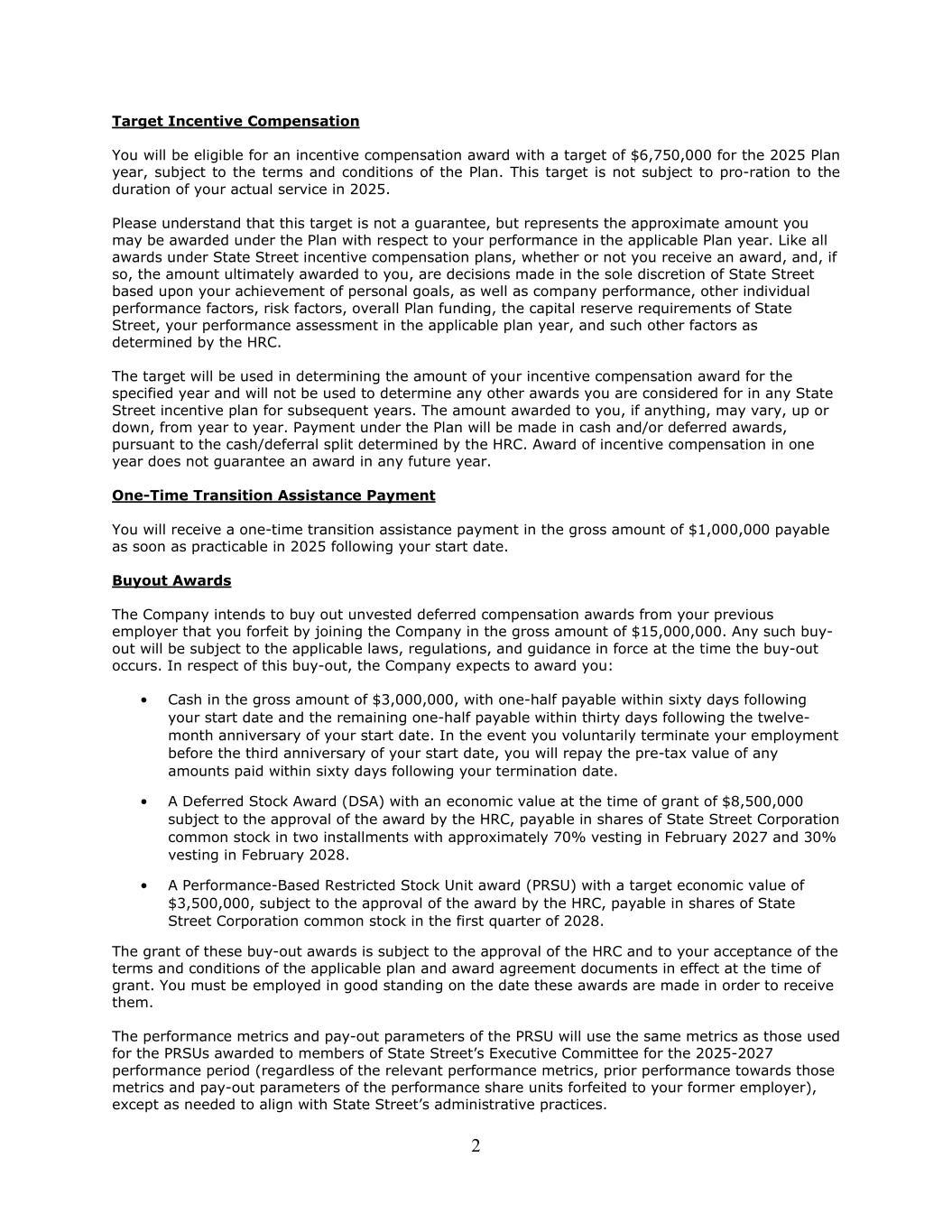 2 Target Incentive Compensation You will be eligible for an incentive compensation award with a target of $6,750,000 for the 2025 Plan year, subject to the terms and conditions of the Plan. This target is not subject to pro-ration to the duration of your actual service in 2025. Please understand that this target is not a guarantee, but represents the approximate amount you may be awarded under the Plan with respect to your performance in the applicable Plan year. Like all awards under State Street incentive compensation plans, whether or not you receive an award, and, if so, the amount ultimately awarded to you, are decisions made in the sole discretion of State Street based upon your achievement of personal goals, as well as company performance, other individual performance factors, risk factors, overall Plan funding, the capital reserve requirements of State Street, your performance assessment in the applicable plan year, and such other factors as determined by the HRC. The target will be used in determining the amount of your incentive compensation award for the specified year and will not be used to determine any other awards you are considered for in any State Street incentive plan for subsequent years. The amount awarded to you, if anything, may vary, up or down, from year to year. Payment under the Plan will be made in cash and/or deferred awards, pursuant to the cash/deferral split determined by the HRC. Award of incentive compensation in one year does not guarantee an award in any future year. One-Time Transition Assistance Payment You will receive a one-time transition assistance payment in the gross amount of $1,000,000 payable as soon as practicable in 2025 following your start date. Buyout Awards The Company intends to buy out unvested deferred compensation awards from your previous employer that you forfeit by joining the Company in the gross amount of $15,000,000. Any such buy- out will be subject to the applicable laws, regulations, and guidance in force at the time the buy-out occurs. In respect of this buy-out, the Company expects to award you: • Cash in the gross amount of $3,000,000, with one-half payable within sixty days following your start date and the remaining one-half payable within thirty days following the twelve- month anniversary of your start date. In the event you voluntarily terminate your employment before the third anniversary of your start date, you will repay the pre-tax value of any amounts paid within sixty days following your termination date. • A Deferred Stock Award (DSA) with an economic value at the time of grant of $8,500,000 subject to the approval of the award by the HRC, payable in shares of State Street Corporation common stock in two installments with approximately 70% vesting in February 2027 and 30% vesting in February 2028. • A Performance-Based Restricted Stock Unit award (PRSU) with a target economic value of $3,500,000, subject to the approval of the award by the HRC, payable in shares of State Street Corporation common stock in the first quarter of 2028. The grant of these buy-out awards is subject to the approval of the HRC and to your acceptance of the terms and conditions of the applicable plan and award agreement documents in effect at the time of grant. You must be employed in good standing on the date these awards are made in order to receive them. The performance metrics and pay-out parameters of the PRSU will use the same metrics as those used for the PRSUs awarded to members of State Street’s Executive Committee for the 2025-2027 performance period (regardless of the relevant performance metrics, prior performance towards those metrics and pay-out parameters of the performance share units forfeited to your former employer), except as needed to align with State Street’s administrative practices.