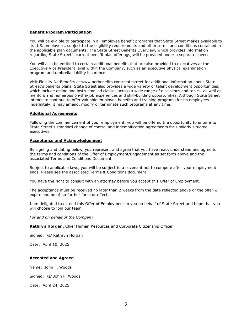 3 Benefit Program Participation You will be eligible to participate in all employee benefit programs that State Street makes available to its U.S. employees, subject to the eligibility requirements and other terms and conditions contained in the applicable plan documents. The State Street Benefits Overview, which provides information regarding State Street’s current benefit plan offerings, will be provided under a separate cover. You will also be entitled to certain additional benefits that are also provided to executives at the Executive Vice President level within the Company, such as an executive physical examination program and umbrella liability insurance. Visit Fidelity NetBenefits at www.netbenefits.com/statestreet for additional information about State Street’s benefits plans. State Street also provides a wide variety of talent development opportunities, which include online and instructor-led classes across a wide range of disciplines and topics, as well as mentors and numerous on-the-job experiences and skill-building opportunities. Although State Street intends to continue to offer valuable employee benefits and training programs for its employees indefinitely, it may amend, modify or terminate such programs at any time. Additional Agreements Following the commencement of your employment, you will be offered the opportunity to enter into State Street's standard change of control and indemnification agreements for similarly situated executives. Acceptance and Acknowledgement By signing and dating below, you represent and agree that you have read, understand and agree to the terms and conditions of the Offer of Employment/Engagement as set forth above and the associated Terms and Conditions Document. Subject to applicable laws, you will be subject to a covenant not to compete after your employment ends. Please see the associated Terms & Conditions document. You have the right to consult with an attorney before you accept this Offer of Employment. The acceptance must be received no later than 2 weeks from the date reflected above or the offer will expire and be of no further force or effect. I am delighted to extend this Offer of Employment to you on behalf of State Street and hope that you will choose to join our team. For and on behalf of the Company Kathryn Horgan, Chief Human Resources and Corporate Citizenship Officer Signed: /s/ Kathryn Horgan Date: April 10, 2025 Accepted and Agreed Name: John F. Woods Signed: /s/ John F. Woods Date: April 24, 2025