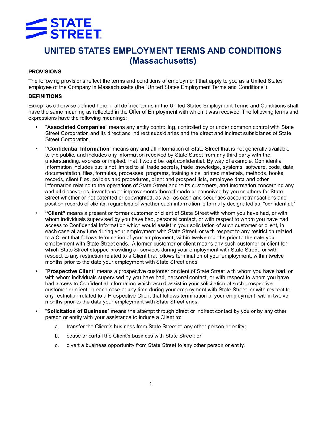 1 UNITED STATES EMPLOYMENT TERMS AND CONDITIONS (Massachusetts) PROVISIONS The following provisions reflect the terms and conditions of employment that apply to you as a United States employee of the Company in Massachusetts (the "United States Employment Terms and Conditions"). DEFINITIONS Except as otherwise defined herein, all defined terms in the United States Employment Terms and Conditions shall have the same meaning as reflected in the Offer of Employment with which it was received. The following terms and expressions have the following meanings: • “Associated Companies” means any entity controlling, controlled by or under common control with State Street Corporation and its direct and indirect subsidiaries and the direct and indirect subsidiaries of State Street Corporation. • “Confidential Information” means any and all information of State Street that is not generally available to the public, and includes any information received by State Street from any third party with the understanding, express or implied, that it would be kept confidential. By way of example, Confidential Information includes but is not limited to all trade secrets, trade knowledge, systems, software, code, data documentation, files, formulas, processes, programs, training aids, printed materials, methods, books, records, client files, policies and procedures, client and prospect lists, employee data and other information relating to the operations of State Street and to its customers, and information concerning any and all discoveries, inventions or improvements thereof made or conceived by you or others for State Street whether or not patented or copyrighted, as well as cash and securities account transactions and position records of clients, regardless of whether such information is formally designated as “confidential.” • “Client” means a present or former customer or client of State Street with whom you have had, or with whom individuals supervised by you have had, personal contact, or with respect to whom you have had access to Confidential Information which would assist in your solicitation of such customer or client, in each case at any time during your employment with State Street, or with respect to any restriction related to a Client that follows termination of your employment, within twelve months prior to the date your employment with State Street ends. A former customer or client means any such customer or client for which State Street stopped providing all services during your employment with State Street, or with respect to any restriction related to a Client that follows termination of your employment, within twelve months prior to the date your employment with State Street ends. • “Prospective Client” means a prospective customer or client of State Street with whom you have had, or with whom individuals supervised by you have had, personal contact, or with respect to whom you have had access to Confidential Information which would assist in your solicitation of such prospective customer or client, in each case at any time during your employment with State Street, or with respect to any restriction related to a Prospective Client that follows termination of your employment, within twelve months prior to the date your employment with State Street ends. • “Solicitation of Business” means the attempt through direct or indirect contact by you or by any other person or entity with your assistance to induce a Client to: a. transfer the Client’s business from State Street to any other person or entity; b. cease or curtail the Client’s business with State Street; or c. divert a business opportunity from State Street to any other person or entity.