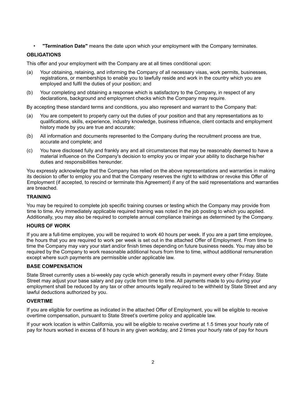 2 • "Termination Date" means the date upon which your employment with the Company terminates. OBLIGATIONS This offer and your employment with the Company are at all times conditional upon: (a) Your obtaining, retaining, and informing the Company of all necessary visas, work permits, businesses, registrations, or memberships to enable you to lawfully reside and work in the country which you are employed and fulfil the duties of your position; and (b) Your completing and obtaining a response which is satisfactory to the Company, in respect of any declarations, background and employment checks which the Company may require. By accepting these standard terms and conditions, you also represent and warrant to the Company that: (a) You are competent to properly carry out the duties of your position and that any representations as to qualifications, skills, experience, industry knowledge, business influence, client contacts and employment history made by you are true and accurate; (b) All information and documents represented to the Company during the recruitment process are true, accurate and complete; and (c) You have disclosed fully and frankly any and all circumstances that may be reasonably deemed to have a material influence on the Company's decision to employ you or impair your ability to discharge his/her duties and responsibilities hereunder. You expressly acknowledge that the Company has relied on the above representations and warranties in making its decision to offer to employ you and that the Company reserves the right to withdraw or revoke this Offer of Employment (if accepted, to rescind or terminate this Agreement) if any of the said representations and warranties are breached. TRAINING You may be required to complete job specific training courses or testing which the Company may provide from time to time. Any immediately applicable required training was noted in the job posting to which you applied. Additionally, you may also be required to complete annual compliance trainings as determined by the Company. HOURS OF WORK If you are a full-time employee, you will be required to work 40 hours per week. If you are a part time employee, the hours that you are required to work per week is set out in the attached Offer of Employment. From time to time the Company may vary your start and/or finish times depending on future business needs. You may also be required by the Company to work reasonable additional hours from time to time, without additional remuneration except where such payments are permissible under applicable law. BASE COMPENSATION State Street currently uses a bi-weekly pay cycle which generally results in payment every other Friday. State Street may adjust your base salary and pay cycle from time to time. All payments made to you during your employment shall be reduced by any tax or other amounts legally required to be withheld by State Street and any lawful deductions authorized by you. OVERTIME If you are eligible for overtime as indicated in the attached Offer of Employment, you will be eligible to receive overtime compensation, pursuant to State Street’s overtime policy and applicable law. If your work location is within California, you will be eligible to receive overtime at 1.5 times your hourly rate of pay for hours worked in excess of 8 hours in any given workday, and 2 times your hourly rate of pay for hours