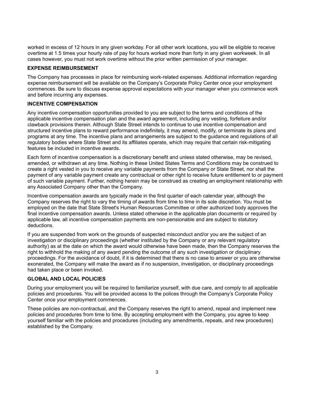 3 worked in excess of 12 hours in any given workday. For all other work locations, you will be eligible to receive overtime at 1.5 times your hourly rate of pay for hours worked more than forty in any given workweek. In all cases however, you must not work overtime without the prior written permission of your manager. EXPENSE REIMBURSEMENT The Company has processes in place for reimbursing work-related expenses. Additional information regarding expense reimbursement will be available on the Company’s Corporate Policy Center once your employment commences. Be sure to discuss expense approval expectations with your manager when you commence work and before incurring any expenses. INCENTIVE COMPENSATION Any incentive compensation opportunities provided to you are subject to the terms and conditions of the applicable incentive compensation plan and the award agreement, including any vesting, forfeiture and/or clawback provisions therein. Although State Street intends to continue to use incentive compensation and structured incentive plans to reward performance indefinitely, it may amend, modify, or terminate its plans and programs at any time. The incentive plans and arrangements are subject to the guidance and regulations of all regulatory bodies where State Street and its affiliates operate, which may require that certain risk-mitigating features be included in incentive awards. Each form of incentive compensation is a discretionary benefit and unless stated otherwise, may be revised, amended, or withdrawn at any time. Nothing in these United States Terms and Conditions may be construed to create a right vested in you to receive any variable payments from the Company or State Street, nor shall the payment of any variable payment create any contractual or other right to receive future entitlement to or payment of such variable payment. Further, nothing herein may be construed as creating an employment relationship with any Associated Company other than the Company. Incentive compensation awards are typically made in the first quarter of each calendar year, although the Company reserves the right to vary the timing of awards from time to time in its sole discretion. You must be employed on the date that State Street's Human Resources Committee or other authorized body approves the final incentive compensation awards. Unless stated otherwise in the applicable plan documents or required by applicable law, all incentive compensation payments are non-pensionable and are subject to statutory deductions. If you are suspended from work on the grounds of suspected misconduct and/or you are the subject of an investigation or disciplinary proceedings (whether instituted by the Company or any relevant regulatory authority) as at the date on which the award would otherwise have been made, then the Company reserves the right to withhold the making of any award pending the outcome of any such investigation or disciplinary proceedings. For the avoidance of doubt, if it is determined that there is no case to answer or you are otherwise exonerated, the Company will make the award as if no suspension, investigation, or disciplinary proceedings had taken place or been invoked. GLOBAL AND LOCAL POLICIES During your employment you will be required to familiarize yourself, with due care, and comply to all applicable policies and procedures. You will be provided access to the polices through the Company’s Corporate Policy Center once your employment commences. These policies are non-contractual, and the Company reserves the right to amend, repeal and implement new policies and procedures from time to time. By accepting employment with the Company, you agree to keep yourself familiar with the policies and procedures (including any amendments, repeals, and new procedures) established by the Company.