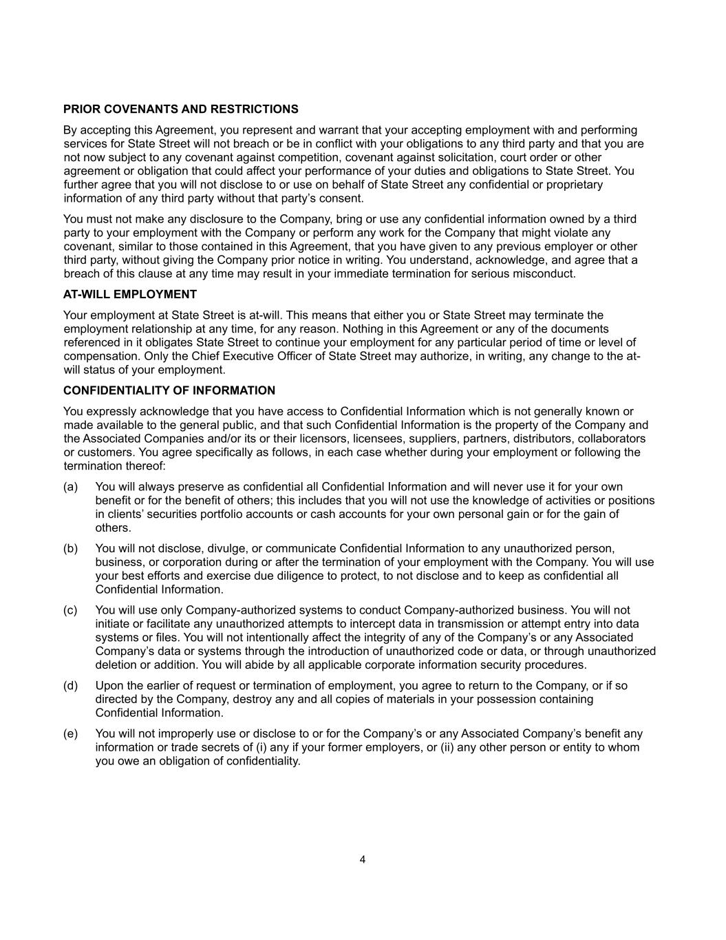 4 PRIOR COVENANTS AND RESTRICTIONS By accepting this Agreement, you represent and warrant that your accepting employment with and performing services for State Street will not breach or be in conflict with your obligations to any third party and that you are not now subject to any covenant against competition, covenant against solicitation, court order or other agreement or obligation that could affect your performance of your duties and obligations to State Street. You further agree that you will not disclose to or use on behalf of State Street any confidential or proprietary information of any third party without that party’s consent. You must not make any disclosure to the Company, bring or use any confidential information owned by a third party to your employment with the Company or perform any work for the Company that might violate any covenant, similar to those contained in this Agreement, that you have given to any previous employer or other third party, without giving the Company prior notice in writing. You understand, acknowledge, and agree that a breach of this clause at any time may result in your immediate termination for serious misconduct. AT-WILL EMPLOYMENT Your employment at State Street is at-will. This means that either you or State Street may terminate the employment relationship at any time, for any reason. Nothing in this Agreement or any of the documents referenced in it obligates State Street to continue your employment for any particular period of time or level of compensation. Only the Chief Executive Officer of State Street may authorize, in writing, any change to the at- will status of your employment. CONFIDENTIALITY OF INFORMATION You expressly acknowledge that you have access to Confidential Information which is not generally known or made available to the general public, and that such Confidential Information is the property of the Company and the Associated Companies and/or its or their licensors, licensees, suppliers, partners, distributors, collaborators or customers. You agree specifically as follows, in each case whether during your employment or following the termination thereof: (a) You will always preserve as confidential all Confidential Information and will never use it for your own benefit or for the benefit of others; this includes that you will not use the knowledge of activities or positions in clients’ securities portfolio accounts or cash accounts for your own personal gain or for the gain of others. (b) You will not disclose, divulge, or communicate Confidential Information to any unauthorized person, business, or corporation during or after the termination of your employment with the Company. You will use your best efforts and exercise due diligence to protect, to not disclose and to keep as confidential all Confidential Information. (c) You will use only Company-authorized systems to conduct Company-authorized business. You will not initiate or facilitate any unauthorized attempts to intercept data in transmission or attempt entry into data systems or files. You will not intentionally affect the integrity of any of the Company’s or any Associated Company’s data or systems through the introduction of unauthorized code or data, or through unauthorized deletion or addition. You will abide by all applicable corporate information security procedures. (d) Upon the earlier of request or termination of employment, you agree to return to the Company, or if so directed by the Company, destroy any and all copies of materials in your possession containing Confidential Information. (e) You will not improperly use or disclose to or for the Company’s or any Associated Company’s benefit any information or trade secrets of (i) any if your former employers, or (ii) any other person or entity to whom you owe an obligation of confidentiality.