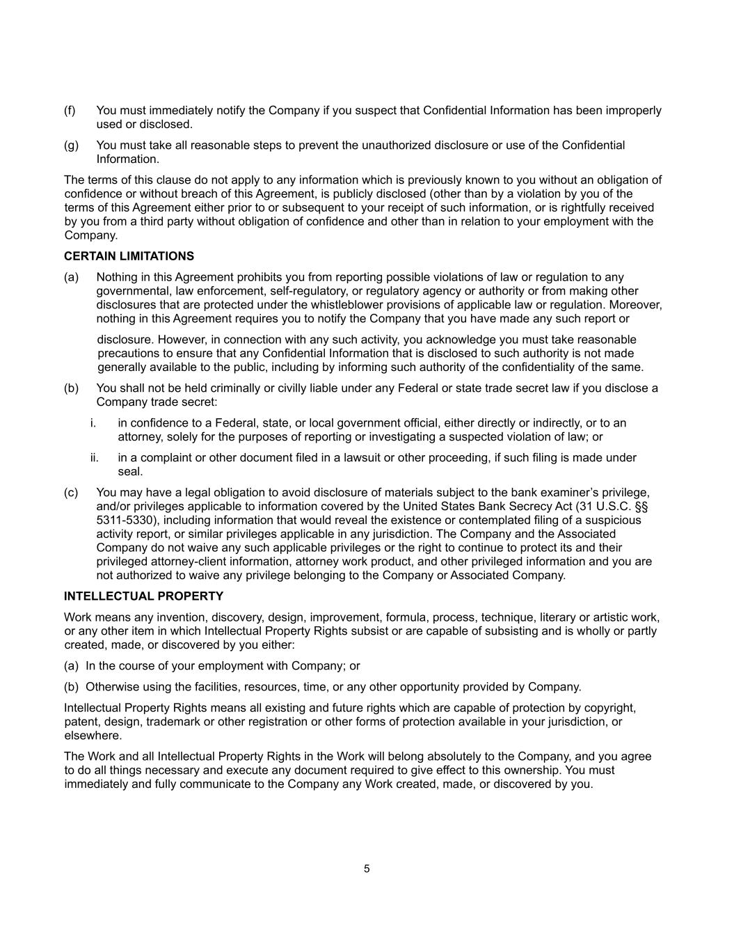 5 (f) You must immediately notify the Company if you suspect that Confidential Information has been improperly used or disclosed. (g) You must take all reasonable steps to prevent the unauthorized disclosure or use of the Confidential Information. The terms of this clause do not apply to any information which is previously known to you without an obligation of confidence or without breach of this Agreement, is publicly disclosed (other than by a violation by you of the terms of this Agreement either prior to or subsequent to your receipt of such information, or is rightfully received by you from a third party without obligation of confidence and other than in relation to your employment with the Company. CERTAIN LIMITATIONS (a) Nothing in this Agreement prohibits you from reporting possible violations of law or regulation to any governmental, law enforcement, self-regulatory, or regulatory agency or authority or from making other disclosures that are protected under the whistleblower provisions of applicable law or regulation. Moreover, nothing in this Agreement requires you to notify the Company that you have made any such report or disclosure. However, in connection with any such activity, you acknowledge you must take reasonable precautions to ensure that any Confidential Information that is disclosed to such authority is not made generally available to the public, including by informing such authority of the confidentiality of the same. (b) You shall not be held criminally or civilly liable under any Federal or state trade secret law if you disclose a Company trade secret: i. in confidence to a Federal, state, or local government official, either directly or indirectly, or to an attorney, solely for the purposes of reporting or investigating a suspected violation of law; or ii. in a complaint or other document filed in a lawsuit or other proceeding, if such filing is made under seal. (c) You may have a legal obligation to avoid disclosure of materials subject to the bank examiner’s privilege, and/or privileges applicable to information covered by the United States Bank Secrecy Act (31 U.S.C. §§ 5311-5330), including information that would reveal the existence or contemplated filing of a suspicious activity report, or similar privileges applicable in any jurisdiction. The Company and the Associated Company do not waive any such applicable privileges or the right to continue to protect its and their privileged attorney-client information, attorney work product, and other privileged information and you are not authorized to waive any privilege belonging to the Company or Associated Company. INTELLECTUAL PROPERTY Work means any invention, discovery, design, improvement, formula, process, technique, literary or artistic work, or any other item in which Intellectual Property Rights subsist or are capable of subsisting and is wholly or partly created, made, or discovered by you either: (a) In the course of your employment with Company; or (b) Otherwise using the facilities, resources, time, or any other opportunity provided by Company. Intellectual Property Rights means all existing and future rights which are capable of protection by copyright, patent, design, trademark or other registration or other forms of protection available in your jurisdiction, or elsewhere. The Work and all Intellectual Property Rights in the Work will belong absolutely to the Company, and you agree to do all things necessary and execute any document required to give effect to this ownership. You must immediately and fully communicate to the Company any Work created, made, or discovered by you.