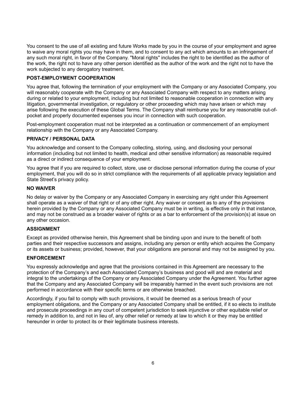 6 You consent to the use of all existing and future Works made by you in the course of your employment and agree to waive any moral rights you may have in them, and to consent to any act which amounts to an infringement of any such moral right, in favor of the Company. "Moral rights" includes the right to be identified as the author of the work, the right not to have any other person identified as the author of the work and the right not to have the work subjected to any derogatory treatment. POST-EMPLOYMENT COOPERATION You agree that, following the termination of your employment with the Company or any Associated Company, you will reasonably cooperate with the Company or any Associated Company with respect to any matters arising during or related to your employment, including but not limited to reasonable cooperation in connection with any litigation, governmental investigation, or regulatory or other proceeding which may have arisen or which may arise following the execution of these Global Terms. The Company shall reimburse you for any reasonable out-of- pocket and properly documented expenses you incur in connection with such cooperation. Post-employment cooperation must not be interpreted as a continuation or commencement of an employment relationship with the Company or any Associated Company. PRIVACY / PERSONAL DATA You acknowledge and consent to the Company collecting, storing, using, and disclosing your personal information (including but not limited to health, medical and other sensitive information) as reasonable required as a direct or indirect consequence of your employment. You agree that if you are required to collect, store, use or disclose personal information during the course of your employment, that you will do so in strict compliance with the requirements of all applicable privacy legislation and State Street’s privacy policy. NO WAIVER No delay or waiver by the Company or any Associated Company in exercising any right under this Agreement shall operate as a waiver of that right or of any other right. Any waiver or consent as to any of the provisions herein provided by the Company or any Associated Company must be in writing, is effective only in that instance, and may not be construed as a broader waiver of rights or as a bar to enforcement of the provision(s) at issue on any other occasion. ASSIGNMENT Except as provided otherwise herein, this Agreement shall be binding upon and inure to the benefit of both parties and their respective successors and assigns, including any person or entity which acquires the Company or its assets or business; provided, however, that your obligations are personal and may not be assigned by you. ENFORCEMENT You expressly acknowledge and agree that the provisions contained in this Agreement are necessary to the protection of the Company’s and each Associated Company’s business and good will and are material and integral to the undertakings of the Company or any Associated Company under the Agreement. You further agree that the Company and any Associated Company will be irreparably harmed in the event such provisions are not performed in accordance with their specific terms or are otherwise breached. Accordingly, if you fail to comply with such provisions, it would be deemed as a serious breach of your employment obligations, and the Company or any Associated Company shall be entitled, if it so elects to institute and prosecute proceedings in any court of competent jurisdiction to seek injunctive or other equitable relief or remedy in addition to, and not in lieu of, any other relief or remedy at law to which it or they may be entitled hereunder in order to protect its or their legitimate business interests.