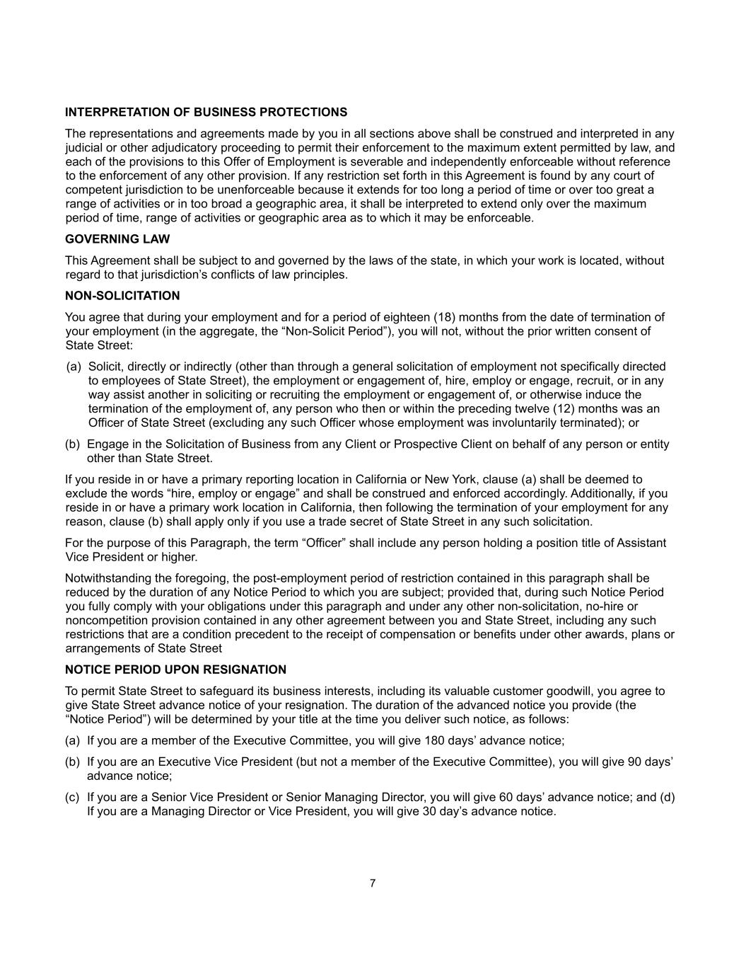 7 INTERPRETATION OF BUSINESS PROTECTIONS The representations and agreements made by you in all sections above shall be construed and interpreted in any judicial or other adjudicatory proceeding to permit their enforcement to the maximum extent permitted by law, and each of the provisions to this Offer of Employment is severable and independently enforceable without reference to the enforcement of any other provision. If any restriction set forth in this Agreement is found by any court of competent jurisdiction to be unenforceable because it extends for too long a period of time or over too great a range of activities or in too broad a geographic area, it shall be interpreted to extend only over the maximum period of time, range of activities or geographic area as to which it may be enforceable. GOVERNING LAW This Agreement shall be subject to and governed by the laws of the state, in which your work is located, without regard to that jurisdiction’s conflicts of law principles. NON-SOLICITATION You agree that during your employment and for a period of eighteen (18) months from the date of termination of your employment (in the aggregate, the “Non-Solicit Period”), you will not, without the prior written consent of State Street: (a) Solicit, directly or indirectly (other than through a general solicitation of employment not specifically directed to employees of State Street), the employment or engagement of, hire, employ or engage, recruit, or in any way assist another in soliciting or recruiting the employment or engagement of, or otherwise induce the termination of the employment of, any person who then or within the preceding twelve (12) months was an Officer of State Street (excluding any such Officer whose employment was involuntarily terminated); or (b) Engage in the Solicitation of Business from any Client or Prospective Client on behalf of any person or entity other than State Street. If you reside in or have a primary reporting location in California or New York, clause (a) shall be deemed to exclude the words “hire, employ or engage” and shall be construed and enforced accordingly. Additionally, if you reside in or have a primary work location in California, then following the termination of your employment for any reason, clause (b) shall apply only if you use a trade secret of State Street in any such solicitation. For the purpose of this Paragraph, the term “Officer” shall include any person holding a position title of Assistant Vice President or higher. Notwithstanding the foregoing, the post-employment period of restriction contained in this paragraph shall be reduced by the duration of any Notice Period to which you are subject; provided that, during such Notice Period you fully comply with your obligations under this paragraph and under any other non-solicitation, no-hire or noncompetition provision contained in any other agreement between you and State Street, including any such restrictions that are a condition precedent to the receipt of compensation or benefits under other awards, plans or arrangements of State Street NOTICE PERIOD UPON RESIGNATION To permit State Street to safeguard its business interests, including its valuable customer goodwill, you agree to give State Street advance notice of your resignation. The duration of the advanced notice you provide (the “Notice Period”) will be determined by your title at the time you deliver such notice, as follows: (a) If you are a member of the Executive Committee, you will give 180 days’ advance notice; (b) If you are an Executive Vice President (but not a member of the Executive Committee), you will give 90 days’ advance notice; (c) If you are a Senior Vice President or Senior Managing Director, you will give 60 days’ advance notice; and (d) If you are a Managing Director or Vice President, you will give 30 day’s advance notice.