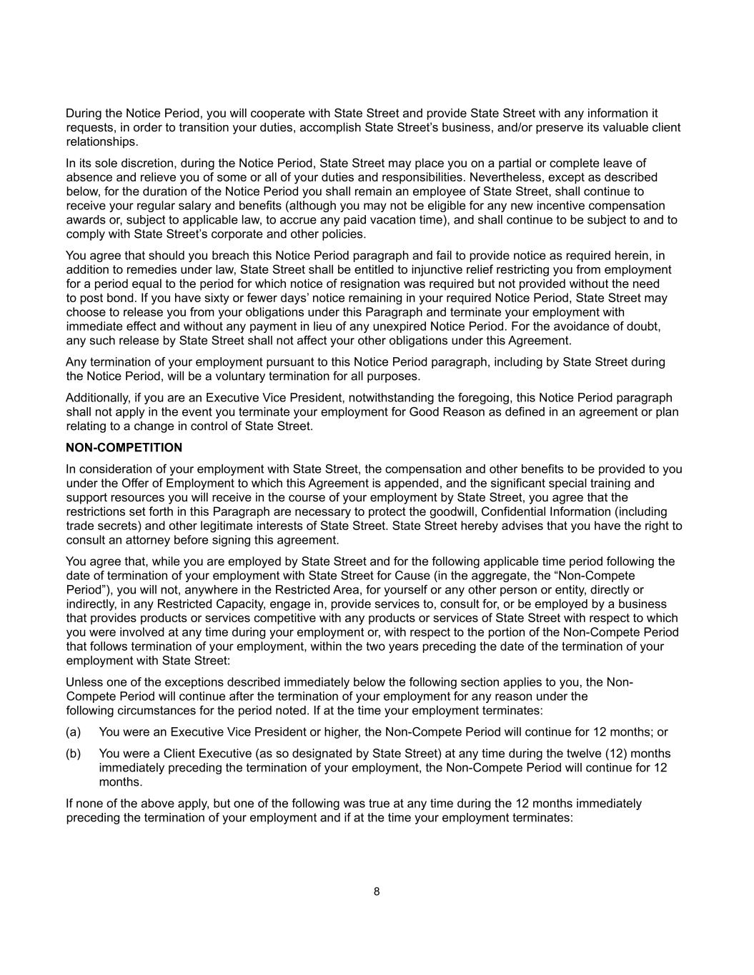 8 During the Notice Period, you will cooperate with State Street and provide State Street with any information it requests, in order to transition your duties, accomplish State Street’s business, and/or preserve its valuable client relationships. In its sole discretion, during the Notice Period, State Street may place you on a partial or complete leave of absence and relieve you of some or all of your duties and responsibilities. Nevertheless, except as described below, for the duration of the Notice Period you shall remain an employee of State Street, shall continue to receive your regular salary and benefits (although you may not be eligible for any new incentive compensation awards or, subject to applicable law, to accrue any paid vacation time), and shall continue to be subject to and to comply with State Street’s corporate and other policies. You agree that should you breach this Notice Period paragraph and fail to provide notice as required herein, in addition to remedies under law, State Street shall be entitled to injunctive relief restricting you from employment for a period equal to the period for which notice of resignation was required but not provided without the need to post bond. If you have sixty or fewer days’ notice remaining in your required Notice Period, State Street may choose to release you from your obligations under this Paragraph and terminate your employment with immediate effect and without any payment in lieu of any unexpired Notice Period. For the avoidance of doubt, any such release by State Street shall not affect your other obligations under this Agreement. Any termination of your employment pursuant to this Notice Period paragraph, including by State Street during the Notice Period, will be a voluntary termination for all purposes. Additionally, if you are an Executive Vice President, notwithstanding the foregoing, this Notice Period paragraph shall not apply in the event you terminate your employment for Good Reason as defined in an agreement or plan relating to a change in control of State Street. NON-COMPETITION In consideration of your employment with State Street, the compensation and other benefits to be provided to you under the Offer of Employment to which this Agreement is appended, and the significant special training and support resources you will receive in the course of your employment by State Street, you agree that the restrictions set forth in this Paragraph are necessary to protect the goodwill, Confidential Information (including trade secrets) and other legitimate interests of State Street. State Street hereby advises that you have the right to consult an attorney before signing this agreement. You agree that, while you are employed by State Street and for the following applicable time period following the date of termination of your employment with State Street for Cause (in the aggregate, the “Non-Compete Period”), you will not, anywhere in the Restricted Area, for yourself or any other person or entity, directly or indirectly, in any Restricted Capacity, engage in, provide services to, consult for, or be employed by a business that provides products or services competitive with any products or services of State Street with respect to which you were involved at any time during your employment or, with respect to the portion of the Non-Compete Period that follows termination of your employment, within the two years preceding the date of the termination of your employment with State Street: Unless one of the exceptions described immediately below the following section applies to you, the Non- Compete Period will continue after the termination of your employment for any reason under the following circumstances for the period noted. If at the time your employment terminates: (a) You were an Executive Vice President or higher, the Non-Compete Period will continue for 12 months; or (b) You were a Client Executive (as so designated by State Street) at any time during the twelve (12) months immediately preceding the termination of your employment, the Non-Compete Period will continue for 12 months. If none of the above apply, but one of the following was true at any time during the 12 months immediately preceding the termination of your employment and if at the time your employment terminates: