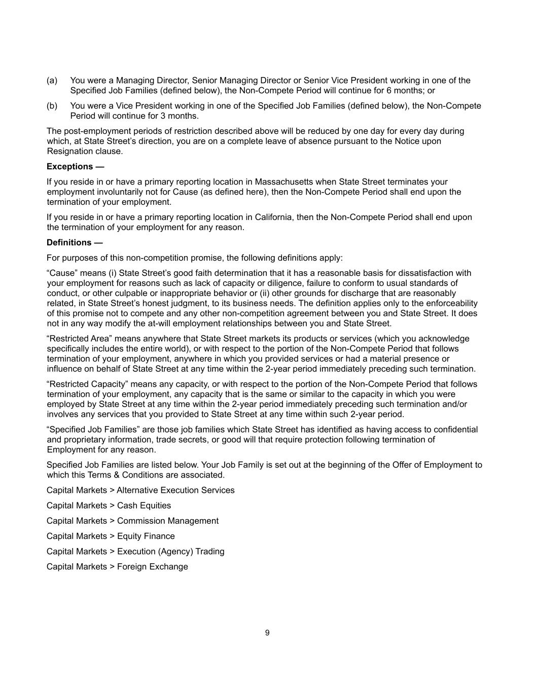 9 (a) You were a Managing Director, Senior Managing Director or Senior Vice President working in one of the Specified Job Families (defined below), the Non-Compete Period will continue for 6 months; or (b) You were a Vice President working in one of the Specified Job Families (defined below), the Non-Compete Period will continue for 3 months. The post-employment periods of restriction described above will be reduced by one day for every day during which, at State Street’s direction, you are on a complete leave of absence pursuant to the Notice upon Resignation clause. Exceptions — If you reside in or have a primary reporting location in Massachusetts when State Street terminates your employment involuntarily not for Cause (as defined here), then the Non-Compete Period shall end upon the termination of your employment. If you reside in or have a primary reporting location in California, then the Non-Compete Period shall end upon the termination of your employment for any reason. Definitions — For purposes of this non-competition promise, the following definitions apply: “Cause” means (i) State Street’s good faith determination that it has a reasonable basis for dissatisfaction with your employment for reasons such as lack of capacity or diligence, failure to conform to usual standards of conduct, or other culpable or inappropriate behavior or (ii) other grounds for discharge that are reasonably related, in State Street’s honest judgment, to its business needs. The definition applies only to the enforceability of this promise not to compete and any other non-competition agreement between you and State Street. It does not in any way modify the at-will employment relationships between you and State Street. “Restricted Area” means anywhere that State Street markets its products or services (which you acknowledge specifically includes the entire world), or with respect to the portion of the Non-Compete Period that follows termination of your employment, anywhere in which you provided services or had a material presence or influence on behalf of State Street at any time within the 2-year period immediately preceding such termination. “Restricted Capacity” means any capacity, or with respect to the portion of the Non-Compete Period that follows termination of your employment, any capacity that is the same or similar to the capacity in which you were employed by State Street at any time within the 2-year period immediately preceding such termination and/or involves any services that you provided to State Street at any time within such 2-year period. “Specified Job Families” are those job families which State Street has identified as having access to confidential and proprietary information, trade secrets, or good will that require protection following termination of Employment for any reason. Specified Job Families are listed below. Your Job Family is set out at the beginning of the Offer of Employment to which this Terms & Conditions are associated. Capital Markets > Alternative Execution Services Capital Markets > Cash Equities Capital Markets > Commission Management Capital Markets > Equity Finance Capital Markets > Execution (Agency) Trading Capital Markets > Foreign Exchange