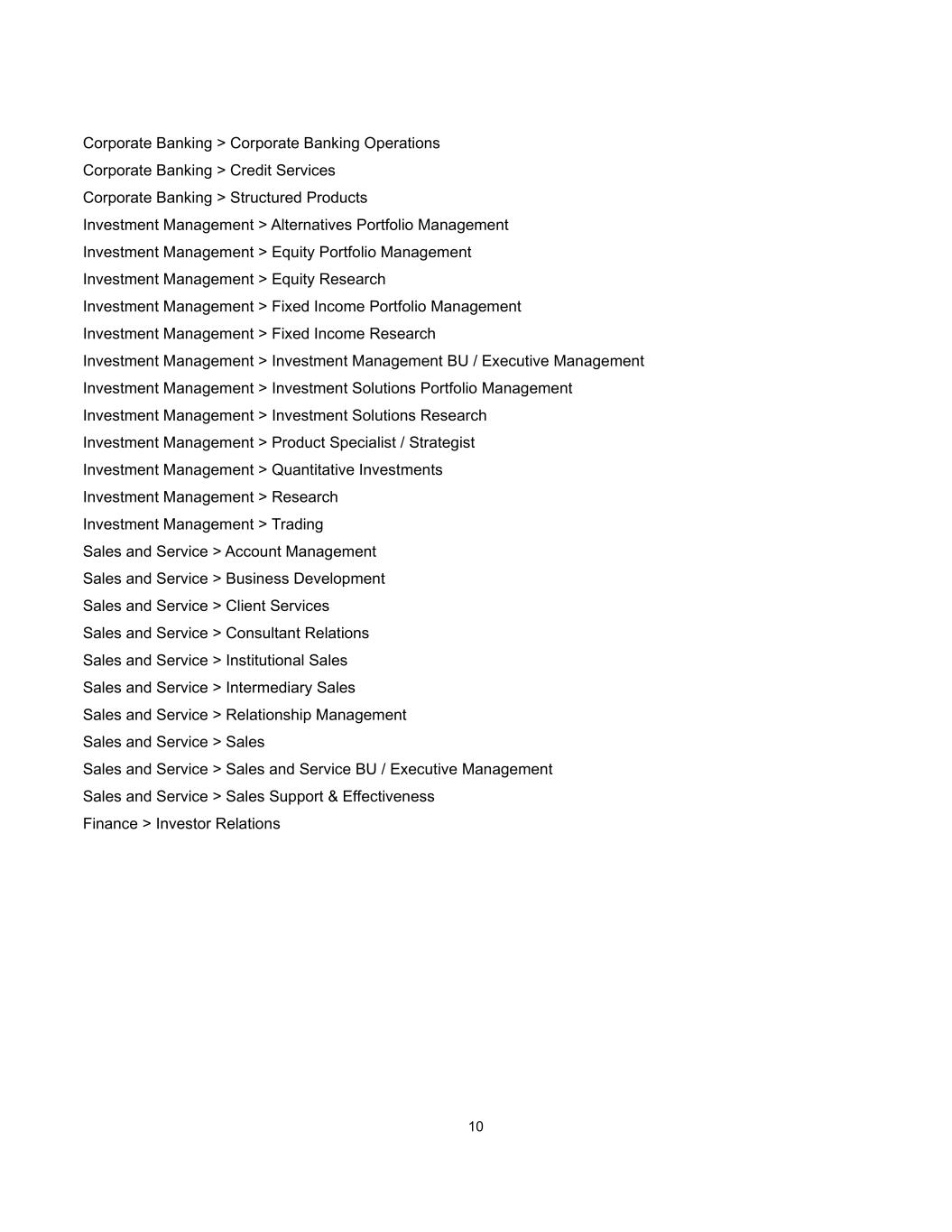 10 Corporate Banking > Corporate Banking Operations Corporate Banking > Credit Services Corporate Banking > Structured Products Investment Management > Alternatives Portfolio Management Investment Management > Equity Portfolio Management Investment Management > Equity Research Investment Management > Fixed Income Portfolio Management Investment Management > Fixed Income Research Investment Management > Investment Management BU / Executive Management Investment Management > Investment Solutions Portfolio Management Investment Management > Investment Solutions Research Investment Management > Product Specialist / Strategist Investment Management > Quantitative Investments Investment Management > Research Investment Management > Trading Sales and Service > Account Management Sales and Service > Business Development Sales and Service > Client Services Sales and Service > Consultant Relations Sales and Service > Institutional Sales Sales and Service > Intermediary Sales Sales and Service > Relationship Management Sales and Service > Sales Sales and Service > Sales and Service BU / Executive Management Sales and Service > Sales Support & Effectiveness Finance > Investor Relations