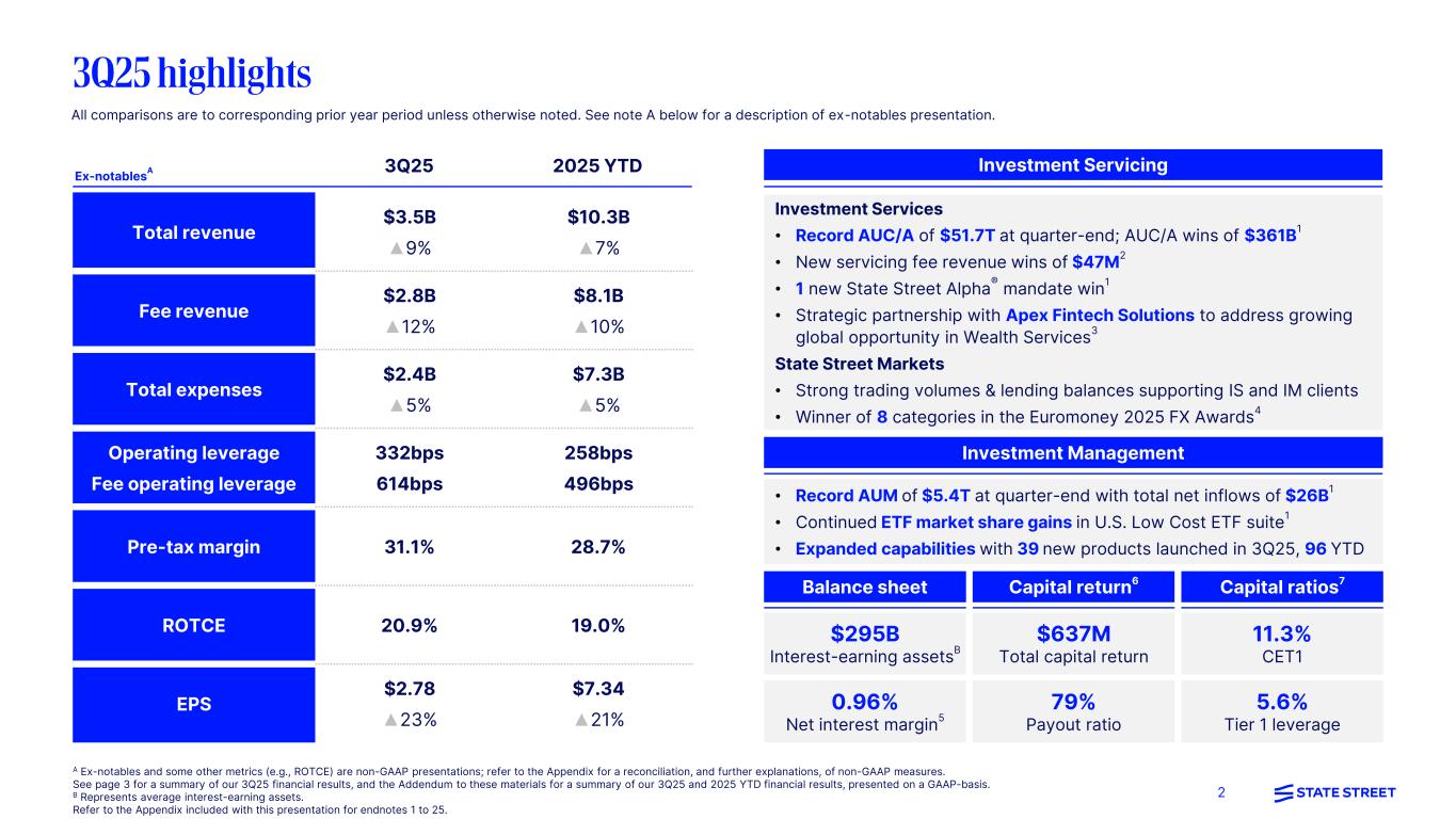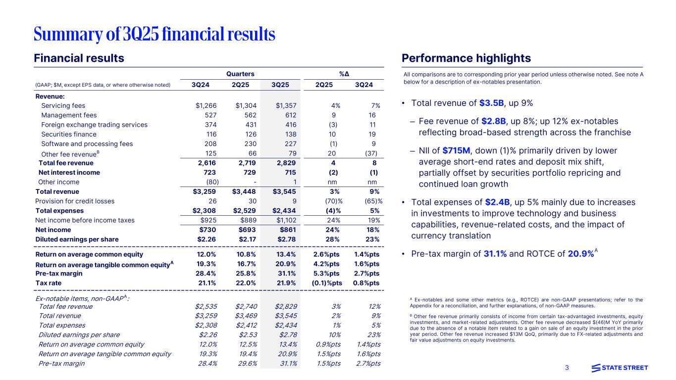 2 A Ex-notables and some other metrics (e.g., ROTCE) are non-GAAP presentations; refer to the Appendix for a reconciliation, and further explanations, of non-GAAP measures. See page 3 for a summary of our 3Q25 financial results, and the Addendum to these materials for a summary of our 3Q25 and 2025 YTD financial results, presented on a GAAP-basis. B Represents average interest-earning assets. Refer to the Appendix included with this presentation for endnotes 1 to 25. All comparisons are to corresponding prior year period unless otherwise noted. See note A below for a description of ex-notables presentation. • Record AUM of $5.4T at quarter-end with total net inflows of $26B1 • Continued ETF market share gains in U.S. Low Cost ETF suite1 • Expanded capabilities with 39 new products launched in 3Q25, 96 YTD Investment Management $637M Total capital return Capital return6 79% Payout ratio Capital ratios7 5.6% Tier 1 leverage 11.3% CET1 $295B Interest-earning assetsB 0.96% Net interest margin5 Balance sheet Investment Services • Record AUC/A of $51.7T at quarter-end; AUC/A wins of $361B1 • New servicing fee revenue wins of $47M2 • 1 new State Street Alpha® mandate win1 • Strategic partnership with Apex Fintech Solutions to address growing global opportunity in Wealth Services3 State Street Markets • Strong trading volumes & lending balances supporting IS and IM clients • Winner of 8 categories in the Euromoney 2025 FX Awards4 Investment Servicing3Q25 2025 YTD Total revenue $3.5B ▲9% $10.3B ▲7% Fee revenue $2.8B ▲12% $8.1B ▲10% Total expenses $2.4B ▲5% $7.3B ▲5% Operating leverage Fee operating leverage 332bps 614bps 258bps 496bps Pre-tax margin 31.1% 28.7% ROTCE 20.9% 19.0% EPS $2.78 ▲23% $7.34 ▲21% Ex-notablesA