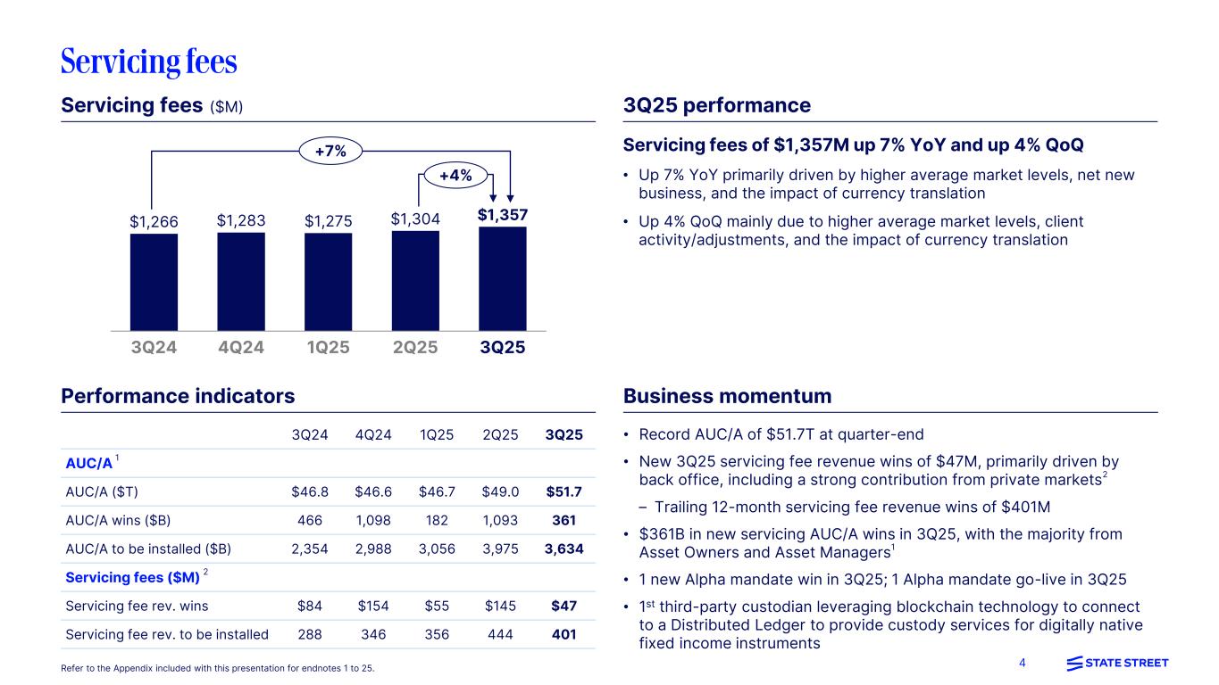3 • Total revenue of $3.5B, up 9% – Fee revenue of $2.8B, up 8%; up 12% ex-notables reflecting broad-based strength across the franchise – NII of $715M, down (1)% primarily driven by lower average short-end rates and deposit mix shift, partially offset by securities portfolio repricing and continued loan growth • Total expenses of $2.4B, up 5% mainly due to increases in investments to improve technology and business capabilities, revenue-related costs, and the impact of currency translation • Pre-tax margin of 31.1% and ROTCE of 20.9%A All comparisons are to corresponding prior year period unless otherwise noted. See note A below for a description of ex-notables presentation. Financial results Performance highlights A Ex-notables and some other metrics (e.g., ROTCE) are non-GAAP presentations; refer to the Appendix for a reconciliation, and further explanations, of non-GAAP measures. B Other fee revenue primarily consists of income from certain tax-advantaged investments, equity investments, and market-related adjustments. Other fee revenue decreased $(46)M YoY primarily due to the absence of a notable item related to a gain on sale of an equity investment in the prior year period. Other fee revenue increased $13M QoQ, primarily due to FX-related adjustments and fair value adjustments on equity investments. (GAAP; $M, except EPS data, or where otherwise noted) 3Q24 2Q25 3Q25 2Q25 3Q24 Revenue: Servicing fees $1,266 $1,304 $1,357 4% 7% Management fees 527 562 612 9 16 Foreign exchange trading services 374 431 416 (3) 11 Securities finance 116 126 138 10 19 Software and processing fees 208 230 227 (1) 9 Other fee revenueB 125 66 79 20 (37) Total fee revenue 2,616 2,719 2,829 4 8 Net interest income 723 729 715 (2) (1) Other income (80) - 1 nm nm Total revenue $3,259 $3,448 $3,545 3% 9% Provision for credit losses 26 30 9 (70)% (65)% Total expenses $2,308 $2,529 $2,434 (4)% 5% Net income before income taxes $925 $889 $1,102 24% 19% Net income $730 $693 $861 24% 18% Diluted earnings per share $2.26 $2.17 $2.78 28% 23% Return on average common equity 12.0% 10.8% 13.4% 2.6%pts 1.4%pts Return on average tangible common equityA 19.3% 16.7% 20.9% 4.2%pts 1.6%pts Pre-tax margin 28.4% 25.8% 31.1% 5.3%pts 2.7%pts Tax rate 21.1% 22.0% 21.9% (0.1)%pts 0.8%pts Ex-notable items, non-GAAP A: Total fee revenue $2,535 $2,740 $2,829 3% 12% Total revenue $3,259 $3,469 $3,545 2% 9% Total expenses $2,308 $2,412 $2,434 1% 5% Diluted earnings per share $2.26 $2.53 $2.78 10% 23% Return on average common equity 12.0% 12.5% 13.4% 0.9%pts 1.4%pts Return on average tangible common equity 19.3% 19.4% 20.9% 1.5%pts 1.6%pts Pre-tax margin 28.4% 29.6% 31.1% 1.5%pts 2.7%pts Quarters %∆