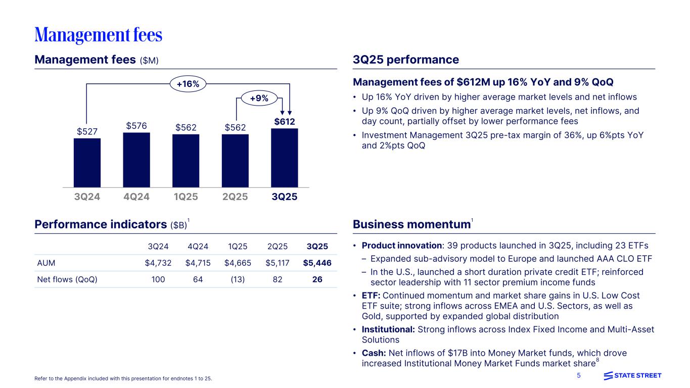 4Refer to the Appendix included with this presentation for endnotes 1 to 25. 3Q24 4Q24 1Q25 2Q25 3Q25 $1,266 $1,283 $1,275 $1,304 $1,357 +7% +4% 3Q24 4Q24 1Q25 2Q25 3Q25 AUC/A 1 AUC/A ($T) $46.8 $46.6 $46.7 $49.0 $51.7 AUC/A wins ($B) 466 1,098 182 1,093 361 AUC/A to be installed ($B) 2,354 2,988 3,056 3,975 3,634 Servicing fees ($M) 2 Servicing fee rev. wins $84 $154 $55 $145 $47 Servicing fee rev. to be installed 288 346 356 444 401 Servicing fees of $1,357M up 7% YoY and up 4% QoQ • Up 7% YoY primarily driven by higher average market levels, net new business, and the impact of currency translation • Up 4% QoQ mainly due to higher average market levels, client activity/adjustments, and the impact of currency translation • Record AUC/A of $51.7T at quarter-end • New 3Q25 servicing fee revenue wins of $47M, primarily driven by back office, including a strong contribution from private markets2 – Trailing 12-month servicing fee revenue wins of $401M • $361B in new servicing AUC/A wins in 3Q25, with the majority from Asset Owners and Asset Managers1 • 1 new Alpha mandate win in 3Q25; 1 Alpha mandate go-live in 3Q25 • 1st third-party custodian leveraging blockchain technology to connect to a Distributed Ledger to provide custody services for digitally native fixed income instruments Performance indicators Business momentum 3Q25 performanceServicing fees ($M)