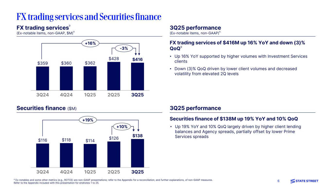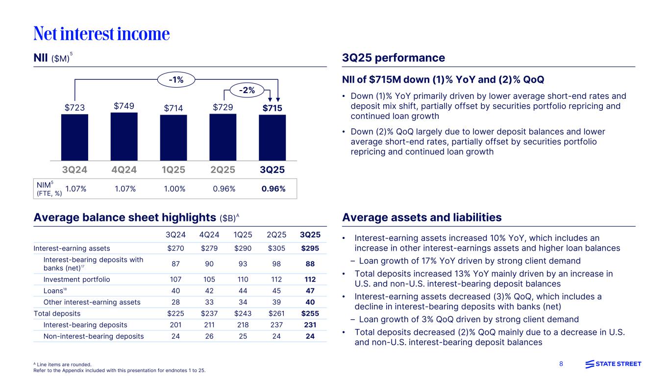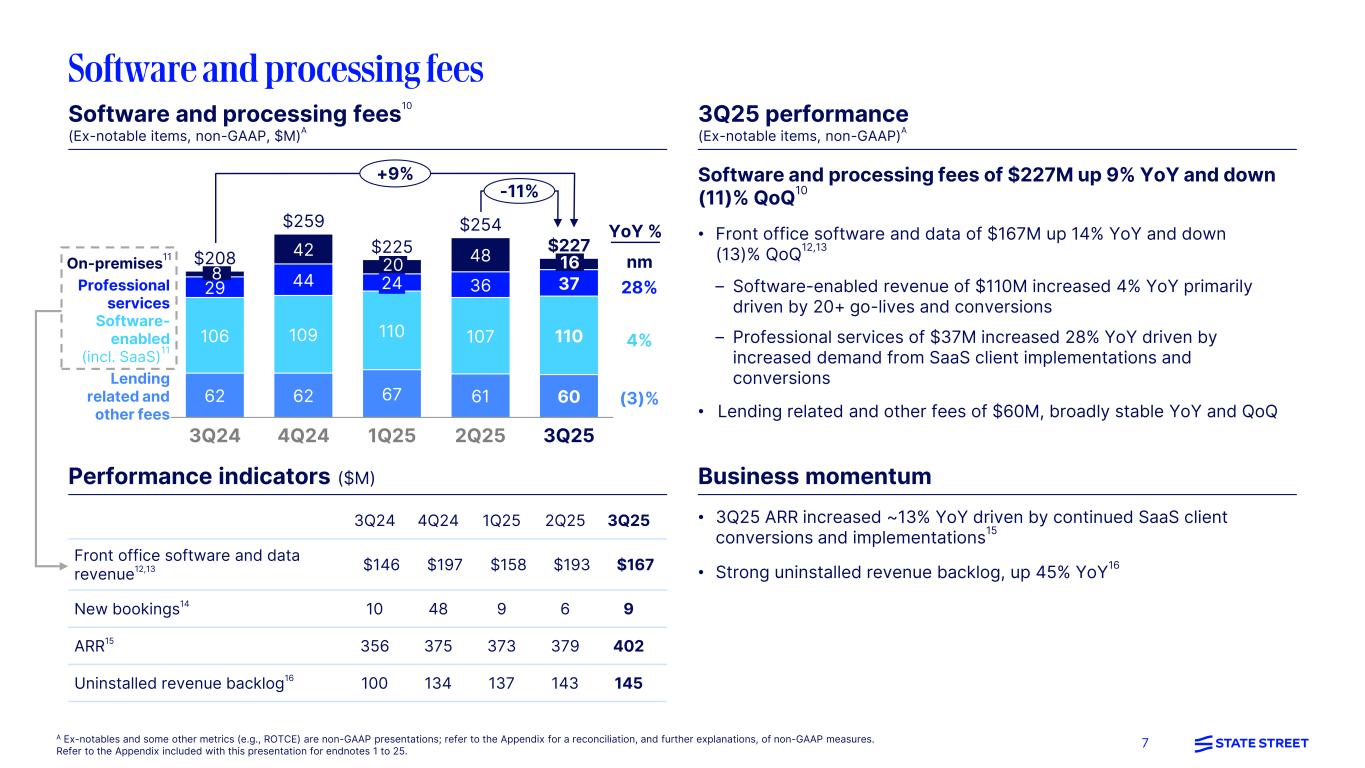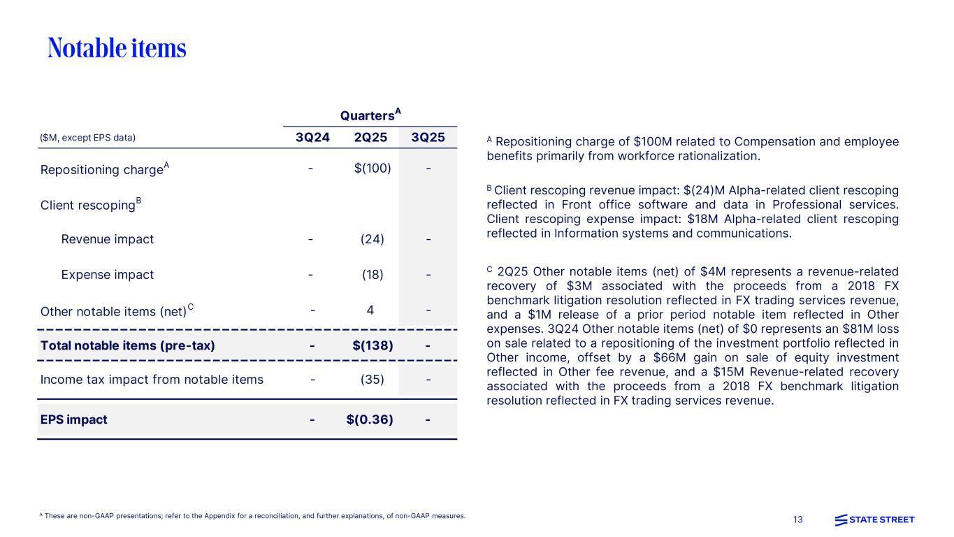 17 10. Software and processing fees of $227M in 3Q25 was up 9% compared to 3Q24 Software and processing fees of $208M. Software and processing fees of $230M in 2Q25 included a notable item related to an Alpha- related client rescoping of $24M. Excluding the notable item, 3Q25 Software and processing fees of $227M was down (11)% compared to 2Q25 adjusted Software and processing fees of $254M. 11. On-premises revenue is revenue derived from locally installed software. Software-enabled revenue includes SaaS, maintenance and support revenue, FIX, brokerage, and value-add services. The revenue recognition pattern for On-premises installations differs from software-enabled revenue. 12. Front office software and data revenue primarily includes revenue from CRD, Alpha Data Platform and Alpha Data Services. Includes Other revenue of $3-4M in each of 3Q24 through 3Q25. Revenue line items may not sum to total due to rounding. 13. Front office software and data of $167M in 3Q25 was up 14% compared to 3Q24 Front office software and data of $146M. Front office software and data of $169M in 2Q25 included a notable item related to an Alpha- related client rescoping of $24M. Excluding the notable item, 3Q25 Front office software and data of $167M was down (13)% compared to 2Q25 adjusted Front office software and data of $193M. 14. Front office bookings represent signed ARR contract values for CRD, CRD for Private Markets, Alpha Data Platform, and Alpha Data Services excluding bookings with affiliates, including State Street Investment Management. Front office revenue derived from affiliate agreements is eliminated in consolidation for financial reporting purposes. 15. Front office software and data annual recurring revenue (ARR), an operating metric, is calculated by annualizing current quarter revenue for CRD and CRD for Private Markets and includes the annualized amount of most software-enabled revenue, including revenue generated from SaaS, maintenance and support revenue, FIX, and value-added services, which are all expected to be recognized ratably over the term of client contracts. Front office software and data ARR does not include software-enabled brokerage revenue, revenue from affiliates and licensing fees (excluding the portion allocated to maintenance and support) from On-premises software. 16. Represents expected ARR from signed client contracts that are scheduled to be largely installed over the next 24 months for CRD, CRD for Private Markets and Alpha Data Services. It includes SaaS revenue, as well as maintenance and support revenue, and excludes the one-time impact of On-premises license revenue, revenue generated from FIX, brokerage, value-add services, and professional services as well as revenue from affiliates. 17. These deposits primarily reflect our maintenance of cash balances at the Federal Reserve, the ECB and other non-U.S. central banks. 18. Average loans are presented on a gross basis. Refer to the Addendum for average loans net of expected credit losses. 19. Compensation and employee benefits expenses of $1,280M in 2Q25 included a notable item related to a repositioning charge of $100M. Excluding this notable item, 3Q25 Compensation and employee benefits of $1,162M was down (2)% compared to 2Q25 adjusted Compensation and employee benefits of $1,180M. Information systems and communications expenses of $523M in 2Q25 included a notable item reflecting an Alpha- related client rescoping of $18M. Excluding this notable item, 3Q25 Information systems and communications expenses of $517M was up 2% compared to 2Q25 adjusted Information systems and communications expenses of $505M. 20. Other, excluding notable items, includes Other expenses and Amortization of intangible assets. 21. The SCB of 2.5% effective on October 1, 2025 is calculated based upon the results of the 2025 Federal Reserve supervisory stress test. 22. Adjusted average assets (Tier 1) is equal to average consolidated assets less applicable Tier 1 leverage capital reductions under regulatory standards. 23. The Tier 1 leverage ratio differs from the SLR primarily in that the denominator of the Tier 1 leverage ratio is a quarterly average of on-balance sheet assets, while the SLR additionally includes off-balance sheet exposures. In addition, STT’s SLR includes regulatory deductions. Refer to the Addendum for additional information on regulatory capital. 24. State Street Corporation LCR in 3Q25 decreased 1% QoQ to ~106%; State Street Bank and Trust's (SSBT) LCR is significantly higher than State Street Corporation's (SSC) LCR, primarily due to application of the transferability restriction in the U.S. LCR Final Rule to the calculation of SSC’s LCR. This restriction limits the amount of HQLA held at SSC’s principal banking subsidiary, SSBT, and available for the calculation of SSC’s LCR to the amount of net cash outflows of SSBT. This transferability restriction does not apply in the calculation of SSBT’s LCR, and therefore SSBT’s LCR reflects the full benefit of all of its HQLA holdings. 25. As a U.S. G-SIB, State Street must maintain a 2% SLR buffer at the holding company and a 3% buffer at State Street Bank in order to avoid any limitations on distributions to shareholders and discretionary bonus payments to certain executives.