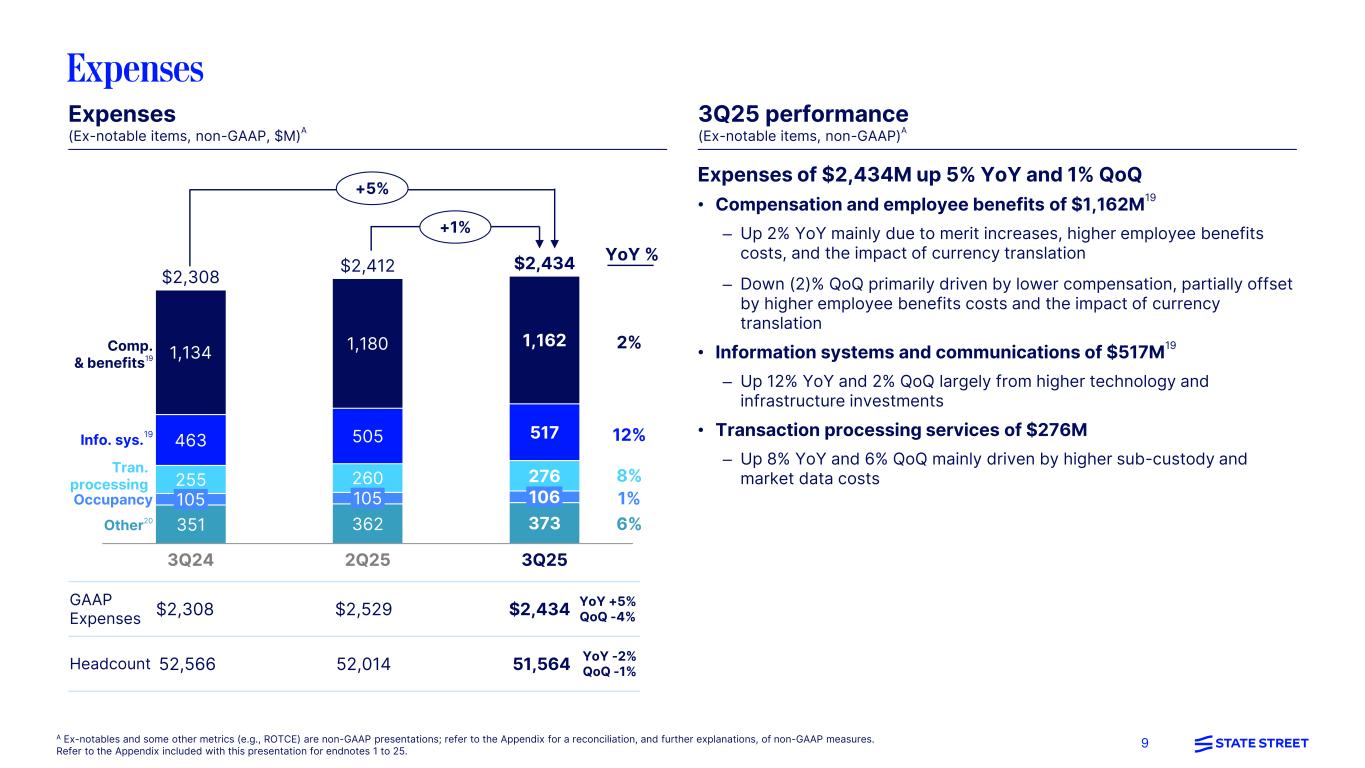 9 Expenses of $2,434M up 5% YoY and 1% QoQ • Compensation and employee benefits of $1,162M19 – Up 2% YoY mainly due to merit increases, higher employee benefits costs, and the impact of currency translation – Down (2)% QoQ primarily driven by lower compensation, partially offset by higher employee benefits costs and the impact of currency translation • Information systems and communications of $517M19 – Up 12% YoY and 2% QoQ largely from higher technology and infrastructure investments • Transaction processing services of $276M – Up 8% YoY and 6% QoQ mainly driven by higher sub-custody and market data costs 351 362 373 255 260 276 463 505 517 1,134 1,180 1,162 105 3Q24 105 2Q25 106 3Q25 $2,308 $2,412 $2,434 Comp. & benefits19 Info. sys.19 Tran. processing Other20 Occupancy +5% +1% 2% 12% 8% YoY % 1% 6% $2,308 $2,529 $2,434 52,566 52,014 51,564 GAAP Expenses Headcount YoY +5% QoQ -4% YoY -2% QoQ -1% A Ex-notables and some other metrics (e.g., ROTCE) are non-GAAP presentations; refer to the Appendix for a reconciliation, and further explanations, of non-GAAP measures. Refer to the Appendix included with this presentation for endnotes 1 to 25. Expenses (Ex-notable items, non-GAAP, $M)A 3Q25 performance (Ex-notable items, non-GAAP)A
