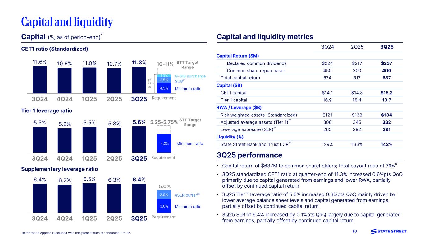 10 eSLR buffer25 • Capital return of $637M to common shareholders; total payout ratio of 79%6 • 3Q25 standardized CET1 ratio at quarter-end of 11.3% increased 0.6%pts QoQ primarily due to capital generated from earnings and lower RWA, partially offset by continued capital return • 3Q25 Tier 1 leverage ratio of 5.6% increased 0.3%pts QoQ mainly driven by lower average balance sheet levels and capital generated from earnings, partially offset by continued capital return • 3Q25 SLR of 6.4% increased by 0.1%pts QoQ largely due to capital generated from earnings, partially offset by continued capital return 3Q24 2Q25 3Q25 Capital Return ($M) Declared common dividends $224 $217 $237 Common share repurchases 450 300 400 Total capital return 674 517 637 Capital ($B) CET1 capital $14.1 $14.8 $15.2 Tier 1 capital 16.9 18.4 18.7 RWA / Leverage ($B) Risk weighted assets (Standardized) $121 $138 $134 Adjusted average assets (Tier 1) 22 306 345 332 Leverage exposure (SLR) 23 265 292 291 Liquidity (%) State Street Bank and Trust LCR 24 129% 136% 142% Tier 1 leverage ratio 5.5% 5.2% 5.5% 5.3% 5.6% 3Q24 4Q24 1Q25 2Q25 3Q25 Minimum ratio4.0% STT Target Range5.25-5.75% Refer to the Appendix included with this presentation for endnotes 1 to 25. CET1 ratio (Standardized) 11.6% 10.9% 11.0% 10.7% 11.3% 4.5% 2.5% 3Q24 4Q24 1Q25 2Q25 3Q25 SCB21 Minimum ratio8 .0 % 10-11% G-SIB surcharge1.0% Supplementary leverage ratio Requirement Requirement Requirement 6.4% 6.2% 6.5% 6.3% 6.4% 3.0% 2.0% 3Q24 4Q24 1Q25 2Q25 3Q25 STT Target Range Minimum ratio 5.0% Capital (%, as of period-end) 7 Capital and liquidity metrics 3Q25 performance