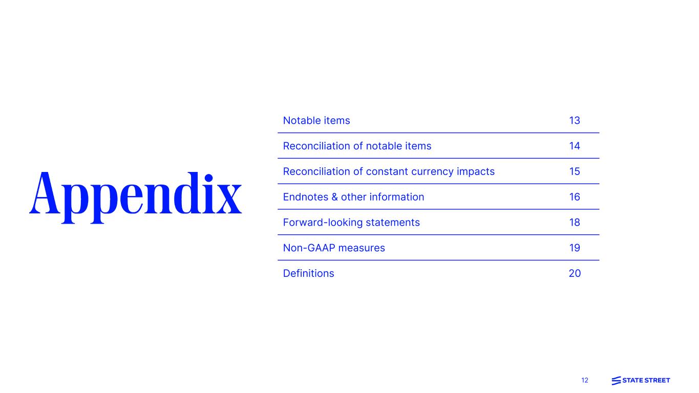 19 In addition to presenting State Street's financial results in conformity with U.S. generally accepted accounting principles, or GAAP, management also presents certain financial information on a basis that excludes or adjusts one or more items from GAAP. This latter basis is a non-GAAP presentation. In general, our non-GAAP financial results adjust selected GAAP-basis financial results to exclude the impact of revenue and expenses outside of State Street’s normal course of business or other notable items, such as acquisition and restructuring charges, repositioning charges, gains/losses on sales, as well as, for selected comparisons, seasonal items. For example, we sometimes present expenses on a basis we may refer to as “expenses ex-notable items", which exclude notable items and, to provide additional perspective on both prior year quarter and sequential quarter comparisons, may also exclude seasonal items. Management believes that this presentation of financial information facilitates an investor's further understanding and analysis of State Street's financial performance and trends with respect to State Street’s business operations from period-to-period, including providing additional insight into our underlying margin and profitability. In addition, Management may also provide additional non-GAAP measures. For example, we may sometimes present ratios, such as return on tangible common equity, based on an adjusted common shareholder equity metric, "tangible common equity", which reflects a reduction (net of deferred taxes) for goodwill and other intangible assets, as we believe this presentation provides additional context about our use of equity. As an additional example, we may present revenue and expense measures on a constant currency basis to identify the significance of changes in foreign currency exchange rates (which often are variable) in period-to-period comparisons. This presentation represents the effects of applying prior period weighted average foreign currency exchange rates to current period results. Non-GAAP financial measures should be considered in addition to, not as a substitute for or superior to, financial measures determined in conformity with GAAP. Refer to the “Reconciliation of notable items” in this Appendix and to the Addendum for reconciliations of our non-GAAP financial information. To access the Addendum go to http://investors.statestreet.com and click on “Filings & Reports – Quarterly Results”.