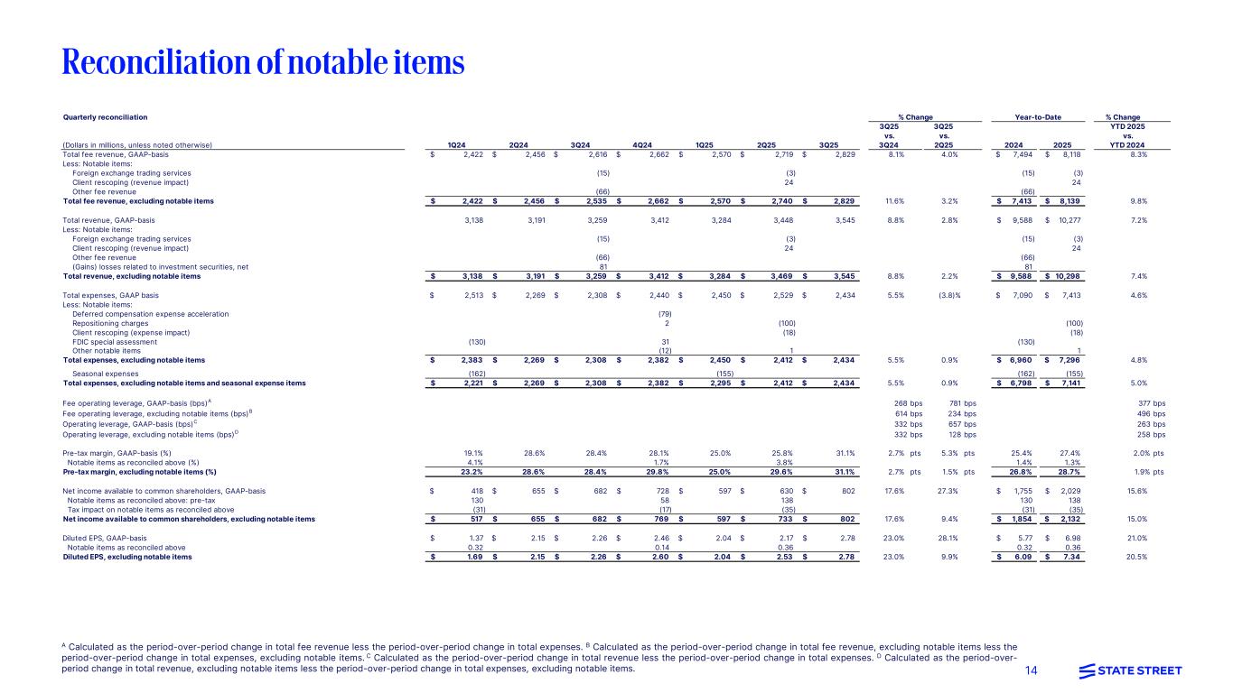 13 A Repositioning charge of $100M related to Compensation and employee benefits primarily from workforce rationalization. B Client rescoping revenue impact: $(24)M Alpha-related client rescoping reflected in Front office software and data in Professional services. Client rescoping expense impact: $18M Alpha-related client rescoping reflected in Information systems and communications. C 2Q25 Other notable items (net) of $4M represents a revenue-related recovery of $3M associated with the proceeds from a 2018 FX benchmark litigation resolution reflected in FX trading services revenue, and a $1M release of a prior period notable item reflected in Other expenses. 3Q24 Other notable items (net) of $0 represents an $81M loss on sale related to a repositioning of the investment portfolio reflected in Other income, offset by a $66M gain on sale of equity investment reflected in Other fee revenue, and a $15M Revenue-related recovery associated with the proceeds from a 2018 FX benchmark litigation resolution reflected in FX trading services revenue. A These are non-GAAP presentations; refer to the Appendix for a reconciliation, and further explanations, of non-GAAP measures. ($M, except EPS data) 3Q24 2Q25 3Q25 Repositioning chargeA - $(100) - Client rescopingB Revenue impact - (24) - Expense impact - (18) - Other notable items (net)C - 4 - Total notable items (pre-tax) - $(138) - Income tax impact from notable items - (35) - EPS impact - $(0.36) - QuartersA