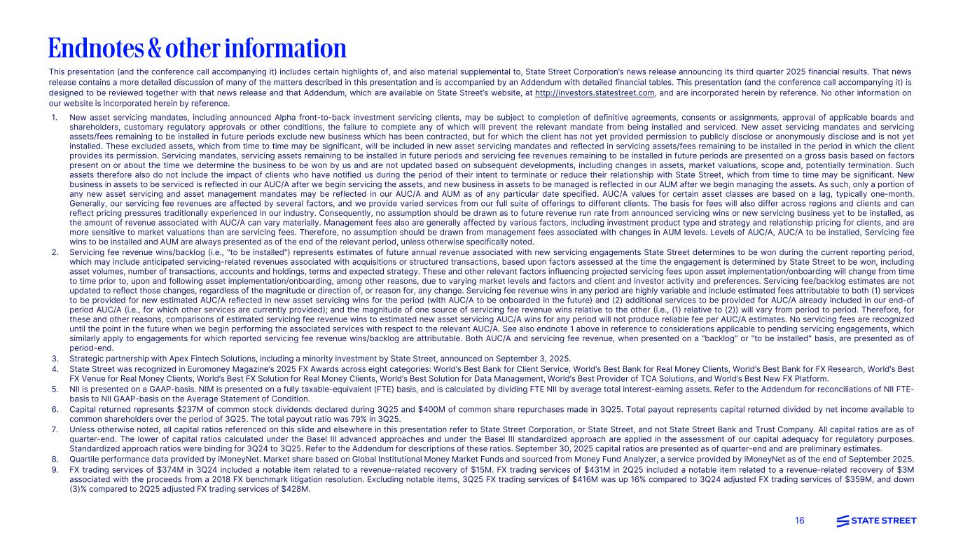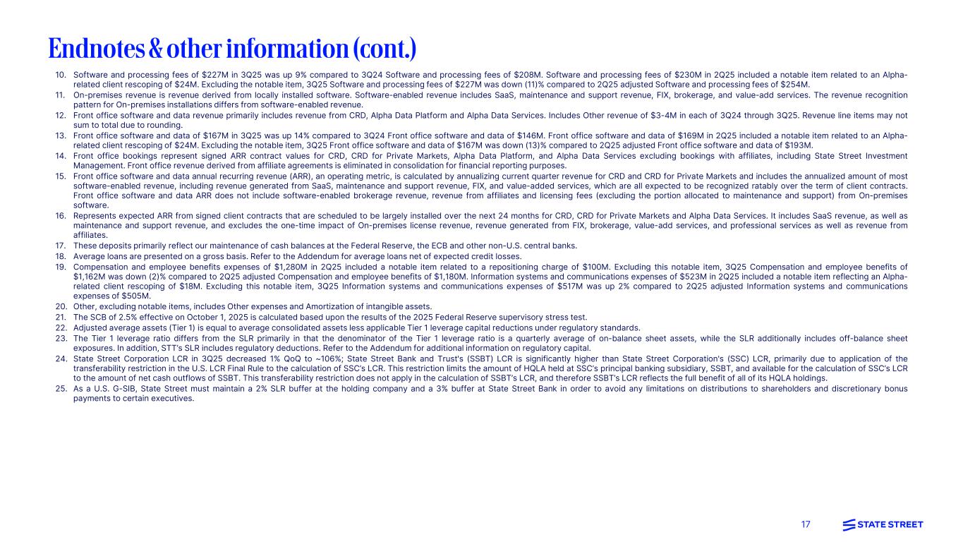 16 This presentation (and the conference call accompanying it) includes certain highlights of, and also material supplemental to, State Street Corporation’s news release announcing its third quarter 2025 financial results. That news release contains a more detailed discussion of many of the matters described in this presentation and is accompanied by an Addendum with detailed financial tables. This presentation (and the conference call accompanying it) is designed to be reviewed together with that news release and that Addendum, which are available on State Street’s website, at http://investors.statestreet.com, and are incorporated herein by reference. No other information on our website is incorporated herein by reference. 1. New asset servicing mandates, including announced Alpha front-to-back investment servicing clients, may be subject to completion of definitive agreements, consents or assignments, approval of applicable boards and shareholders, customary regulatory approvals or other conditions, the failure to complete any of which will prevent the relevant mandate from being installed and serviced. New asset servicing mandates and servicing assets/fees remaining to be installed in future periods exclude new business which has been contracted, but for which the client has not yet provided permission to publicly disclose or anonymously disclose and is not yet installed. These excluded assets, which from time to time may be significant, will be included in new asset servicing mandates and reflected in servicing assets/fees remaining to be installed in the period in which the client provides its permission. Servicing mandates, servicing assets remaining to be installed in future periods and servicing fee revenues remaining to be installed in future periods are presented on a gross basis based on factors present on or about the time we determine the business to be won by us and are not updated based on subsequent developments, including changes in assets, market valuations, scope and, potentially termination. Such assets therefore also do not include the impact of clients who have notified us during the period of their intent to terminate or reduce their relationship with State Street, which from time to time may be significant. New business in assets to be serviced is reflected in our AUC/A after we begin servicing the assets, and new business in assets to be managed is reflected in our AUM after we begin managing the assets. As such, only a portion of any new asset servicing and asset management mandates may be reflected in our AUC/A and AUM as of any particular date specified. AUC/A values for certain asset classes are based on a lag, typically one-month. Generally, our servicing fee revenues are affected by several factors, and we provide varied services from our full suite of offerings to different clients. The basis for fees will also differ across regions and clients and can reflect pricing pressures traditionally experienced in our industry. Consequently, no assumption should be drawn as to future revenue run rate from announced servicing wins or new servicing business yet to be installed, as the amount of revenue associated with AUC/A can vary materially. Management fees also are generally affected by various factors, including investment product type and strategy and relationship pricing for clients, and are more sensitive to market valuations than are servicing fees. Therefore, no assumption should be drawn from management fees associated with changes in AUM levels. Levels of AUC/A, AUC/A to be installed, Servicing fee wins to be installed and AUM are always presented as of the end of the relevant period, unless otherwise specifically noted. 2. Servicing fee revenue wins/backlog (i.e., "to be installed") represents estimates of future annual revenue associated with new servicing engagements State Street determines to be won during the current reporting period, which may include anticipated servicing-related revenues associated with acquisitions or structured transactions, based upon factors assessed at the time the engagement is determined by State Street to be won, including asset volumes, number of transactions, accounts and holdings, terms and expected strategy. These and other relevant factors influencing projected servicing fees upon asset implementation/onboarding will change from time to time prior to, upon and following asset implementation/onboarding, among other reasons, due to varying market levels and factors and client and investor activity and preferences. Servicing fee/backlog estimates are not updated to reflect those changes, regardless of the magnitude or direction of, or reason for, any change. Servicing fee revenue wins in any period are highly variable and include estimated fees attributable to both (1) services to be provided for new estimated AUC/A reflected in new asset servicing wins for the period (with AUC/A to be onboarded in the future) and (2) additional services to be provided for AUC/A already included in our end-of period AUC/A (i.e., for which other services are currently provided); and the magnitude of one source of servicing fee revenue wins relative to the other (i.e., (1) relative to (2)) will vary from period to period. Therefore, for these and other reasons, comparisons of estimated servicing fee revenue wins to estimated new asset servicing AUC/A wins for any period will not produce reliable fee per AUC/A estimates. No servicing fees are recognized until the point in the future when we begin performing the associated services with respect to the relevant AUC/A. See also endnote 1 above in reference to considerations applicable to pending servicing engagements, which similarly apply to engagements for which reported servicing fee revenue wins/backlog are attributable. Both AUC/A and servicing fee revenue, when presented on a "backlog" or "to be installed" basis, are presented as of period-end. 3. Strategic partnership with Apex Fin