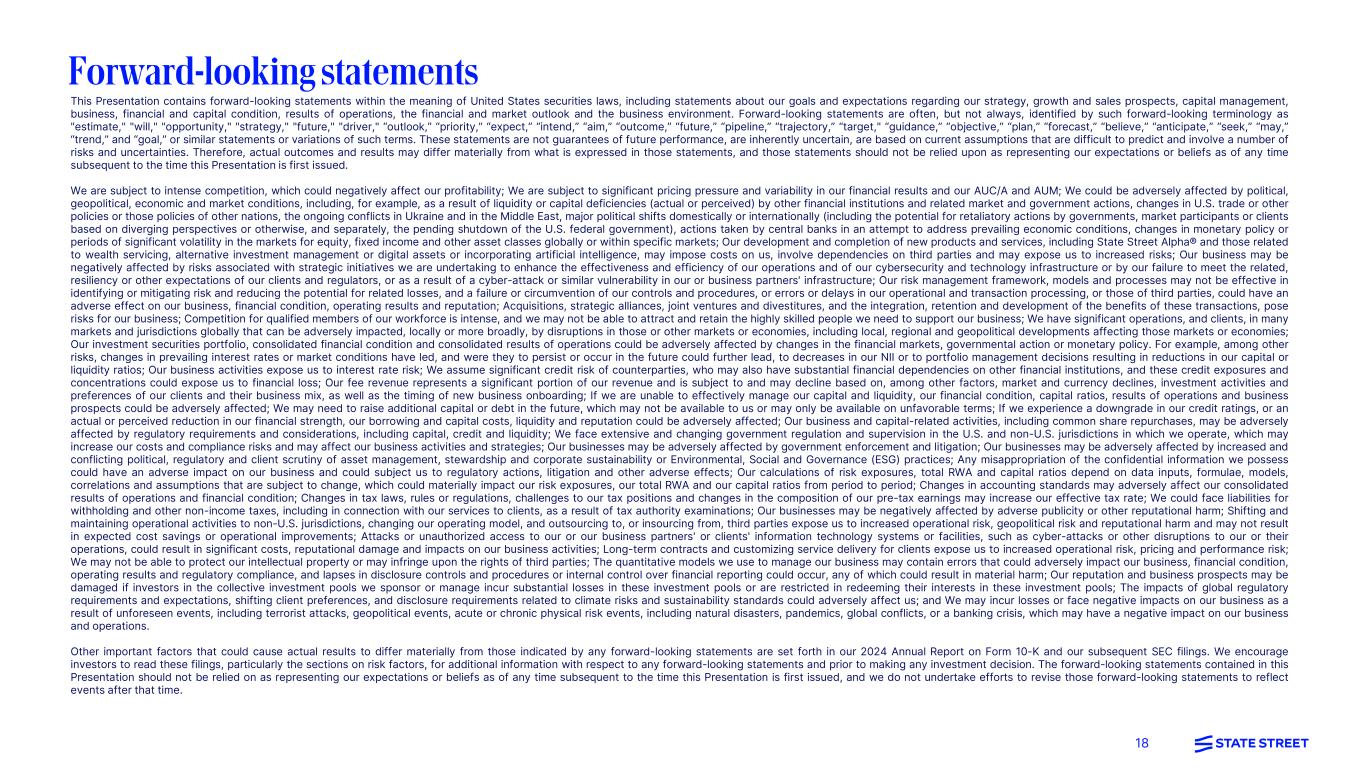 18 This Presentation contains forward-looking statements within the meaning of United States securities laws, including statements about our goals and expectations regarding our strategy, growth and sales prospects, capital management, business, financial and capital condition, results of operations, the financial and market outlook and the business environment. Forward-looking statements are often, but not always, identified by such forward-looking terminology as "estimate," "will," "opportunity," "strategy," "future," "driver," “outlook,” “priority,” “expect,” “intend,” “aim,” “outcome,” “future,” “pipeline,” “trajectory,” “target," “guidance,” “objective,” “plan,” “forecast,” “believe,” “anticipate,” “seek,” “may,” “trend,” and “goal,” or similar statements or variations of such terms. These statements are not guarantees of future performance, are inherently uncertain, are based on current assumptions that are difficult to predict and involve a number of risks and uncertainties. Therefore, actual outcomes and results may differ materially from what is expressed in those statements, and those statements should not be relied upon as representing our expectations or beliefs as of any time subsequent to the time this Presentation is first issued. We are subject to intense competition, which could negatively affect our profitability; We are subject to significant pricing pressure and variability in our financial results and our AUC/A and AUM; We could be adversely affected by political, geopolitical, economic and market conditions, including, for example, as a result of liquidity or capital deficiencies (actual or perceived) by other financial institutions and related market and government actions, changes in U.S. trade or other policies or those policies of other nations, the ongoing conflicts in Ukraine and in the Middle East, major political shifts domestically or internationally (including the potential for retaliatory actions by governments, market participants or clients based on diverging perspectives or otherwise, and separately, the pending shutdown of the U.S. federal government), actions taken by central banks in an attempt to address prevailing economic conditions, changes in monetary policy or periods of significant volatility in the markets for equity, fixed income and other asset classes globally or within specific markets; Our development and completion of new products and services, including State Street Alpha® and those related to wealth servicing, alternative investment management or digital assets or incorporating artificial intelligence, may impose costs on us, involve dependencies on third parties and may expose us to increased risks; Our business may be negatively affected by risks associated with strategic initiatives we are undertaking to enhance the effectiveness and efficiency of our operations and of our cybersecurity and technology infrastructure or by our failure to meet the related, resiliency or other expectations of our clients and regulators, or as a result of a cyber-attack or similar vulnerability in our or business partners' infrastructure; Our risk management framework, models and processes may not be effective in identifying or mitigating risk and reducing the potential for related losses, and a failure or circumvention of our controls and procedures, or errors or delays in our operational and transaction processing, or those of third parties, could have an adverse effect on our business, financial condition, operating results and reputation; Acquisitions, strategic alliances, joint ventures and divestitures, and the integration, retention and development of the benefits of these transactions, pose risks for our business; Competition for qualified members of our workforce is intense, and we may not be able to attract and retain the highly skilled people we need to support our business; We have significant operations, and clients, in many markets and jurisdictions globally that can be adversely impacted, locally or more broadly, by disruptions in those or other markets or economies, including local, regional and geopolitical developments affecting those markets or economies; Our investment securities portfolio, consolidated financial condition and consolidated results of operations could be adversely affected by changes in the financial markets, governmental action or monetary policy. For example, among other risks, changes in prevailing interest rates or market conditions have led, and were they to persist or occur in the future could further lead, to decreases in our NII or to portfolio management decisions resulting in reductions in our capital or liquidity ratios; Our business activities expose us to interest rate risk; We assume significant credit risk of counterparties, who may also have substantial financial dependencies on other financial institutions, and these credit exposures and concentrations could expose us to financial loss; Our fee revenue represents a significant portion of our revenue and is subject to and may decline based on, among other factors, market and currency declines, investment activities and preferences of our clients and their business mix, as well as the timing of new business onboarding; If we are unable to effectively manage our capital and liquidity, our financial condition, capital ratios, results of operations and business prospects could be adversely affected; We may need to raise additional capital or debt in the future, which may not be available to us or may only be available on unfavorable terms; If we experience a downgrade in our credit ratings, or an actual or perceived reduction in our financial strength, our borrowing and capital costs, liquidity and reputation could be adversely affected; Our business and capital-related activities, including common share repurchases, may be adversely affected by regulatory requirements and con
