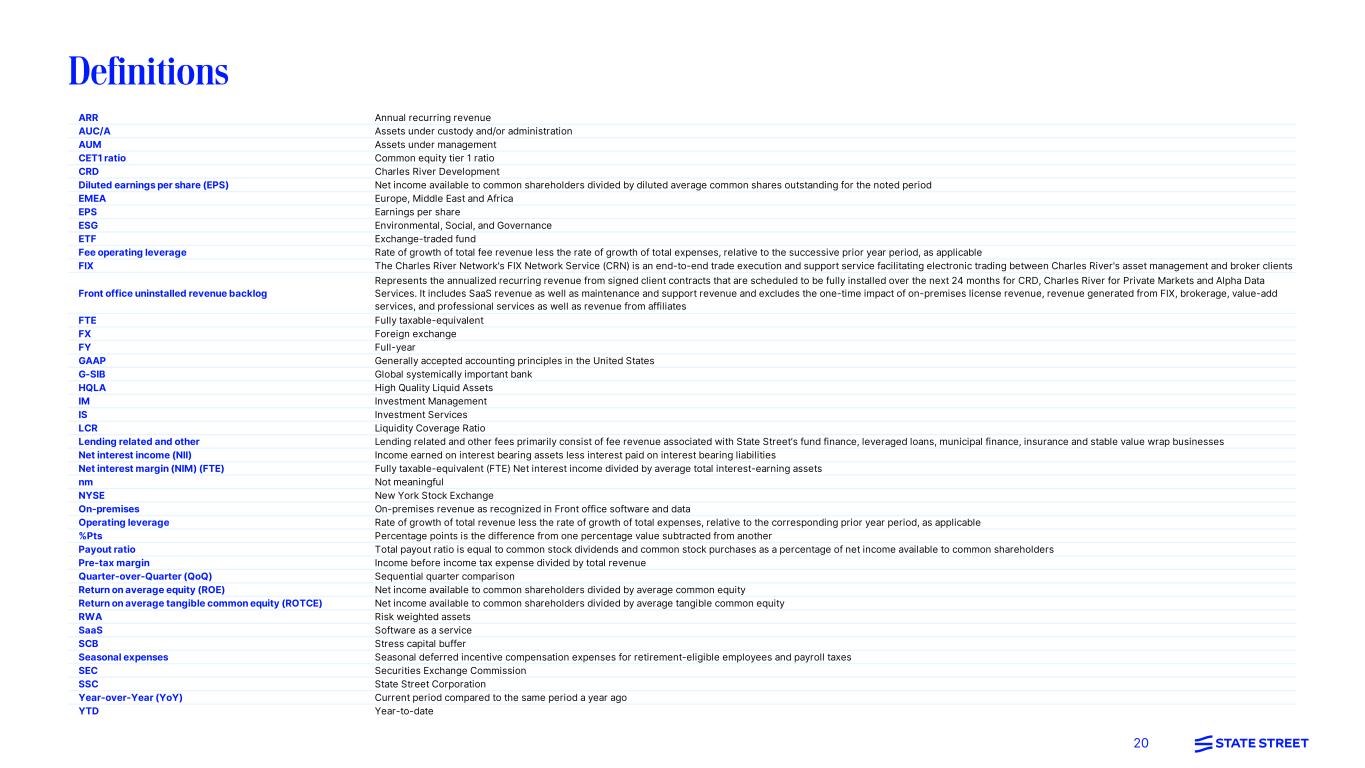 20 ARR Annual recurring revenue AUC/A Assets under custody and/or administration AUM Assets under management CET1 ratio Common equity tier 1 ratio CRD Charles River Development Diluted earnings per share (EPS) Net income available to common shareholders divided by diluted average common shares outstanding for the noted period EMEA Europe, Middle East and Africa EPS Earnings per share ESG Environmental, Social, and Governance ETF Exchange-traded fund Fee operating leverage Rate of growth of total fee revenue less the rate of growth of total expenses, relative to the successive prior year period, as applicable FIX The Charles River Network's FIX Network Service (CRN) is an end-to-end trade execution and support service facilitating electronic trading between Charles River's asset management and broker clients Front office uninstalled revenue backlog Represents the annualized recurring revenue from signed client contracts that are scheduled to be fully installed over the next 24 months for CRD, Charles River for Private Markets and Alpha Data Services. It includes SaaS revenue as well as maintenance and support revenue and excludes the one-time impact of on-premises license revenue, revenue generated from FIX, brokerage, value-add services, and professional services as well as revenue from affiliates FTE Fully taxable-equivalent FX Foreign exchange FY Full-year GAAP Generally accepted accounting principles in the United States G-SIB Global systemically important bank HQLA High Quality Liquid Assets IM Investment Management IS Investment Services LCR Liquidity Coverage Ratio Lending related and other Lending related and other fees primarily consist of fee revenue associated with State Street’s fund finance, leveraged loans, municipal finance, insurance and stable value wrap businesses Net interest income (NII) Income earned on interest bearing assets less interest paid on interest bearing liabilities Net interest margin (NIM) (FTE) Fully taxable-equivalent (FTE) Net interest income divided by average total interest-earning assets nm Not meaningful NYSE New York Stock Exchange On-premises On-premises revenue as recognized in Front office software and data Operating leverage Rate of growth of total revenue less the rate of growth of total expenses, relative to the corresponding prior year period, as applicable %Pts Percentage points is the difference from one percentage value subtracted from another Payout ratio Total payout ratio is equal to common stock dividends and common stock purchases as a percentage of net income available to common shareholders Pre-tax margin Income before income tax expense divided by total revenue Quarter-over-Quarter (QoQ) Sequential quarter comparison Return on average equity (ROE) Net income available to common shareholders divided by average common equity Return on average tangible common equity (ROTCE) Net income available to common shareholders divided by average tangible common equity RWA Risk weighted assets SaaS Software as a service SCB Stress capital buffer Seasonal expenses Seasonal deferred incentive compensation expenses for retirement-eligible employees and payroll taxes SEC Securities Exchange Commission SSC State Street Corporation Year-over-Year (YoY) Current period compared to the same period a year ago YTD Year-to-date