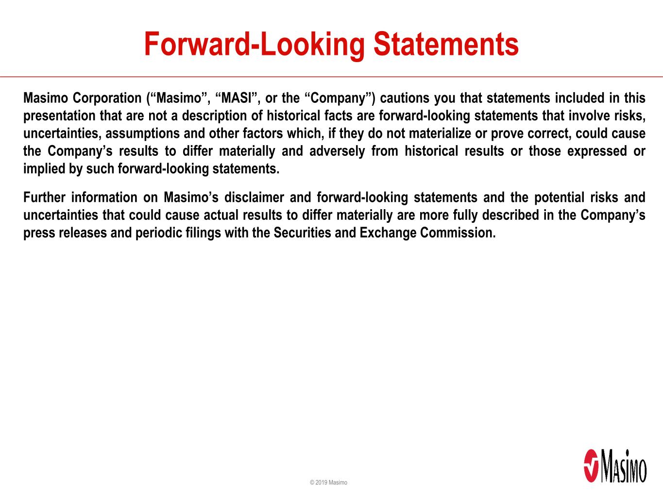 © 2019 Masimo Forward-Looking Statements Masimo Corporation (“Masimo”, “MASI”, or the “Company”) cautions you that statements included in this presentation that are not a description of historical facts are forward-looking statements that involve risks, uncertainties, assumptions and other factors which, if they do not materialize or prove correct, could cause the Company’s results to differ materially and adversely from historical results or those expressed or implied by such forward-looking statements. Further information on Masimo’s disclaimer and forward-looking statements and the potential risks and uncertainties that could cause actual results to differ materially are more fully described in the Company’s press releases and periodic filings with the Securities and Exchange Commission.