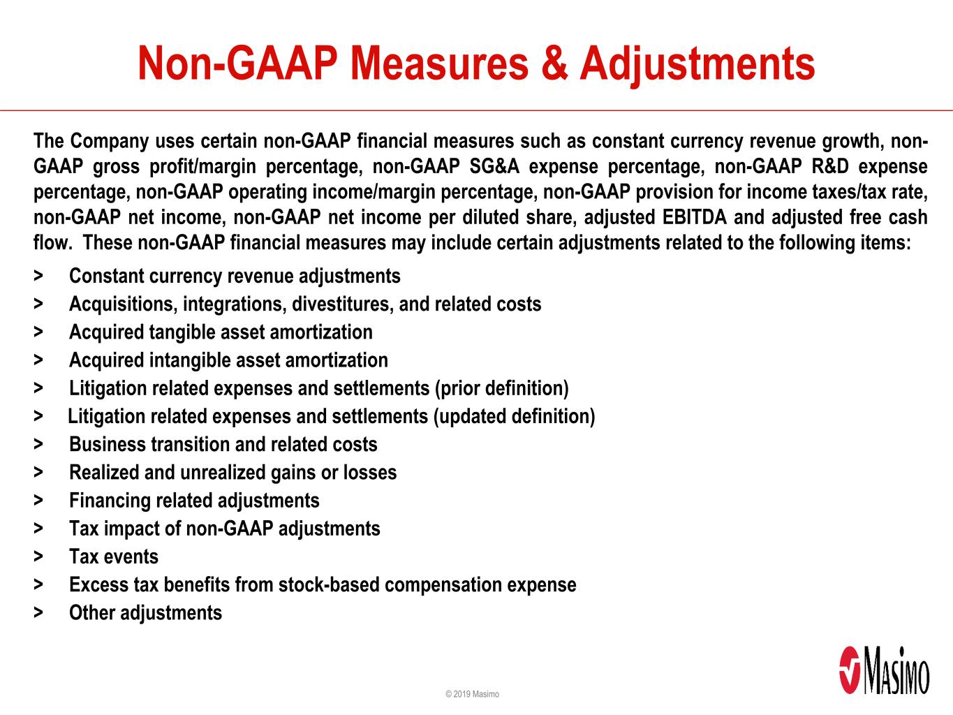 © 2019 Masimo The Company uses certain non-GAAP financial measures such as constant currency revenue growth, non- GAAP gross profit/margin percentage, non-GAAP SG&A expense percentage, non-GAAP R&D expense percentage, non-GAAP operating income/margin percentage, non-GAAP provision for income taxes/tax rate, non-GAAP net income, non-GAAP net income per diluted share, adjusted EBITDA and adjusted free cash flow. These non-GAAP financial measures may include certain adjustments related to the following items: > Constant currency revenue adjustments > Acquisitions, integrations, divestitures, and related costs > Acquired tangible asset amortization > Acquired intangible asset amortization > Litigation related expenses and settlements (prior definition) > Litigation related expenses and settlements (updated definition) > Business transition and related costs > Realized and unrealized gains or losses > Financing related adjustments > Tax impact of non-GAAP adjustments > Tax events > Excess tax benefits from stock-based compensation expense > Other adjustments Non-GAAP Measures & Adjustments